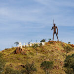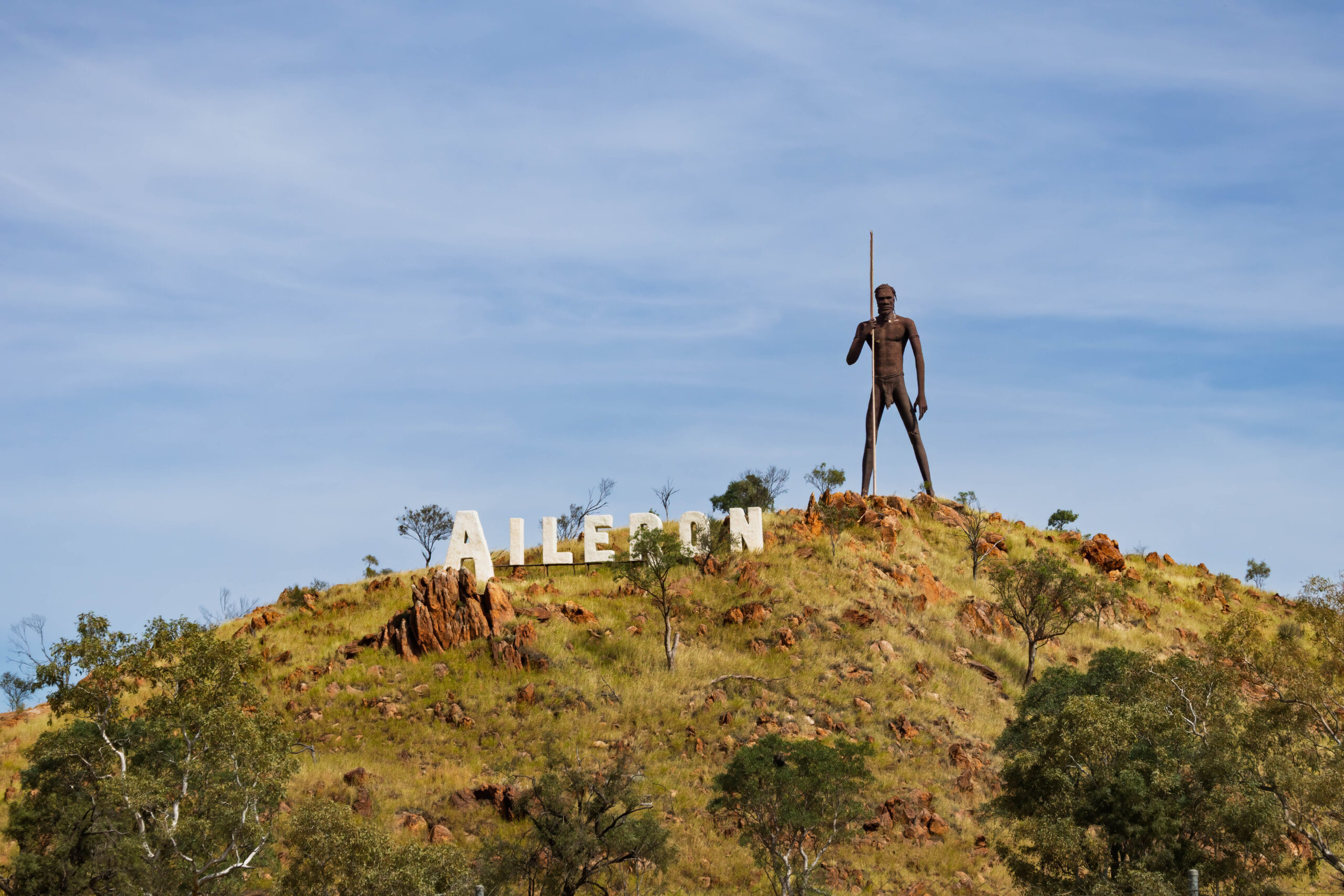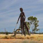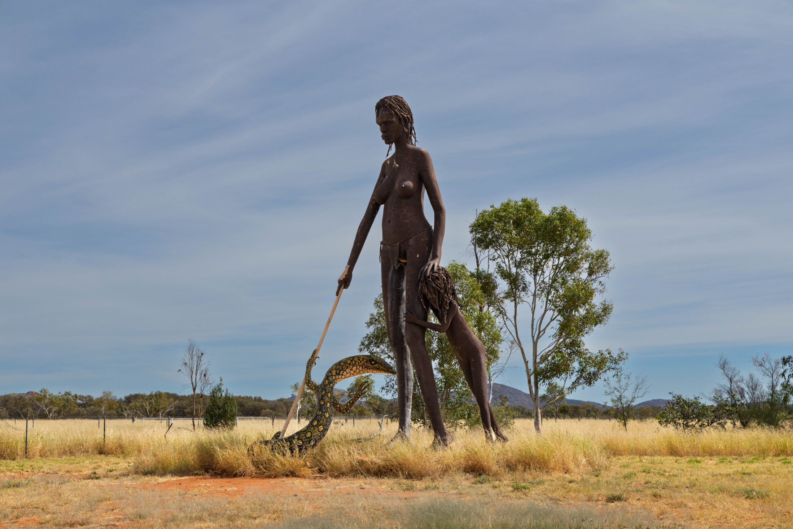 Our next stop was at the Aileron Roadhouse which is currently closed for renovations but campsites and rooms are still available. Having read that it is known for its giant sculptures of an Aboriginal man and woman, we pulled in to look at these. The Aboriginal man stands on a small hill and was easy to spot but not easy to photograph. We had to wander into the camping ground to be able to see it properly. Despite Aileron appearing rather deserted, the camp sites were being watered and it seemed basic but well kept. We couldn’t spot the Aboriginal woman until we were heading back to the highway and we spotted that giant statue near the Aboriginal Art Gallery. The woman was sculpted along with a large monitor lizard and a child.