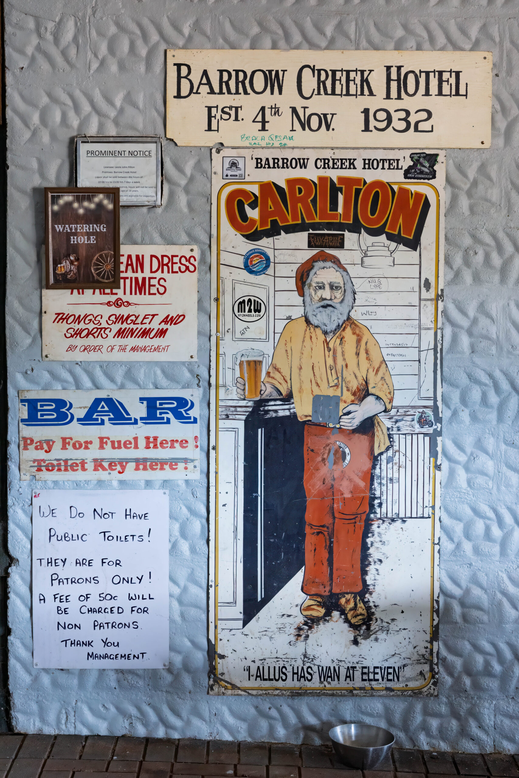 Eighty kilometres further north, our next stop was at the Barrow Creek Telegraph Station which was established in 1872 as another of the relay stations on the Overland Telegraph line. Although the buildings have undergone some restorations, it is not as well preserved as the telegraph station in Alice Springs, but remains one of four original telegraph stations still standing. We popped next door to the Barrow Creek Hotel and purchased (soft) drinks. It was a quiet day in Barrow Creek so we were able to chat with the lady at the bar while we drank our cool drinks. Hailing from Townsville, she has called Central Australia home for a few years now.