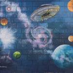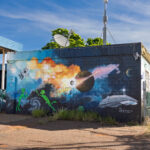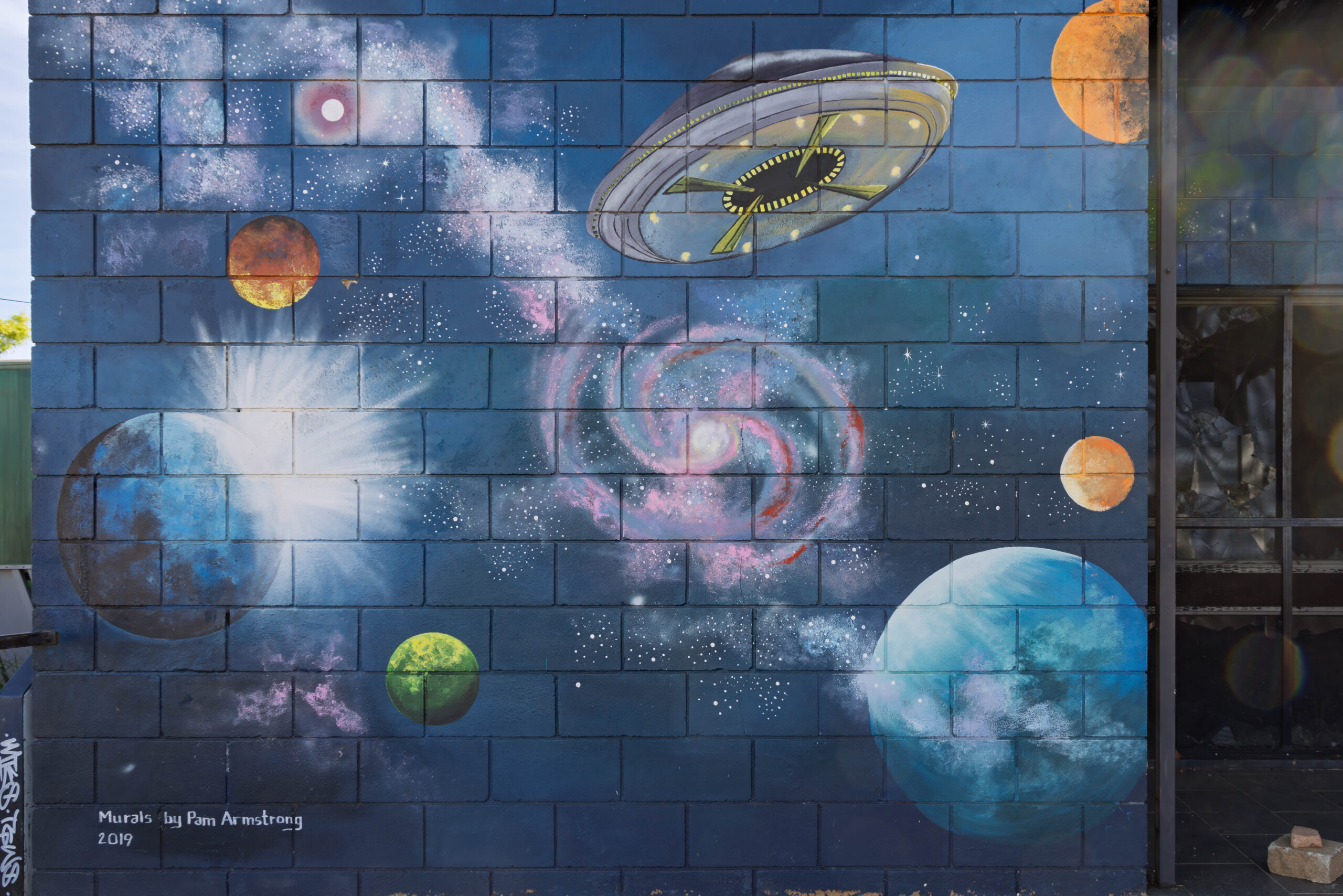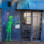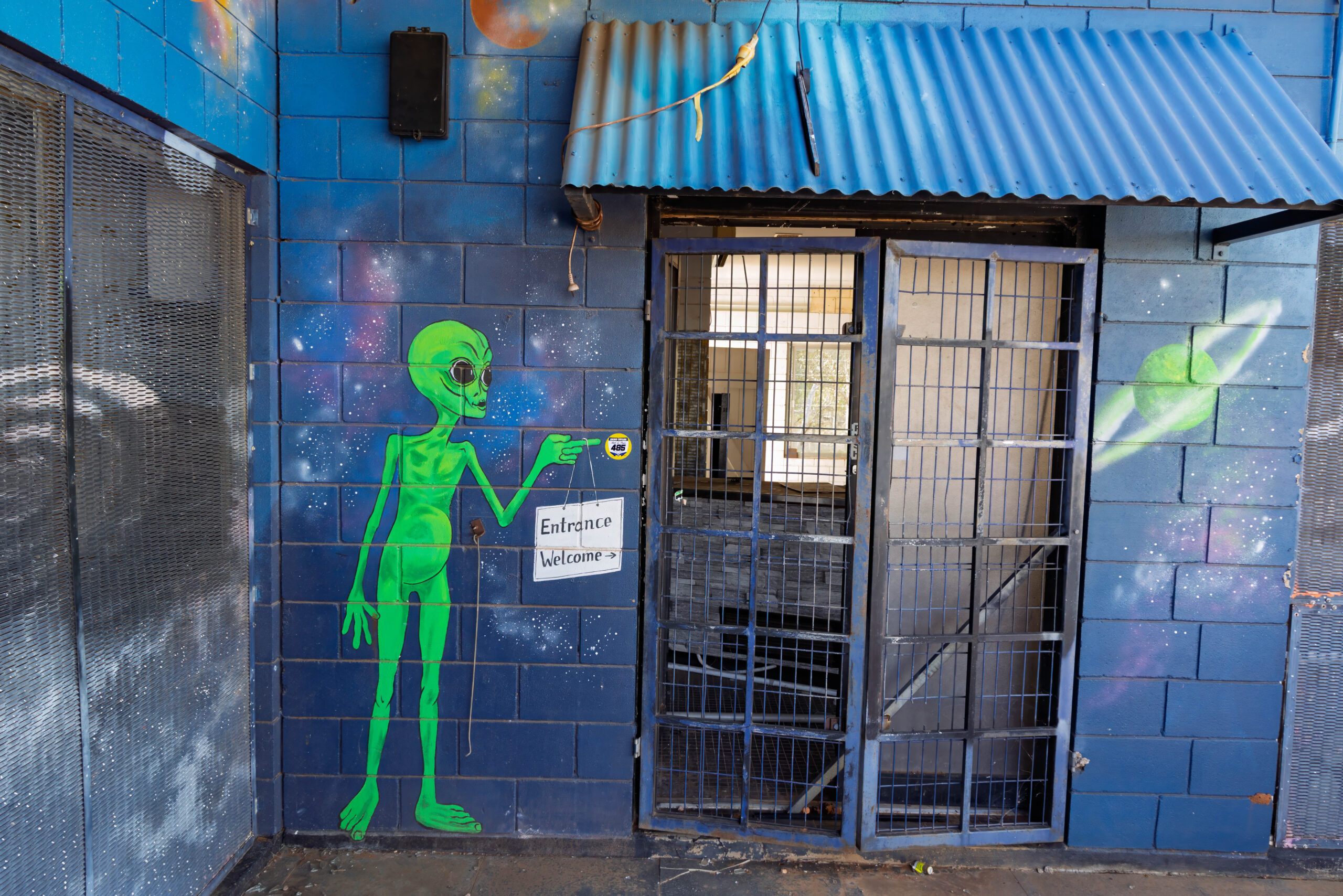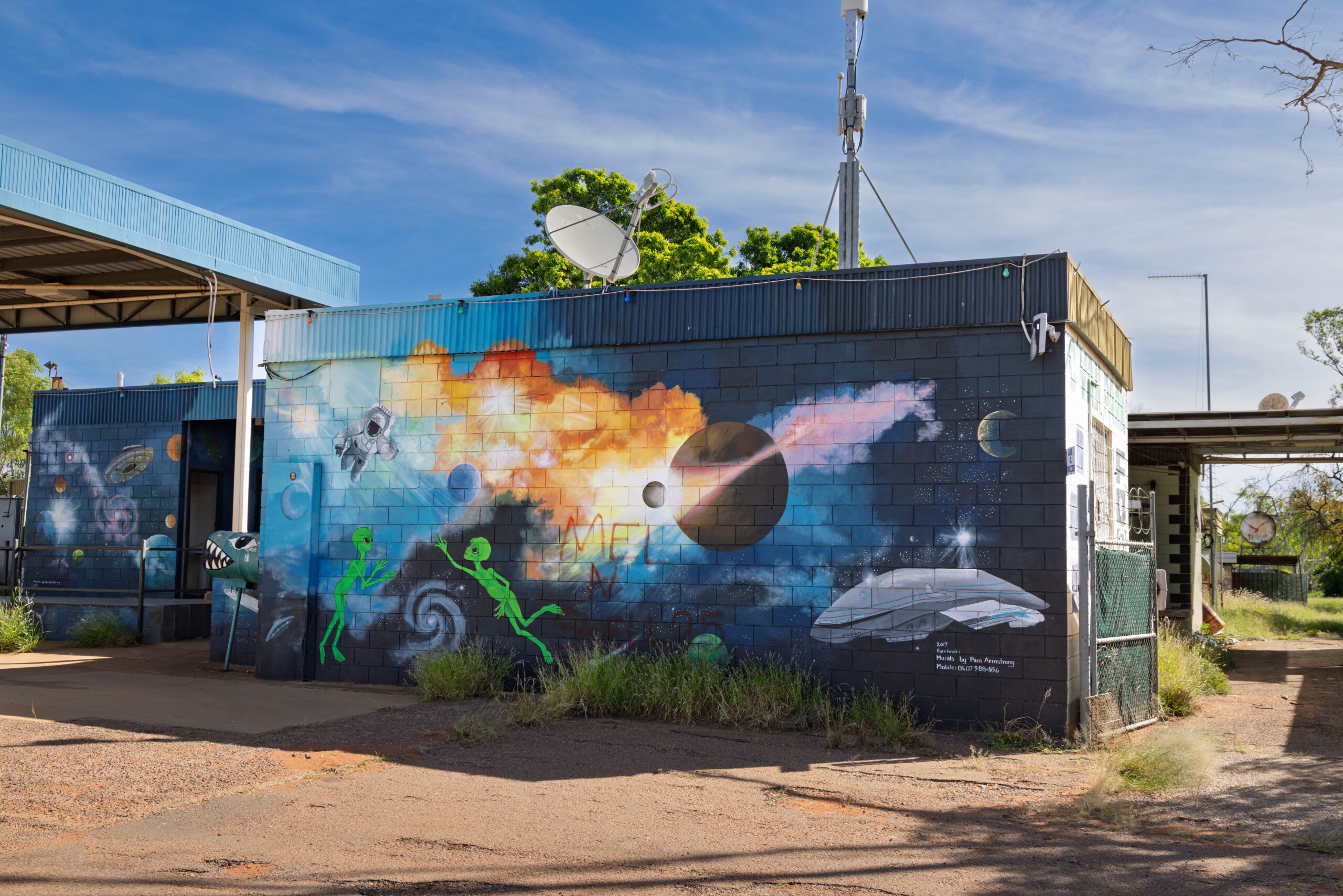 We made a brief stop at the burnt out Wycliffe Well Roadhouse which, before the fire, used to house a UFO Centre because this area around Thring Swamp is allegedly a hotbed of extraterrestrial activity. The alien-themed murals on the external walls are still visible despite the fire, but are fading in the harsh desert environment.