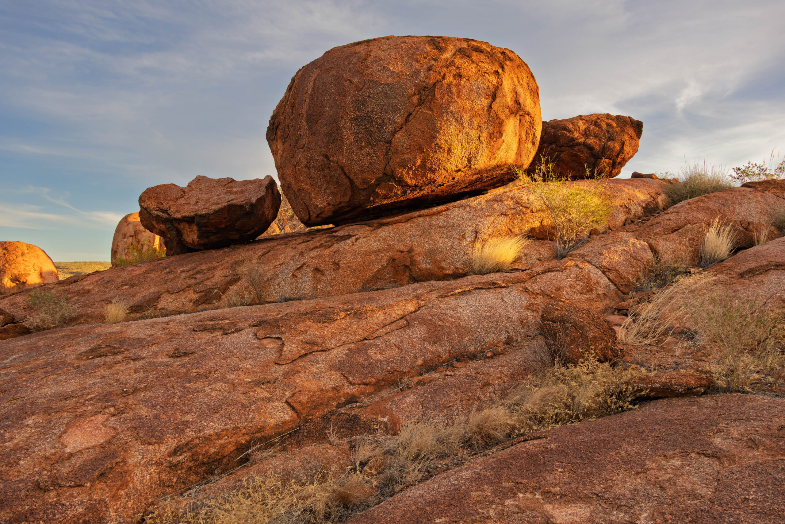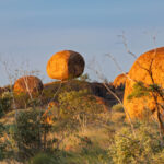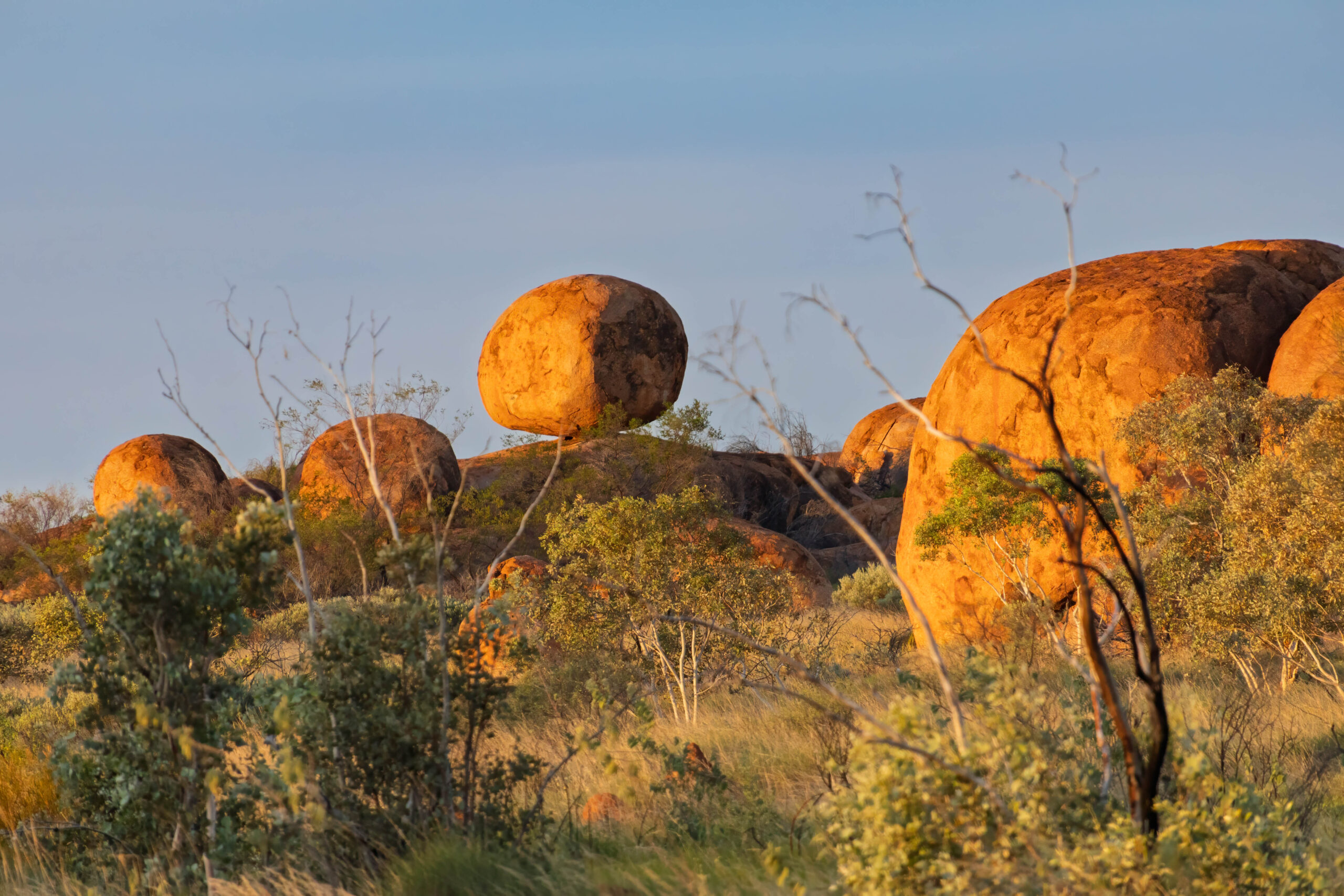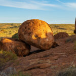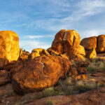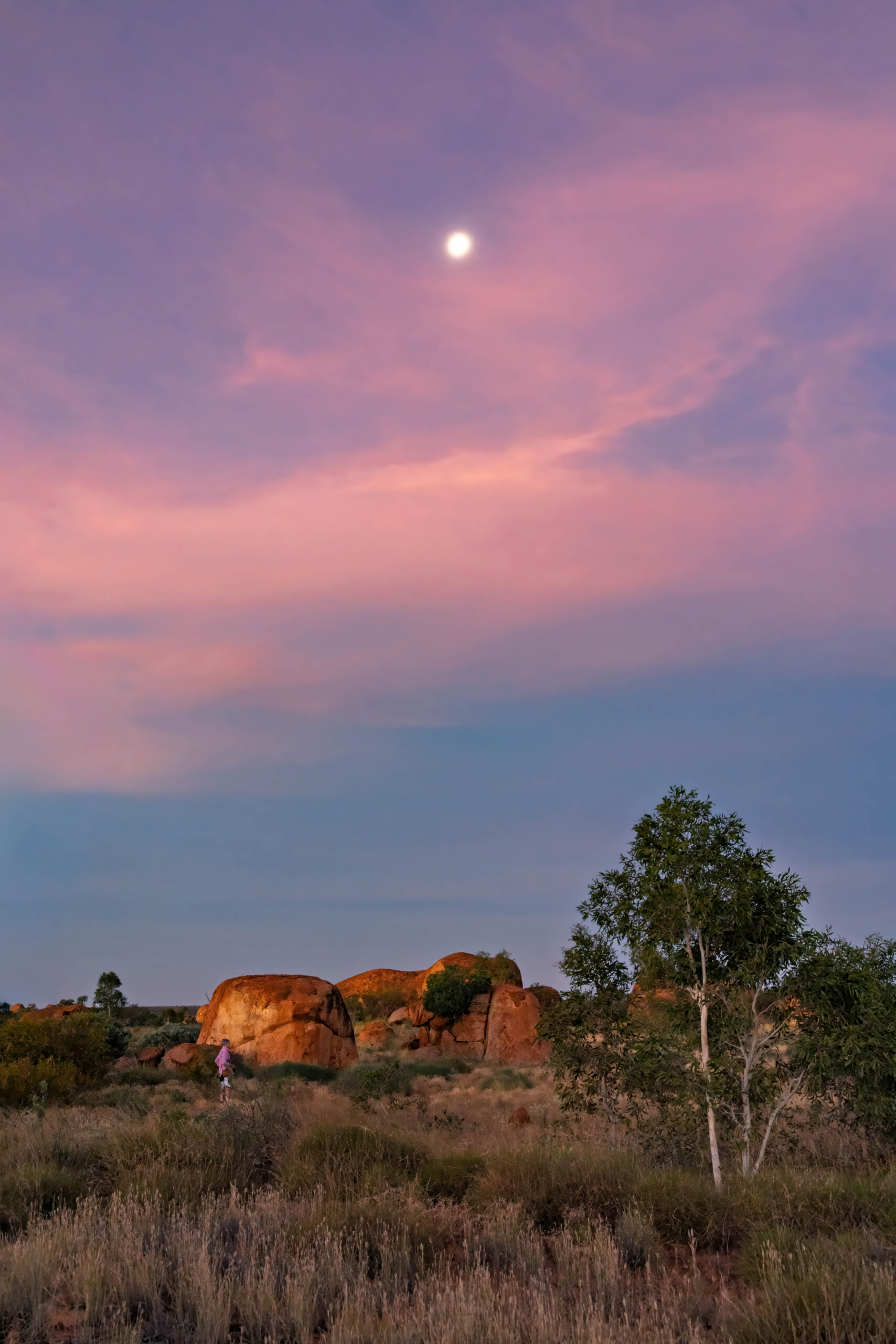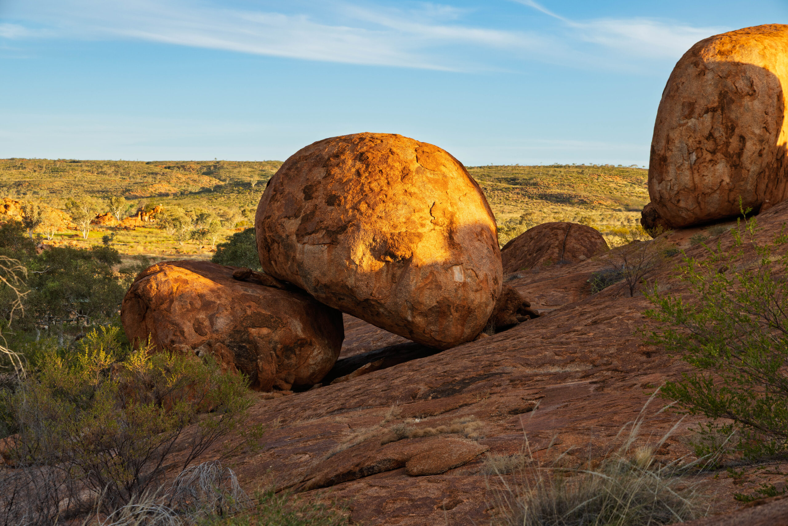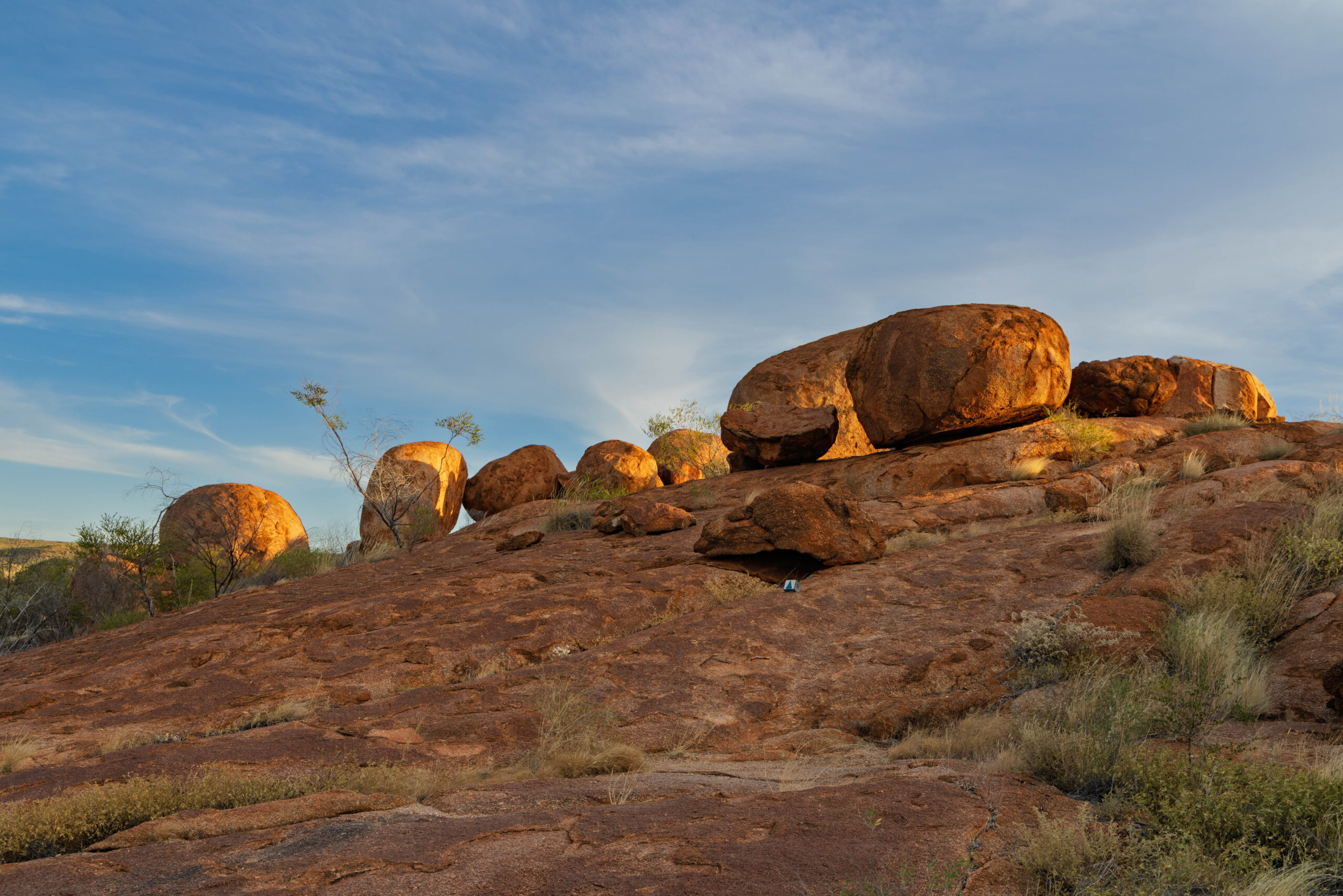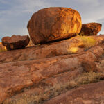 Around 5.00pm we drove out to Karlu Karlu (Devils Marbles) to make the most of the late afternoon light and the reflection of the setting sun on the ‘marbles’. The site was much larger than we had expected, with several hectares covered in scattered, stacked and balancing granite boulders, that are remnants from a solid mass of granite, the bulk of which still lies underneath them. When we arrived we had the site to ourselves, although more people arrived as sunset drew closer. As we wandered down from the Nyanjiki Lookout, we encountered three people heading up with their pizzas and pillows, to settle in for the sunset. Rather than watching the sun sink below the horizon from the lookout, we were more interested in watching the changing light on the marbles.