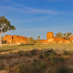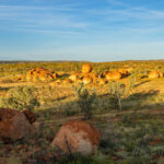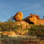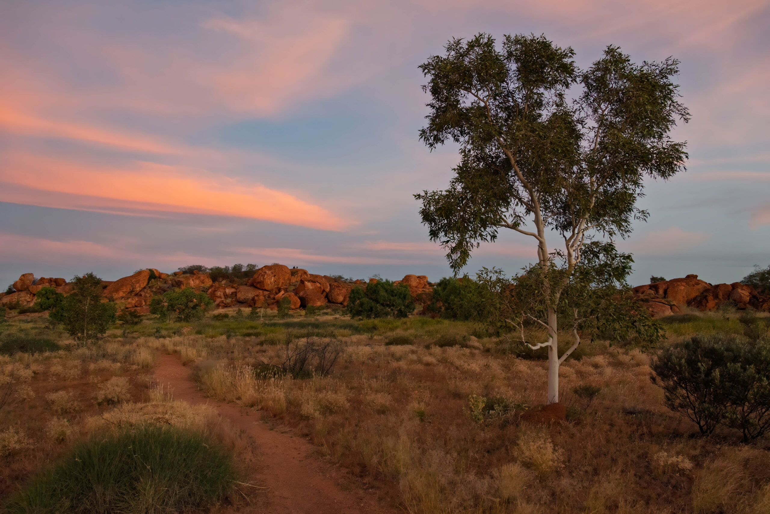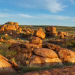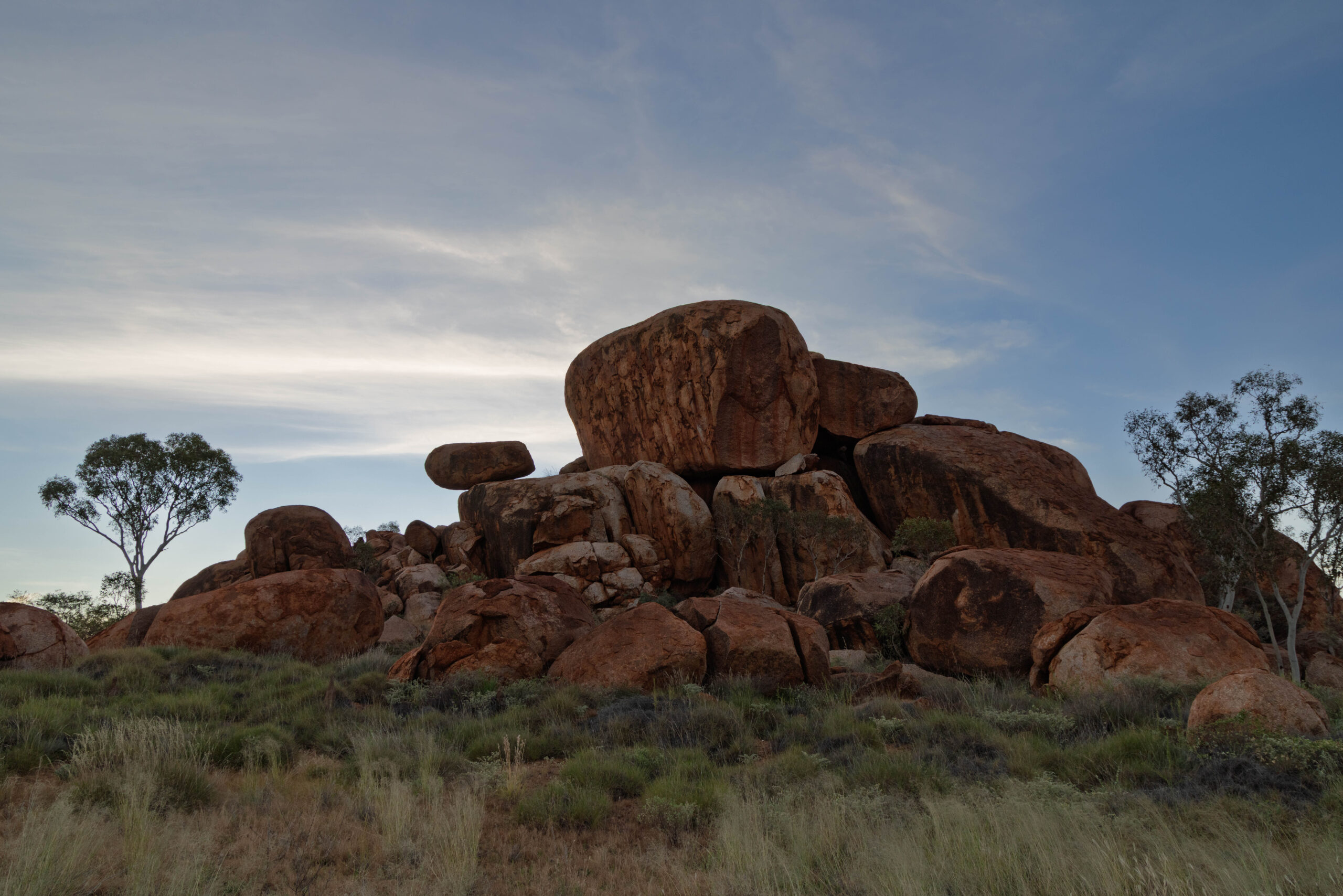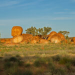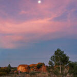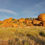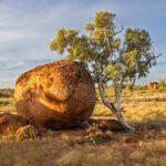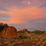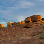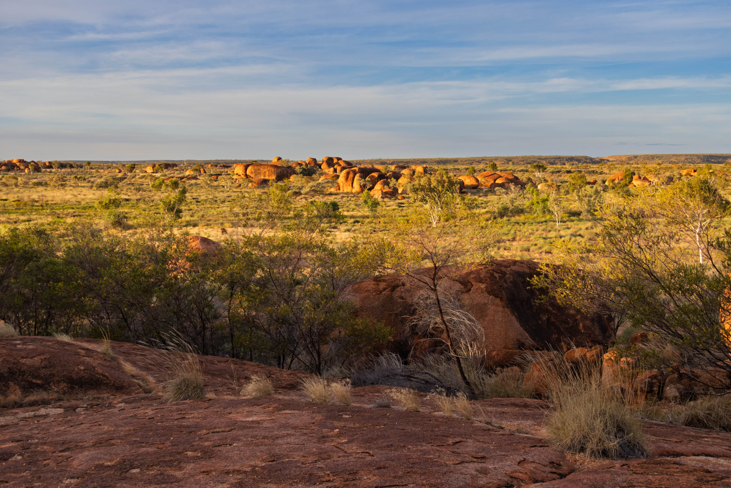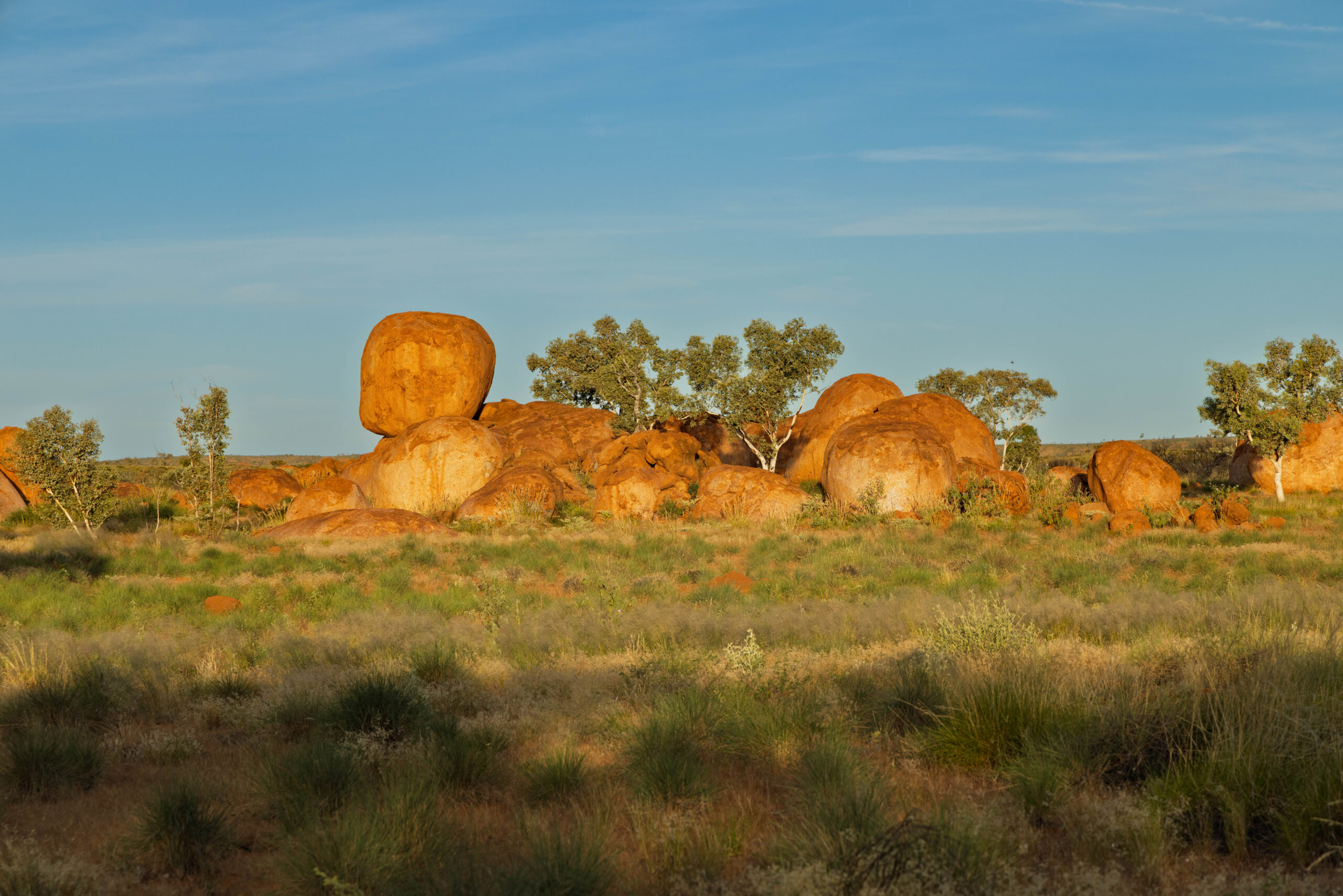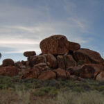 Around 5.00pm we drove out to Karlu Karlu (Devils Marbles) to make the most of the late afternoon light and the reflection of the setting sun on the ‘marbles’. The site was much larger than we had expected, with several hectares covered in scattered, stacked and balancing granite boulders, that are remnants from a solid mass of granite, the bulk of which still lies underneath them. When we arrived we had the site to ourselves, although more people arrived as sunset drew closer. As we wandered down from the Nyanjiki Lookout, we encountered three people heading up with their pizzas and pillows, to settle in for the sunset. Rather than watching the sun sink below the horizon from the lookout, we were more interested in watching the changing light on the marbles.