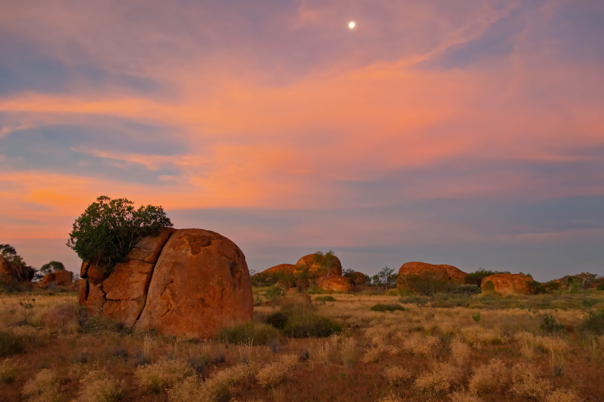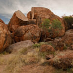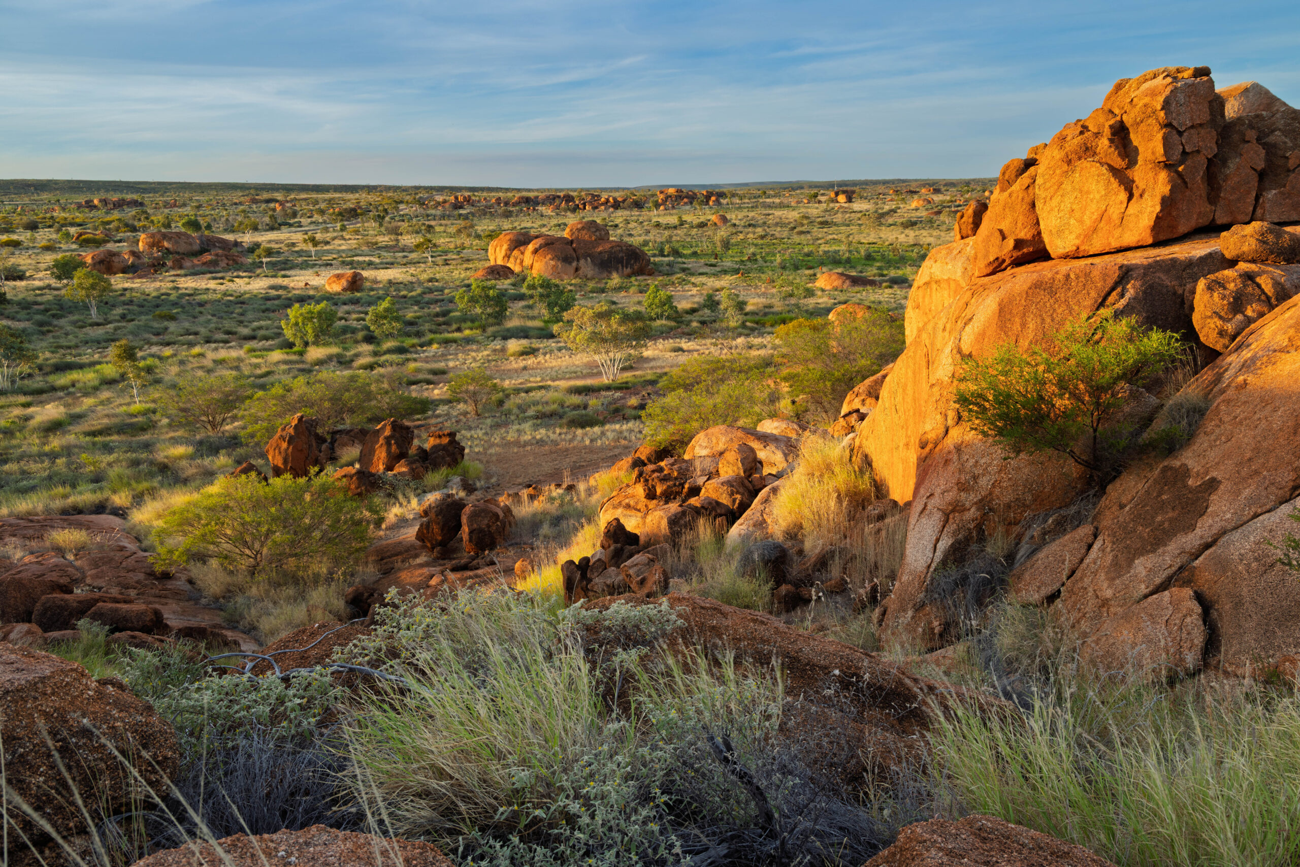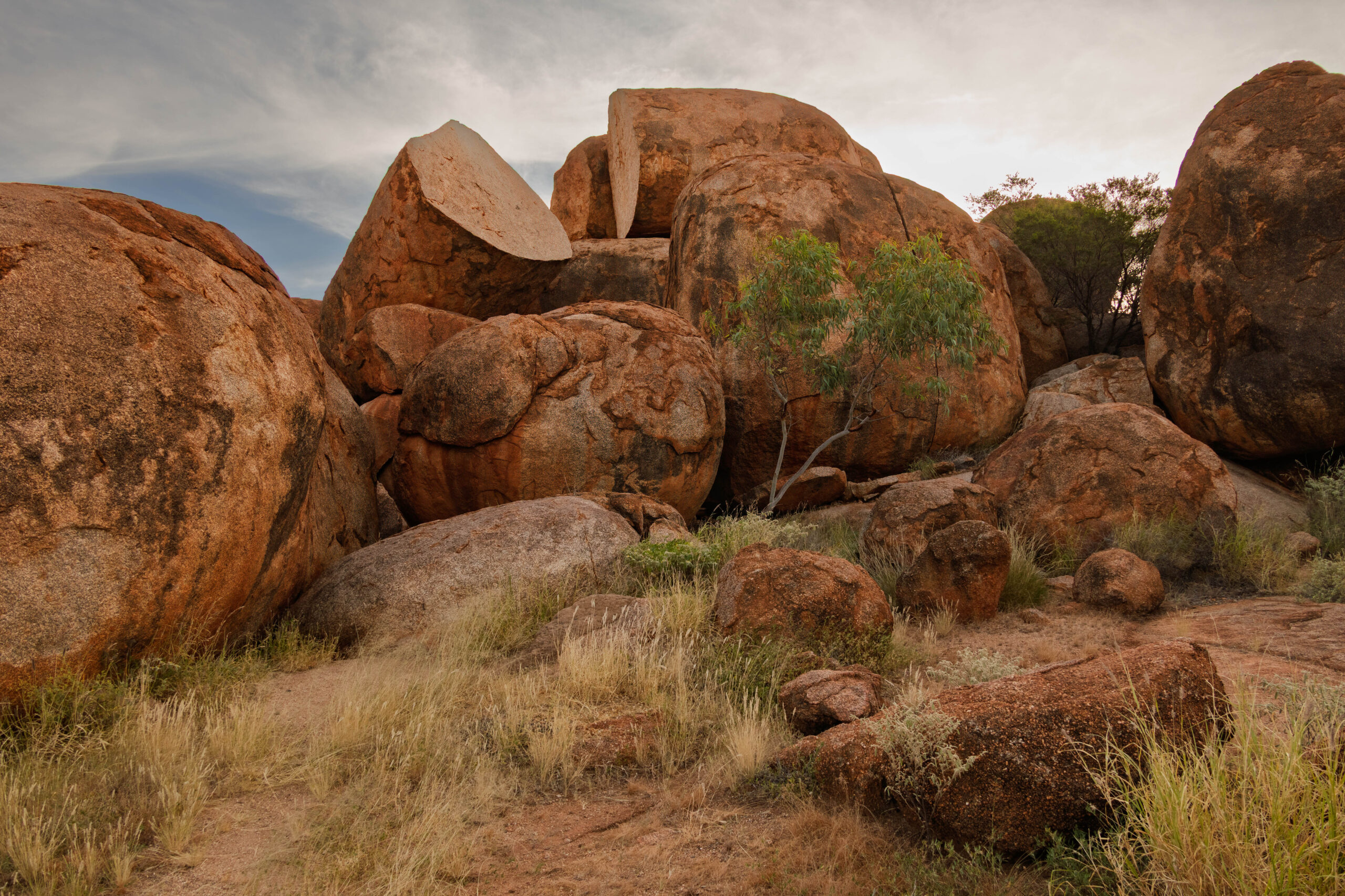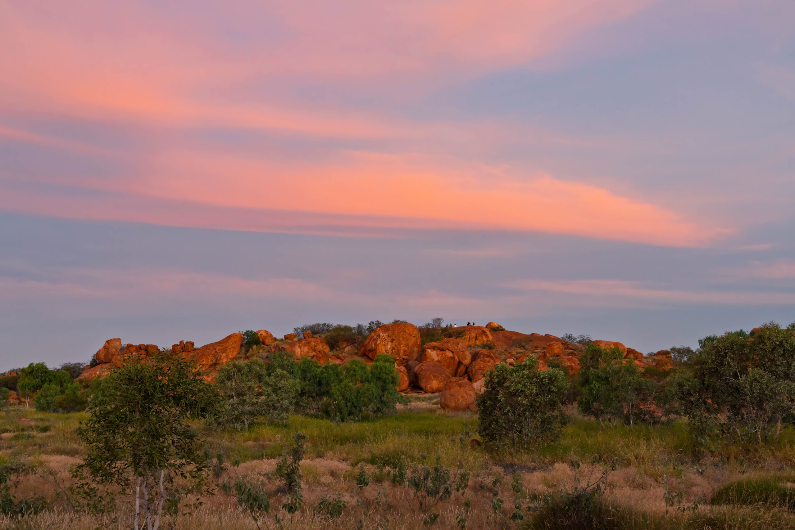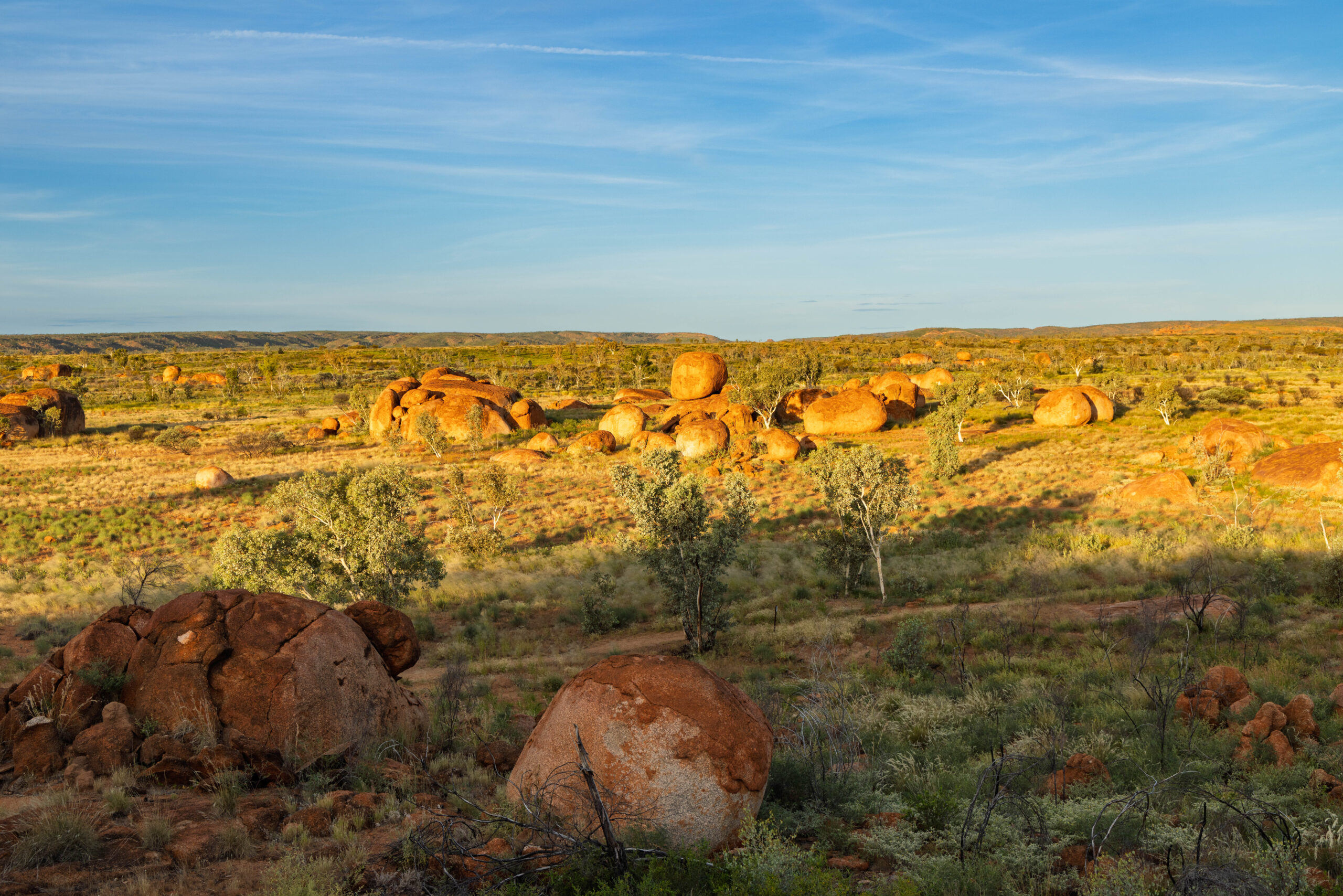 Around 5.00pm we drove out to Karlu Karlu (Devils Marbles) to make the most of the late afternoon light and the reflection of the setting sun on the ‘marbles’. The site was much larger than we had expected, with several hectares covered in scattered, stacked and balancing granite boulders, that are remnants from a solid mass of granite, the bulk of which still lies underneath them. When we arrived we had the site to ourselves, although more people arrived as sunset drew closer. As we wandered down from the Nyanjiki Lookout, we encountered three people heading up with their pizzas and pillows, to settle in for the sunset. Rather than watching the sun sink below the horizon from the lookout, we were more interested in watching the changing light on the marbles.