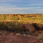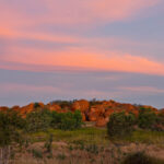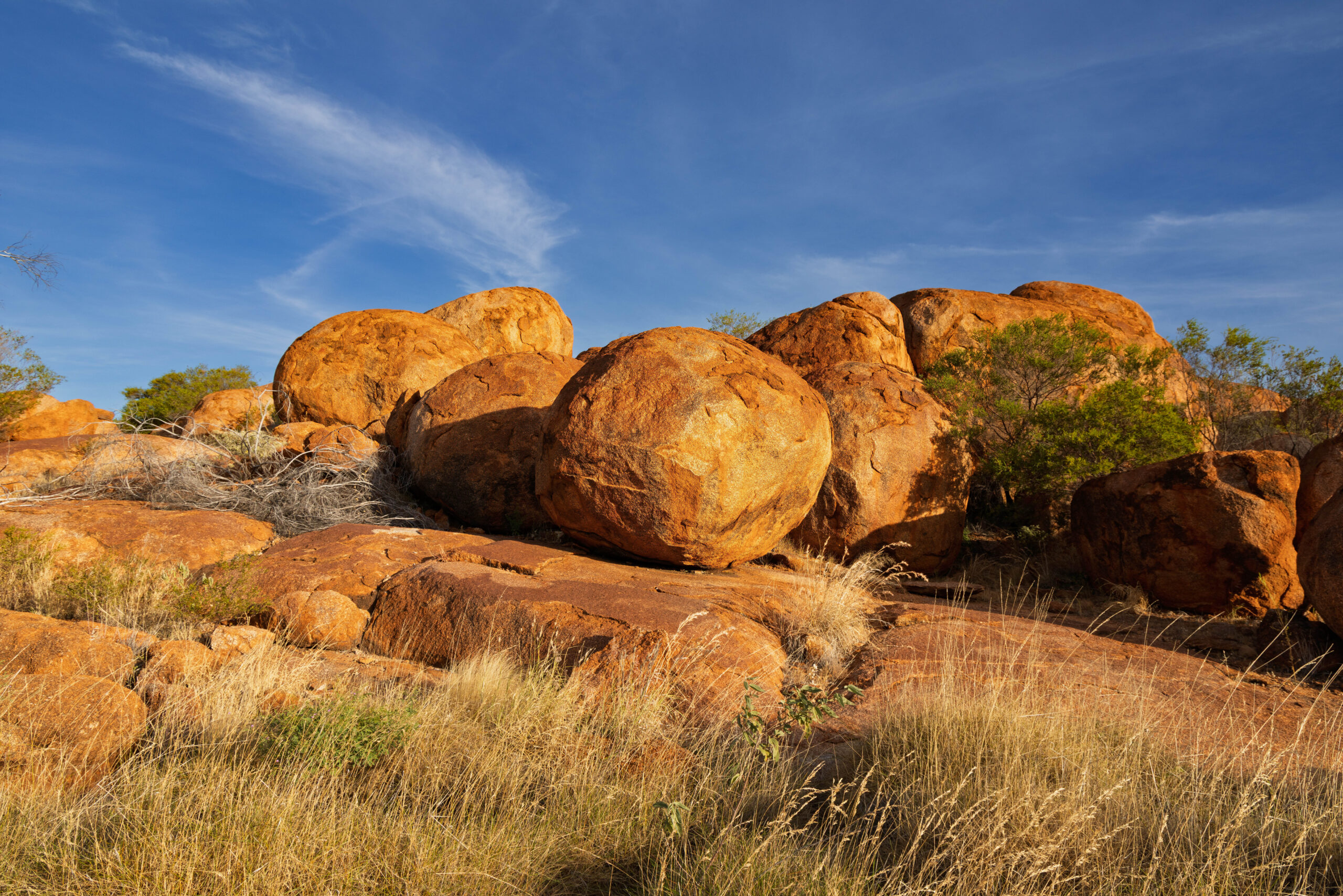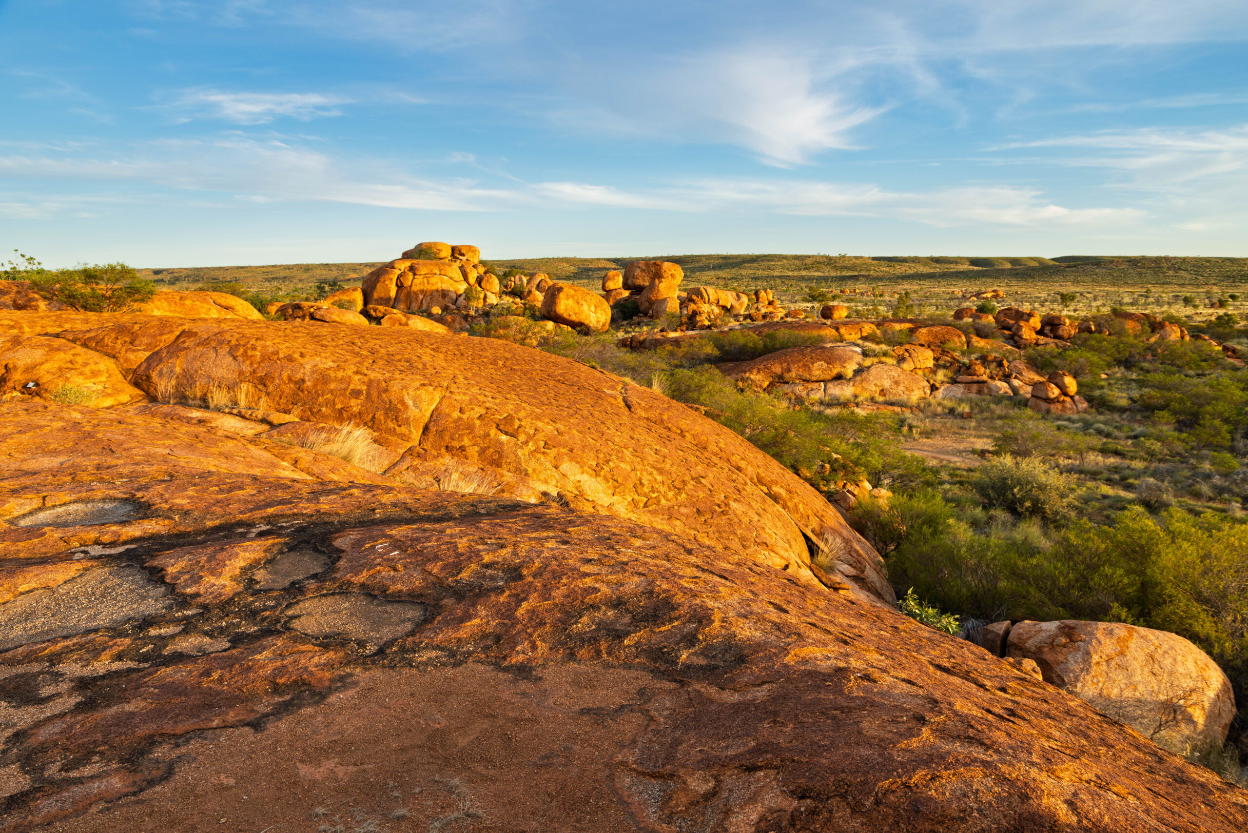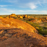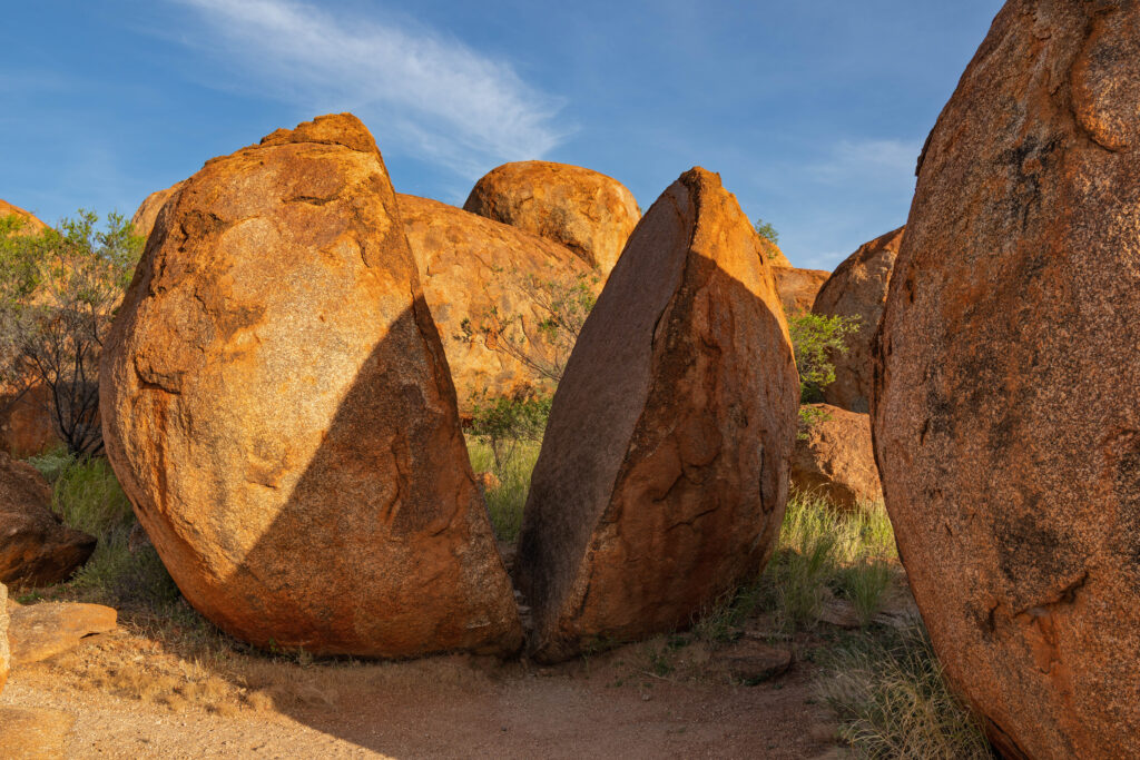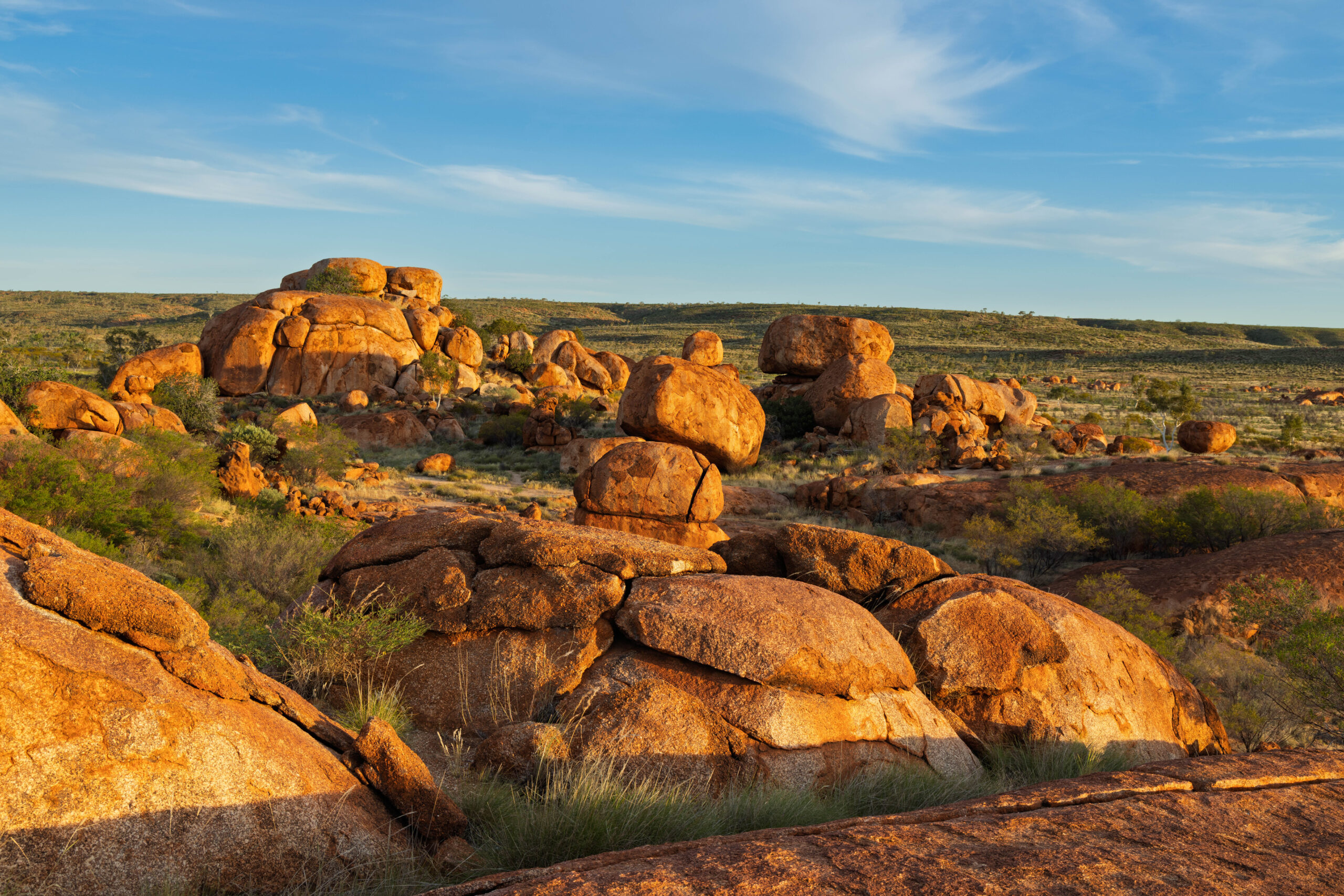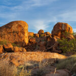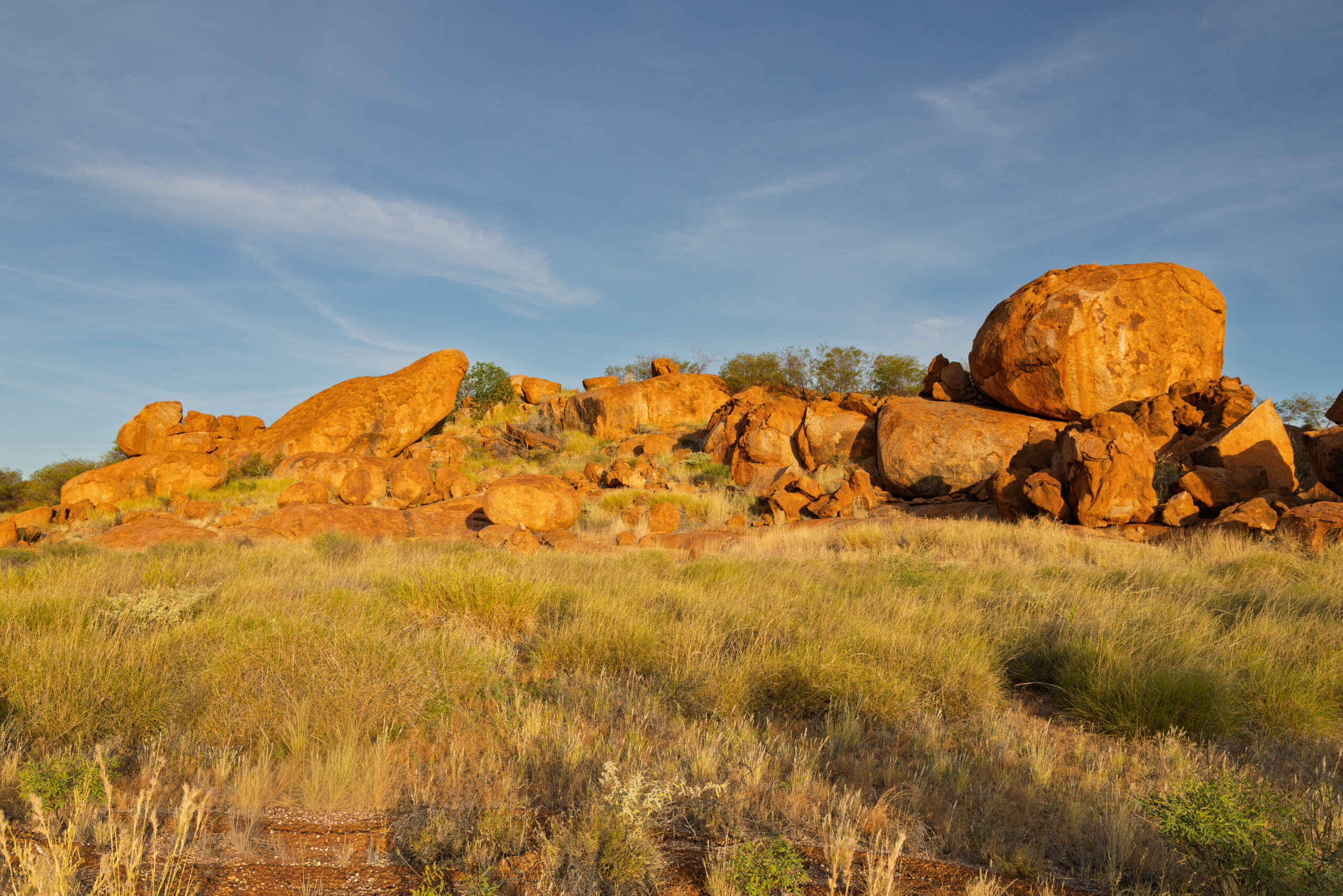 Around 5.00pm we drove out to Karlu Karlu (Devils Marbles) to make the most of the late afternoon light and the reflection of the setting sun on the ‘marbles’. The site was much larger than we had expected, with several hectares covered in scattered, stacked and balancing granite boulders, that are remnants from a solid mass of granite, the bulk of which still lies underneath them. When we arrived we had the site to ourselves, although more people arrived as sunset drew closer. As we wandered down from the Nyanjiki Lookout, we encountered three people heading up with their pizzas and pillows, to settle in for the sunset. Rather than watching the sun sink below the horizon from the lookout, we were more interested in watching the changing light on the marbles.