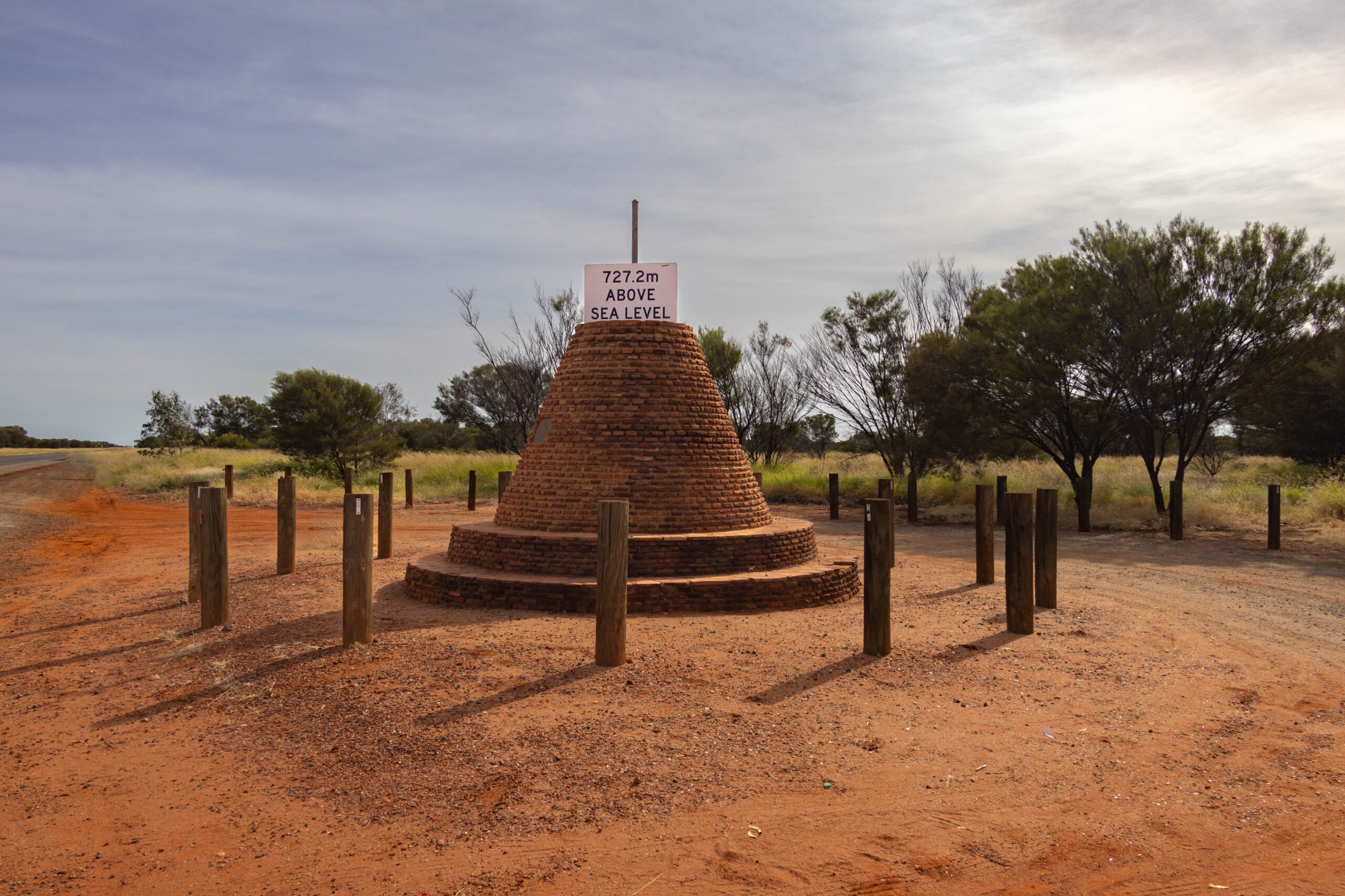 Continuing our journey north, at 20 kilometres out of Alice, we arrived at the Highest Point Cairn. The cairn marks the highest point – 727.2 metres above sea level – on the main route (Stuart Highway) between Adelaide and Darwin, as determined by the Lands and Survey Branch Northern Territory Administration. The cairn, installed in 1962, was designed by Angel Michael Sahariv. Damn, two vehicles towing caravans passed us while we were stopped. The same two rigs that pulled out of the Discovery Park ahead of us this morning. Plenty of long straight stretches of road ahead to pass them on.