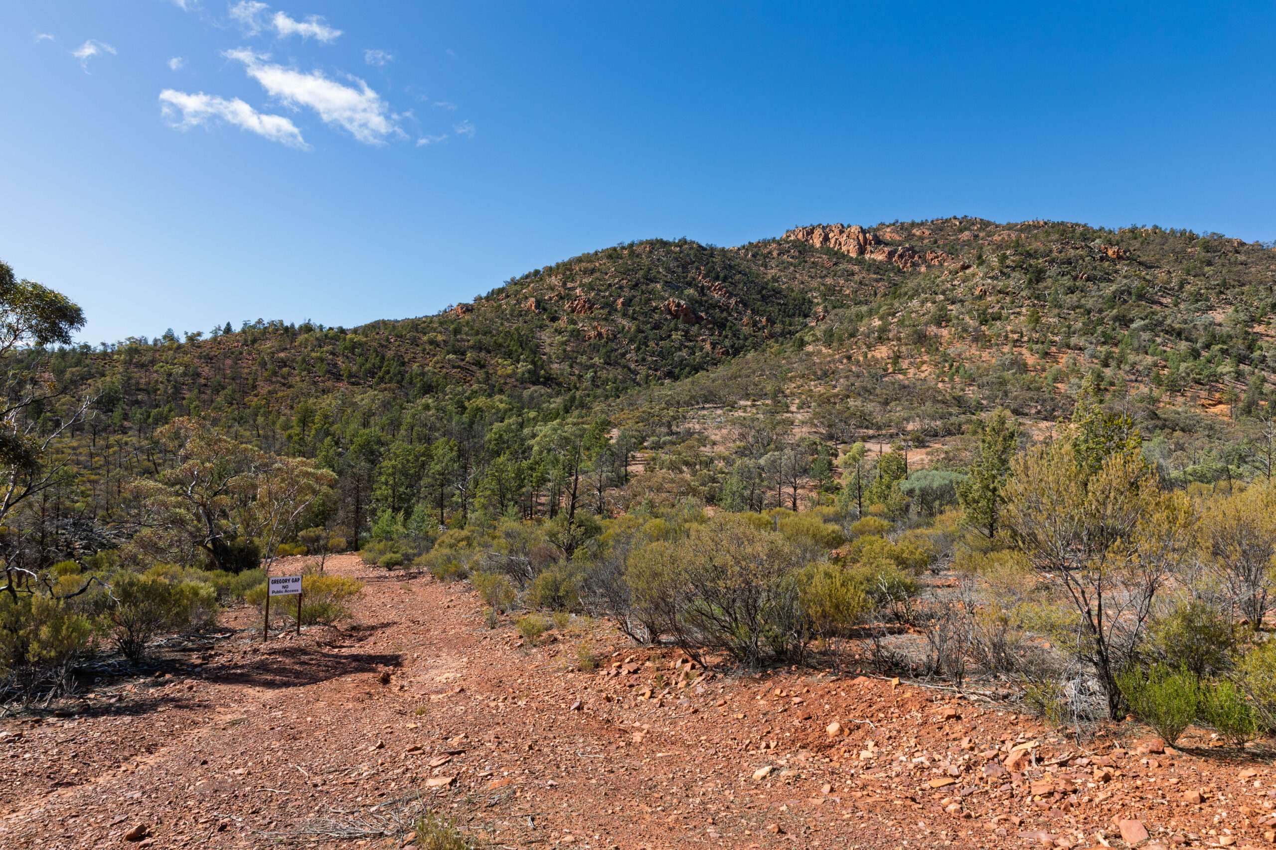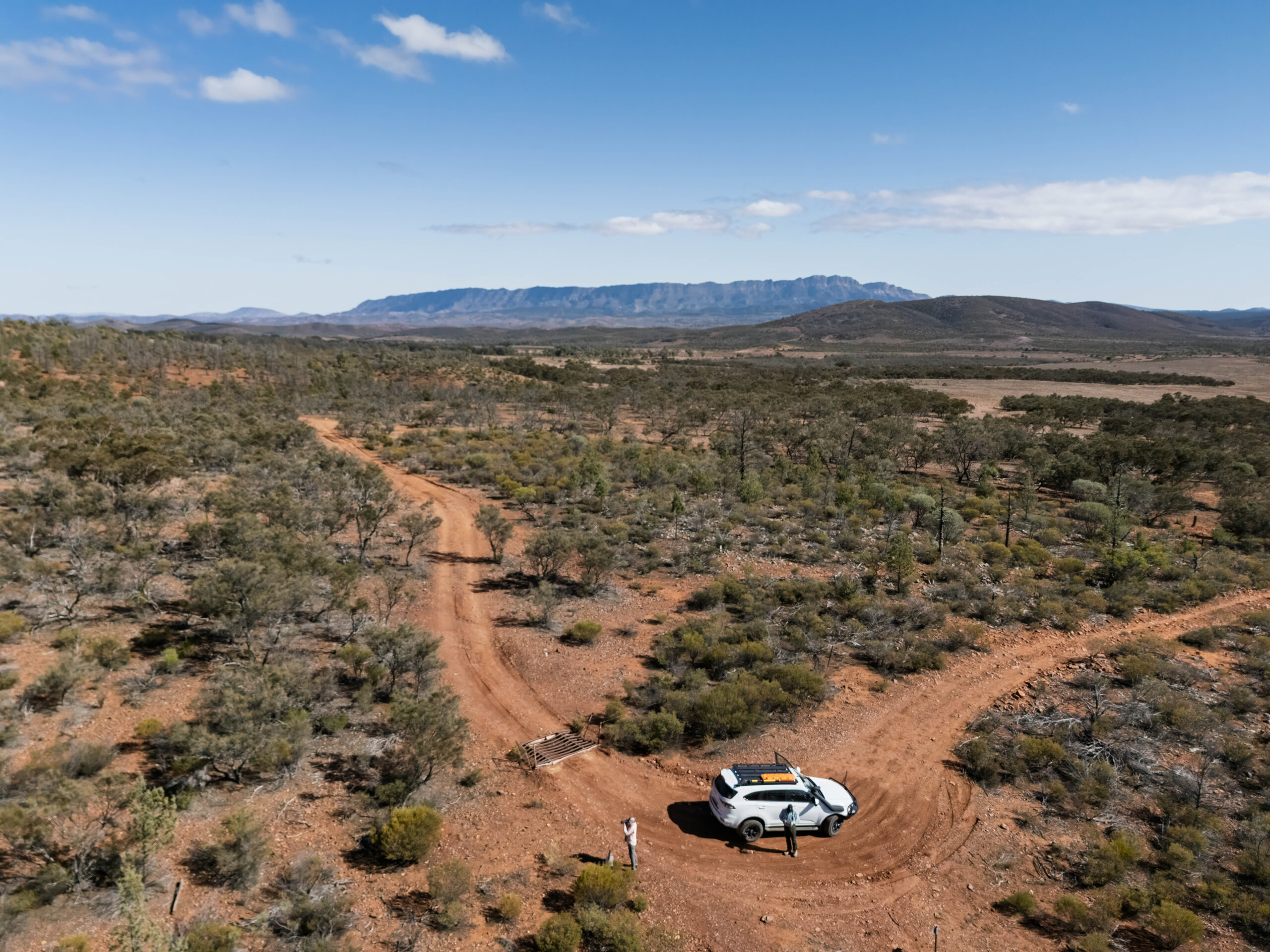 We arrived at Gregory Gap where Bernie put the drone up for its first flight on this holiday and took a few aerial shots of the gap. This gap in the Chace Range was exploited by brothers Ron and Jack Gregory in 1963 when they cleared a track to transport sheep to land they held on the other side of the range.