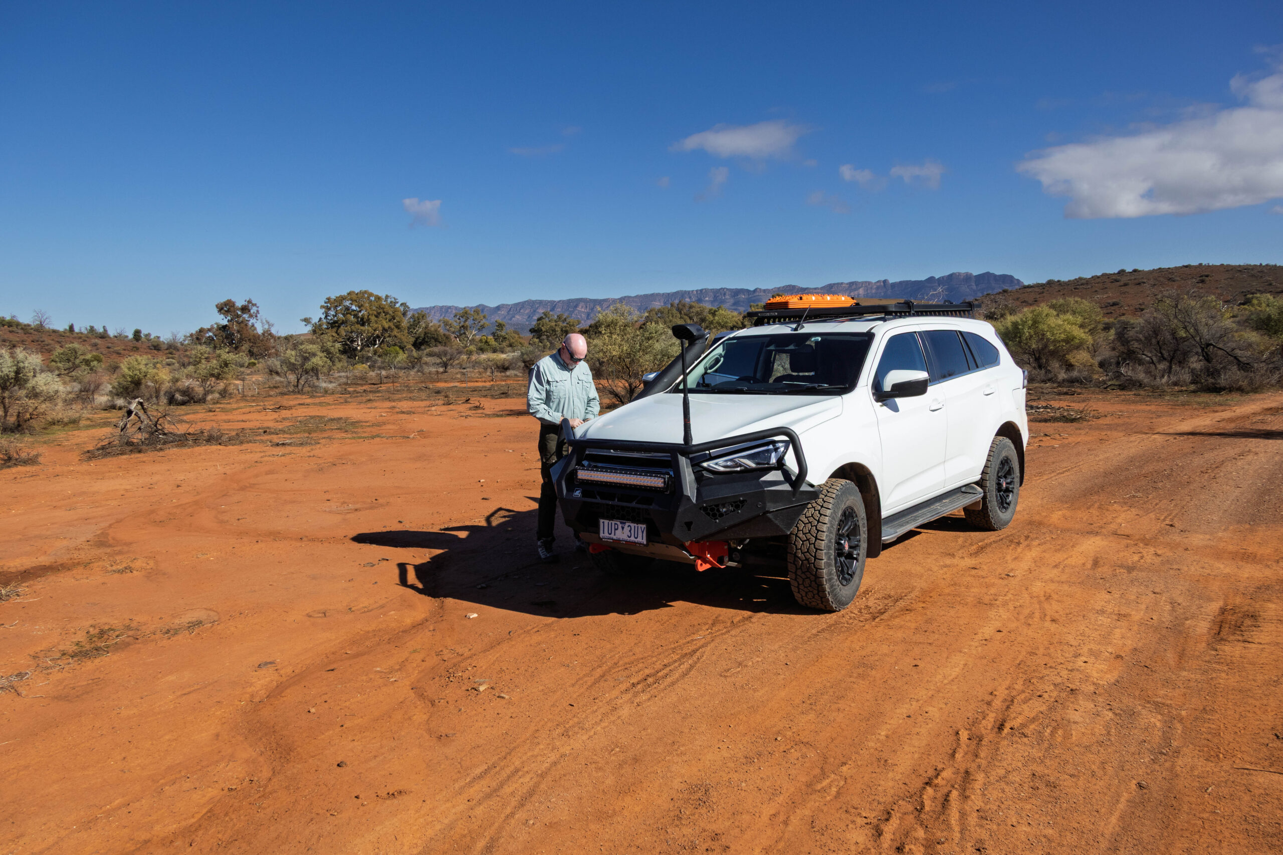 We passed the end of the red track to drive up Pugilist Hill, before commencing the more difficult part of our 4WD. Although the hill is not very high, the 360 degree views were fantastic. From the top we could see the 17 kilometre stretch of Wilpena Pound, Rawnsley Bluff and Red Terrace and the Chace and Elder Ranges. While we were stopped here we decided to make it our lunch break. Bernie put the drone up again to take photos of us having lunch, then he set it to ‘droning’ while we ate. Apparently this is a legitimate function of the drone where it just flies about in a set pattern filming. To me it just seemed like we were eating lunch with blowflies buzzing around, but without the actual blowflies getting in our faces, ha, ha! Oh, and why is it called Pugilist Hill? In the early 1930s two station hands had a fist fight on the top of the hill.