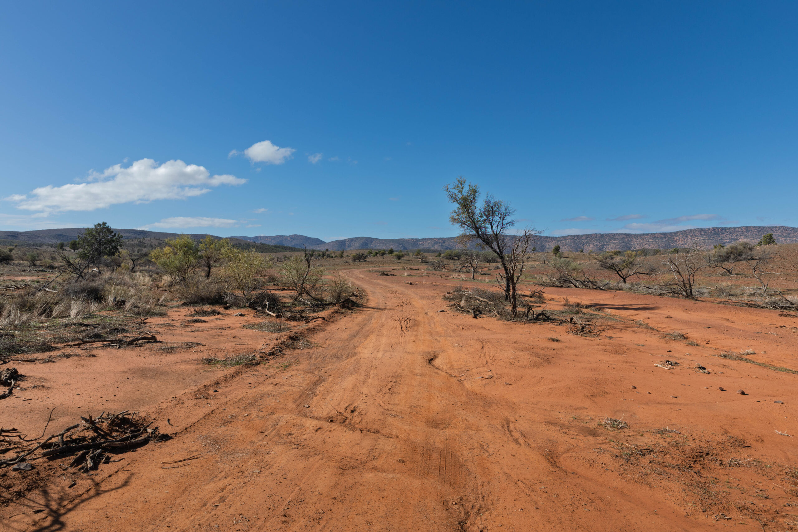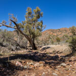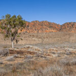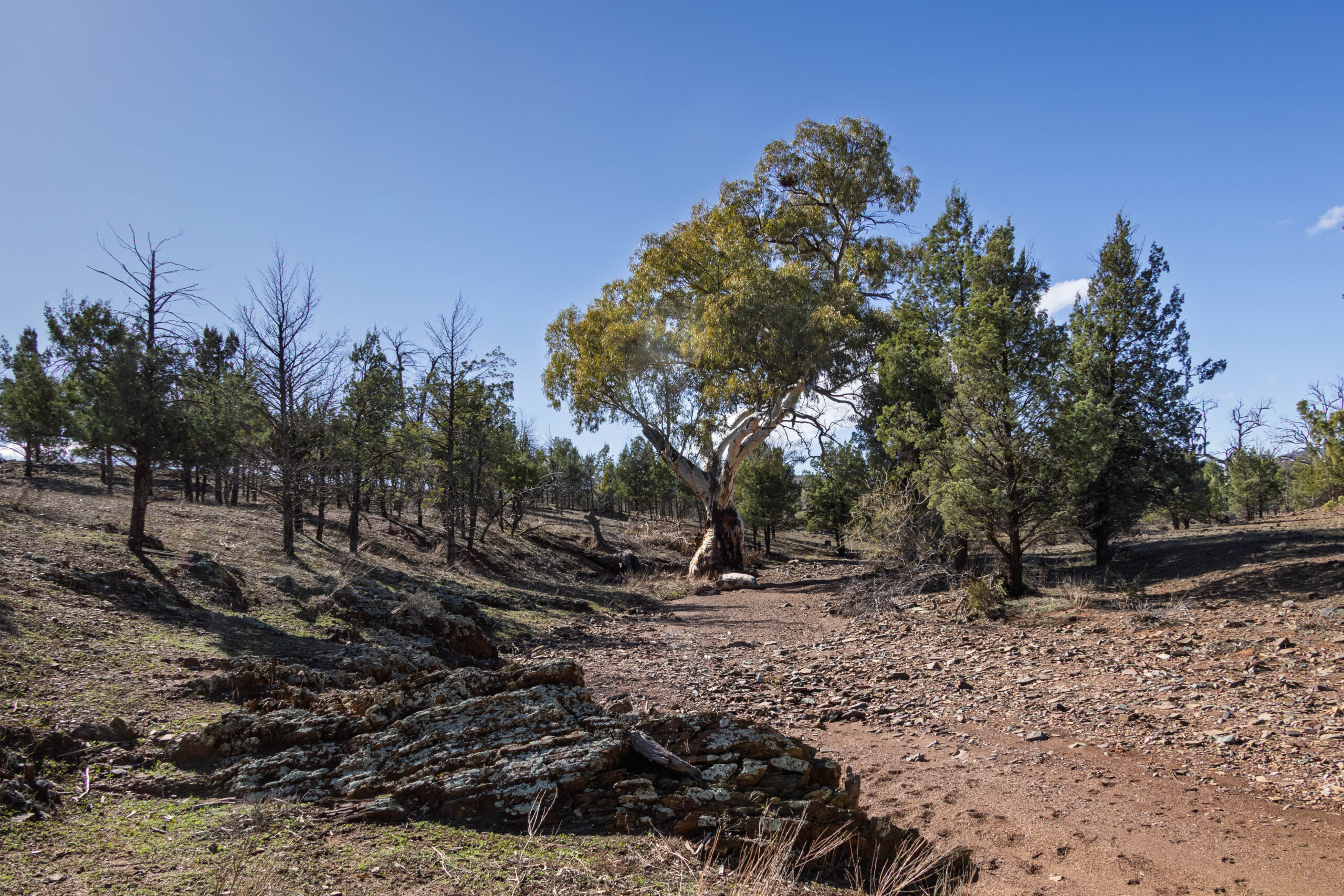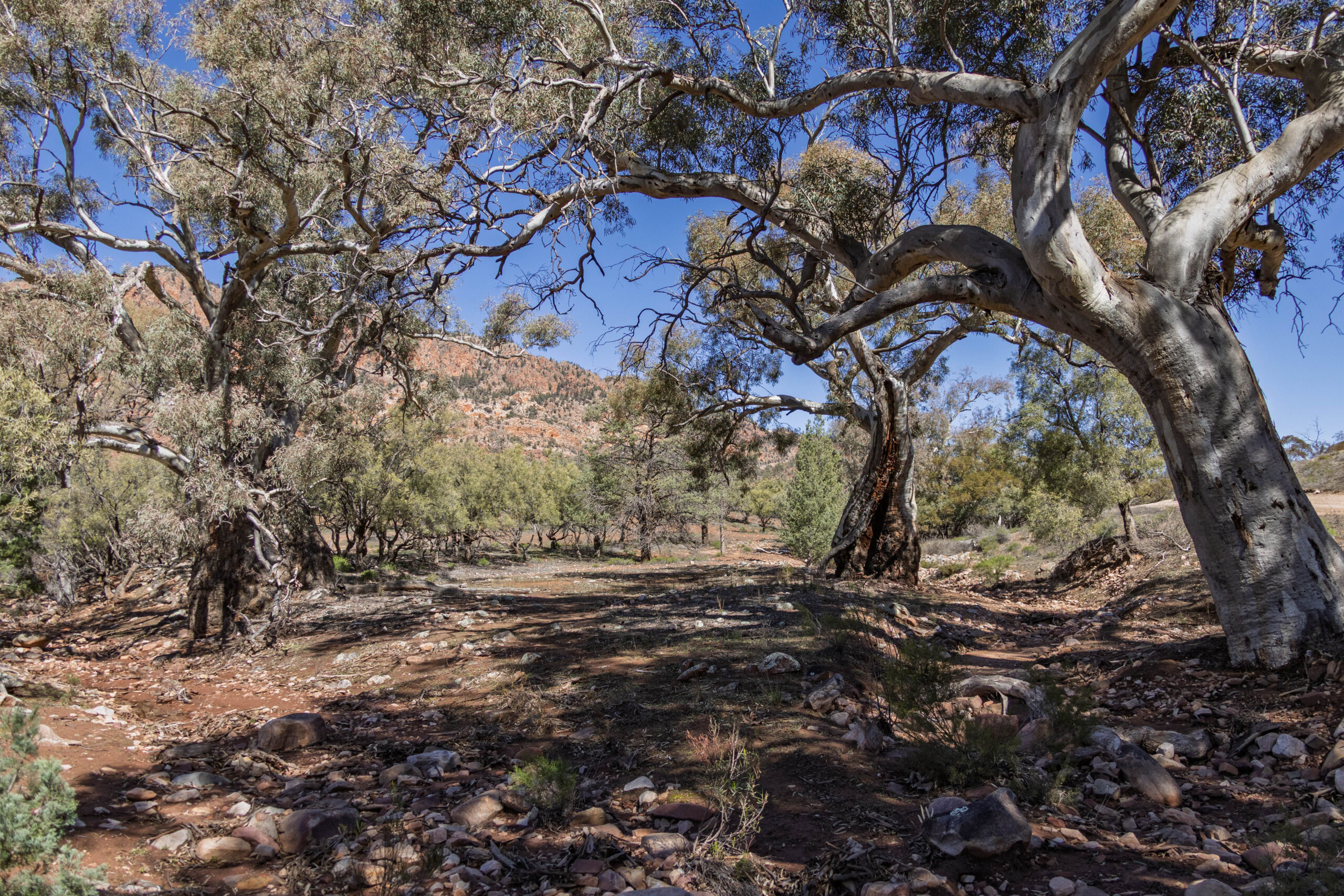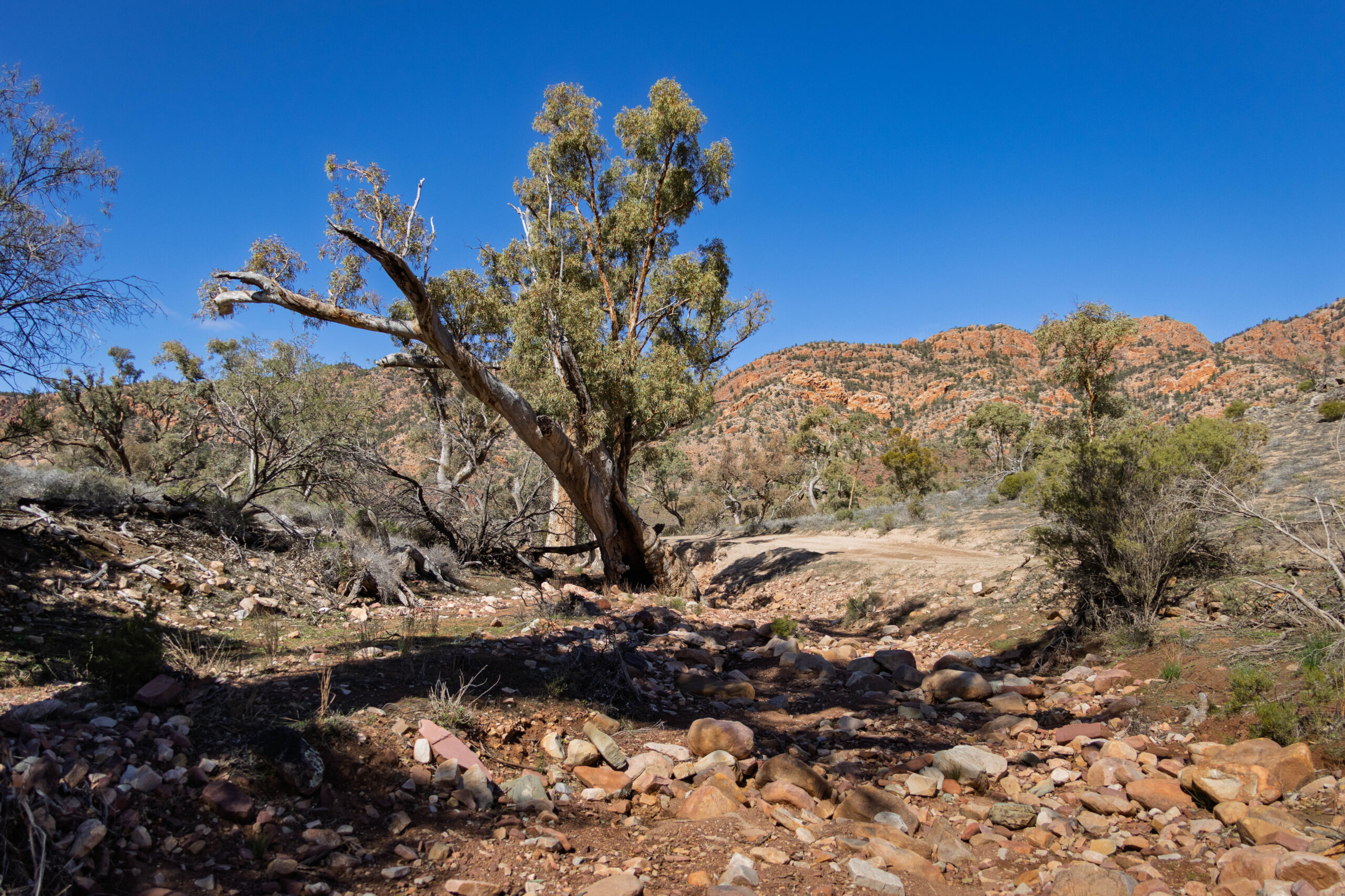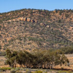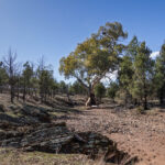 With the tyre pressure reduced we set off along the yellow route which is suitable for low clearance 4WDs. Soon we came to our first river crossing which was … dry. Already the rain that fell recently has all but disappeared. The main thing of note at this, and all the other river/creek crossings, is the river red gums that grow in these occasional water courses. The water may only flow only once or twice a year in most years so these magnificent gum trees rely on flooding every few years to survive in this semi-arid environment.