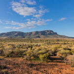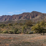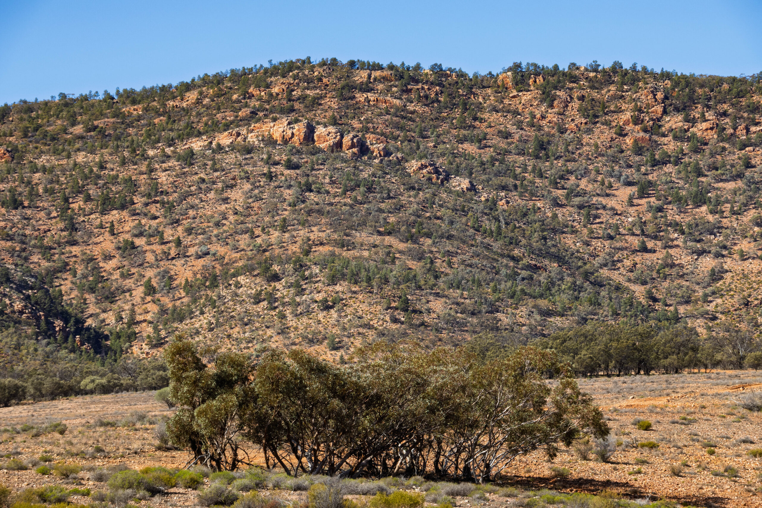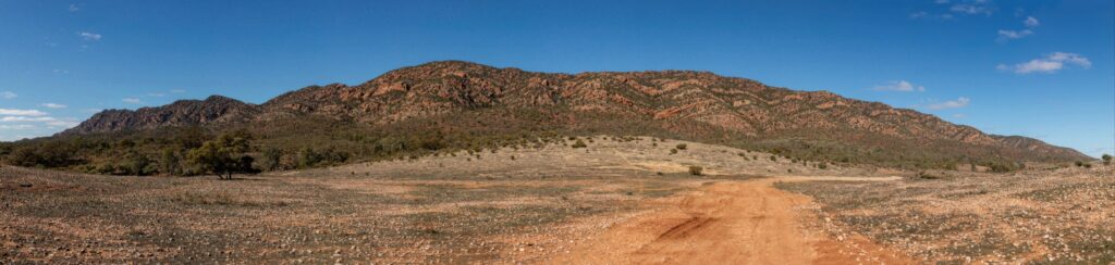 We drove through narrow leaved hop bushes (Dodonoea Viscosa) characterized by their sticky narrow green leaves that are perfect for surviving in the dry climate, before getting up close to the Chace and Elder Range. The range is composed of rock over 560 million years old. The ranges are spectacularly striped having been formed from sedimentary layers that were deposited when this region was covered by a shallow ocean 550-850 million years ago. I would describe the stripes as cream/yellow and red, but the guide tells me that the ranges consist of predominantly red brown Bonney Sandstone and orange red Rawnsley Quartzite.