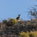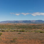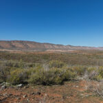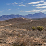 At Martins Well Road we reached the end of the yellow track. We turned left onto the road heading west. As Bernie drove, I spotted a lone tree on an outcrop of rock with the gloriously striated Chace Range behind it. Stop, stop, stop I said. Photo op! I jumped out of the car and tramped around in the saltbush looking for the right vantage point. I snapped a couple of photos then started tramping back towards the truck. My efforts disturbed a kangaroo (or other macropod?) which jumped up out of the brush and bounded away. I did feel bad about disturbing it from where it was snoozing its day away in the sun.