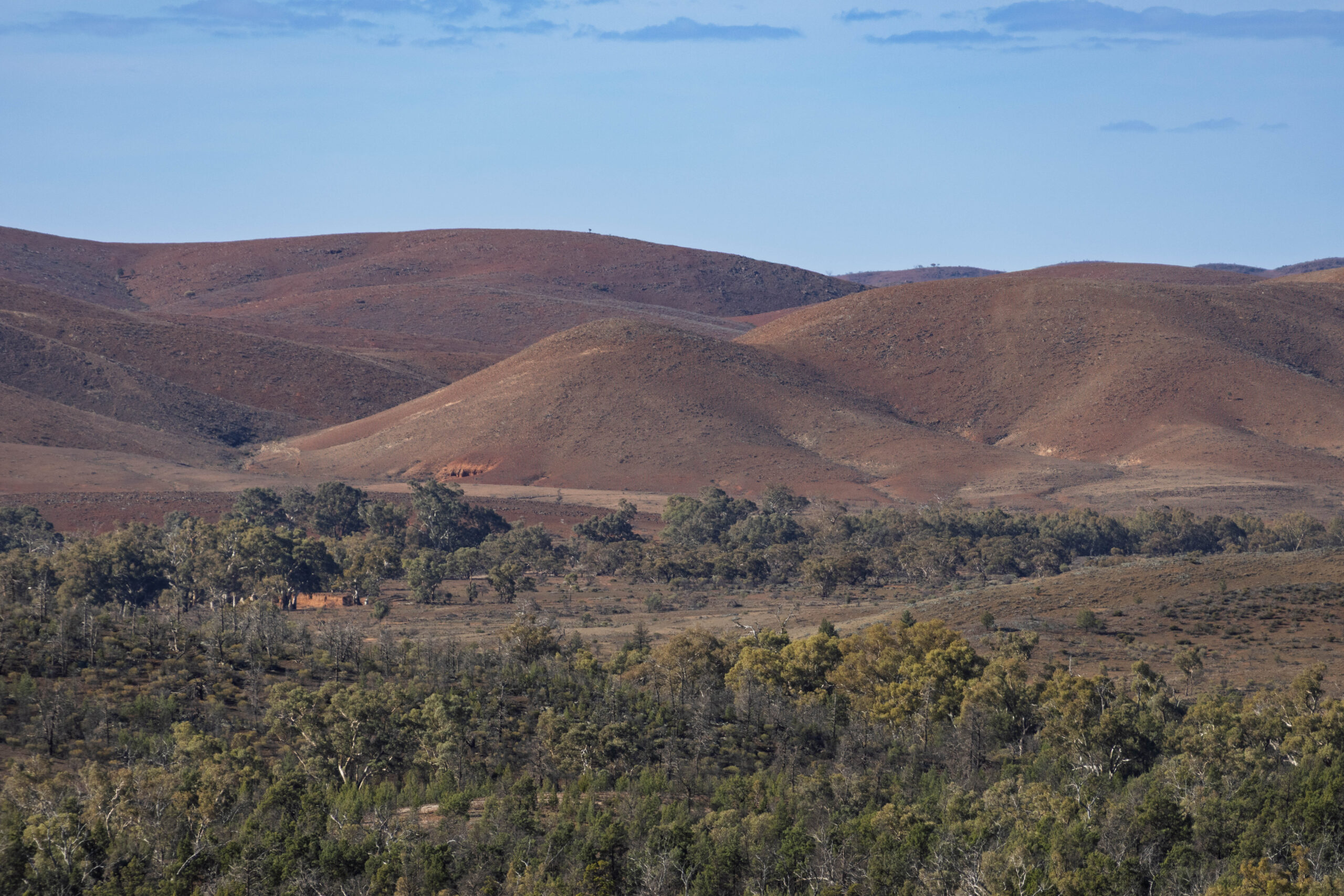 After some fairly exciting driving up and down big red hills we found ourselves at the Wilpena Creek Lookout. From this vantage point we could see, in the middle distance, the line of river red gums that follow the line of Wilpena Creek, with the bald red hills of Upalinna behind. Wilpena Creek is a major creek in the area flowing from Wilpena Pound to Lake Frome which is to the south of Arkaroola.