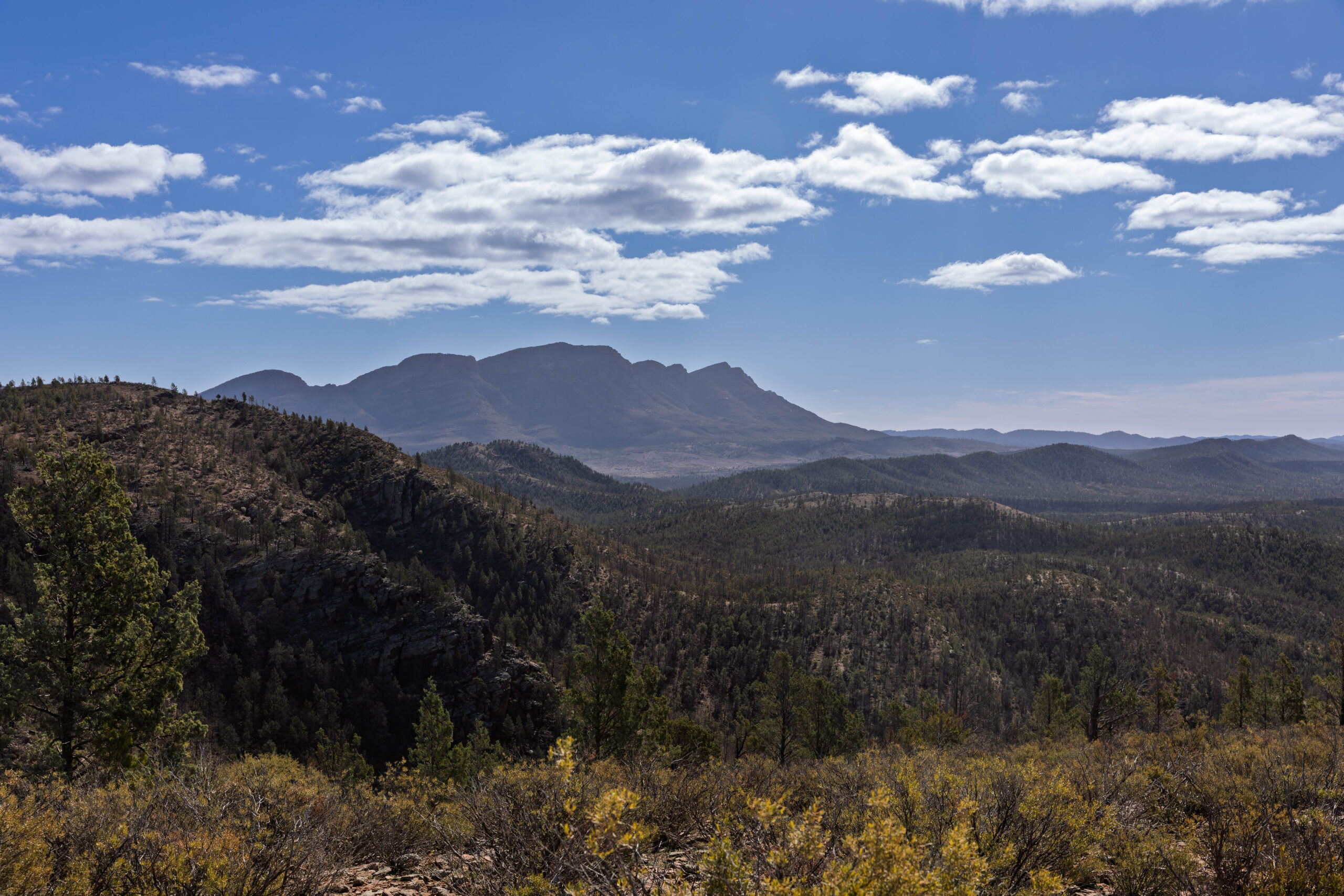 What goes up, must come down, and we were now on the Prelinna Descent. As we made our way down the hill we spotted a whistling kite in a tree by the roadside and managed to snap a photo before it flew off. We also spied a macropod hopping off to the side of the road far too quickly to decide what type of jumping marsupial it was?? In the visitor book someone had made an entry saying they had seen a yellow-footed rock-wallaby on their ascent to Prelinna Lookout. We were somewhat skeptical because we’re not sure this is actually rock-wallaby territory??? I’m just going to stick with recording a general Macropod sighting.