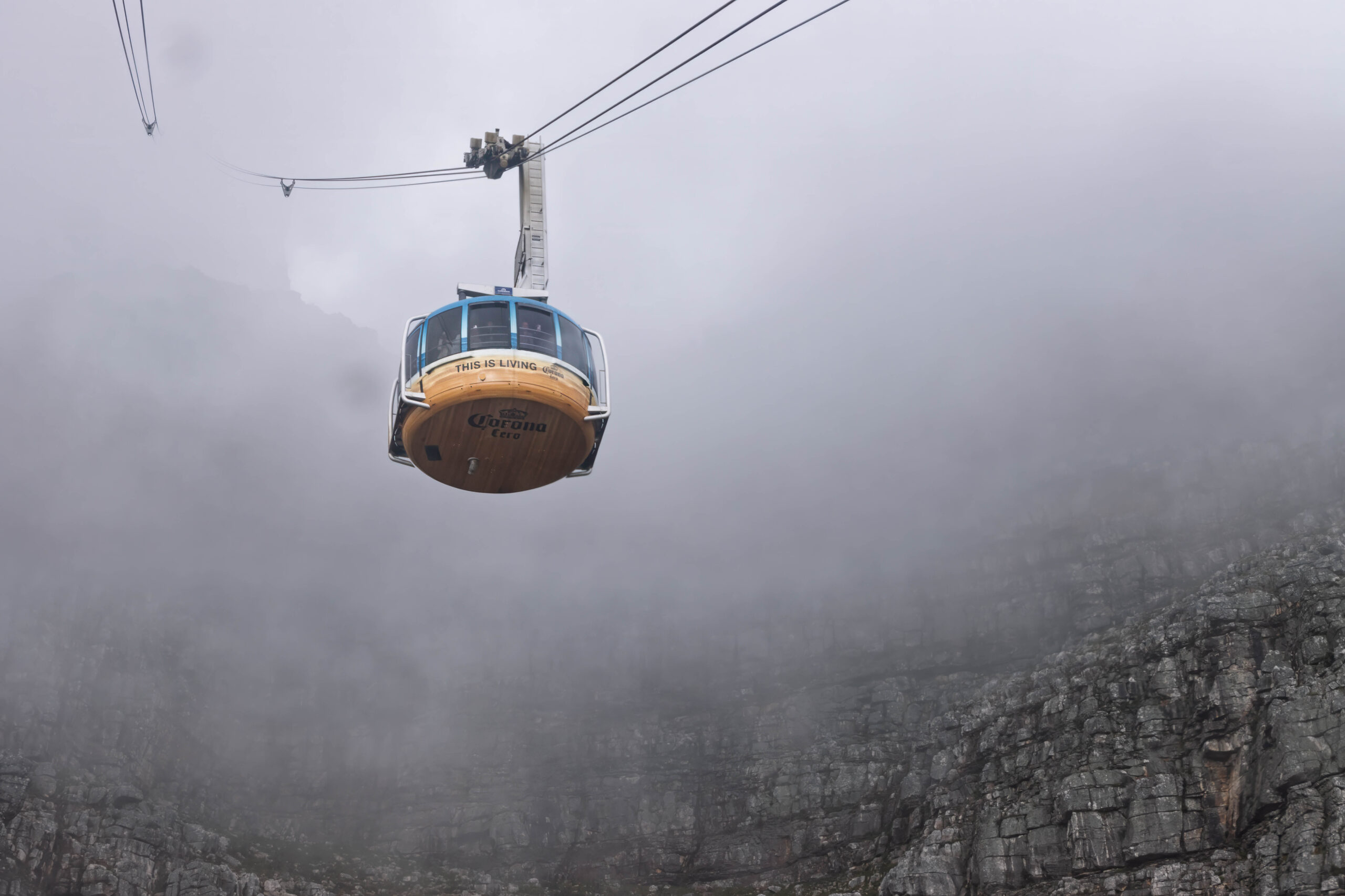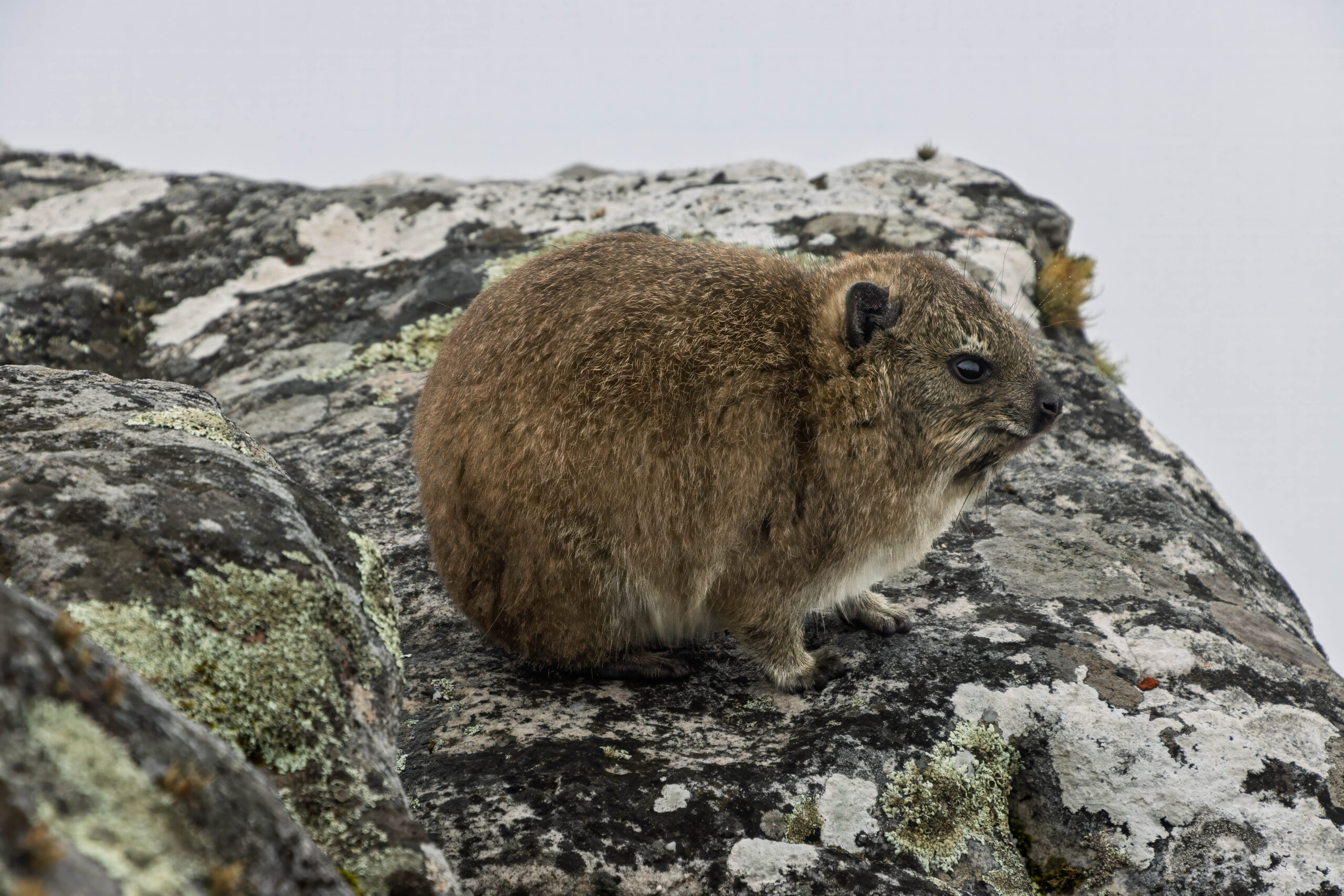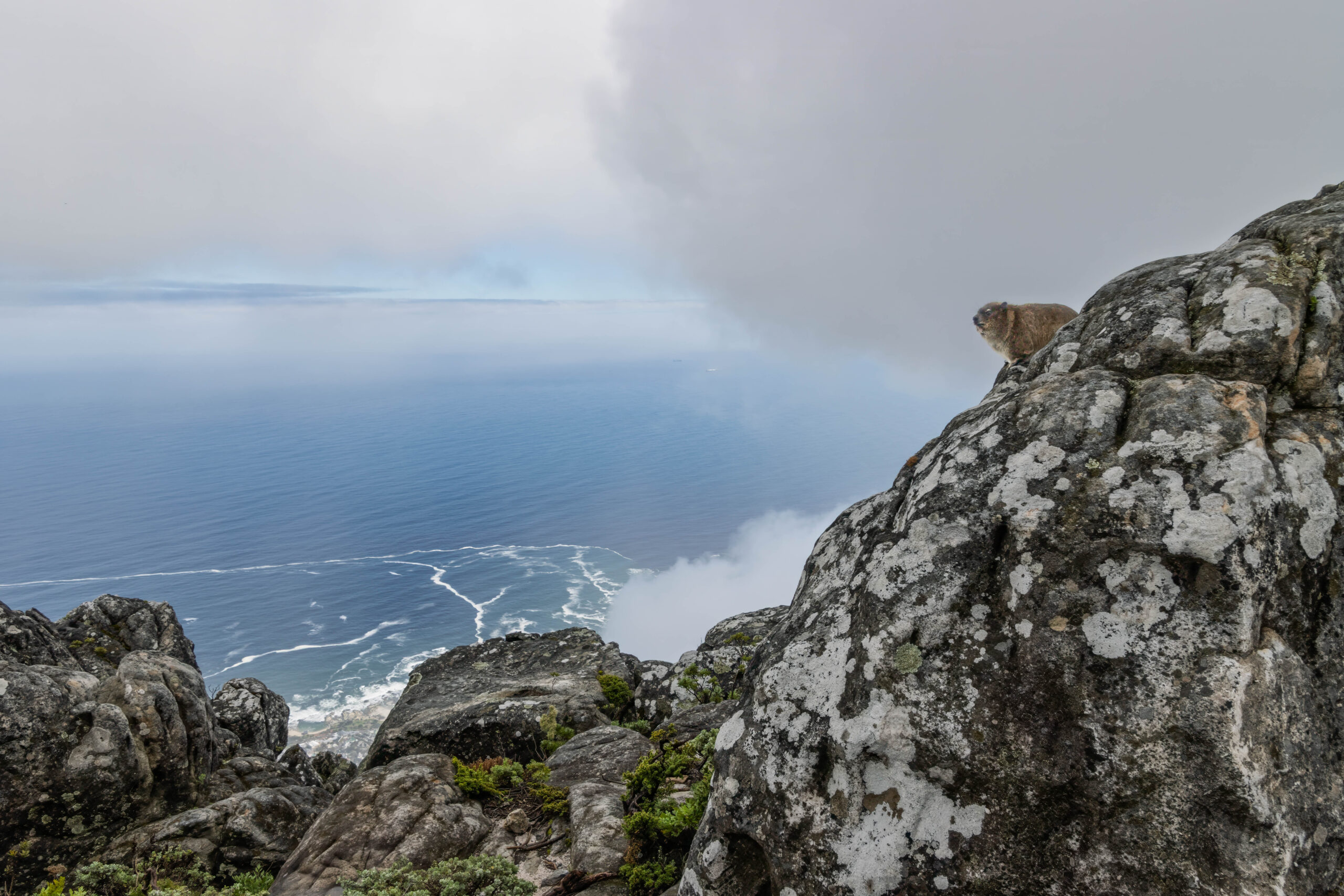 We couldn’t see down to the harbour but there were some hyraxes sitting on the rocks so at least there was something to see. We were also bemused by all the warning signs: Do Not Jump From The Rocks, Do Not Climb On The Rocks and Do Not Sit On The Rock Walls. And if we had been feeling like an adrenaline rush we could have paid for an abseiling experience. Bernie asked how far you could abseil and was told it was 120 metres but he didn’t give it a go. Occasionally a small sliver towards the west coast was revealed to us but the majority of the peak was fogged in.