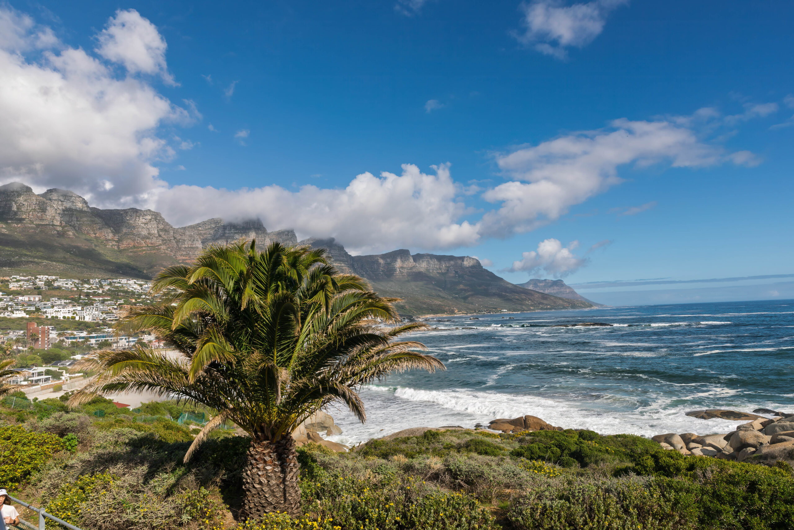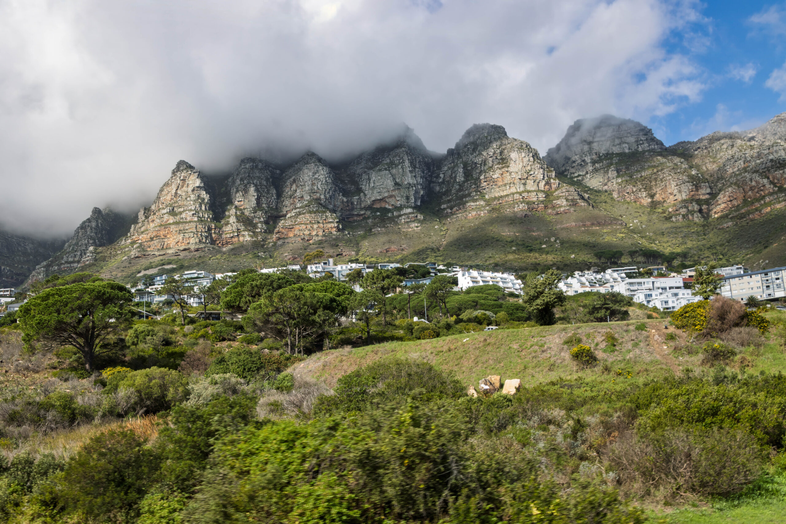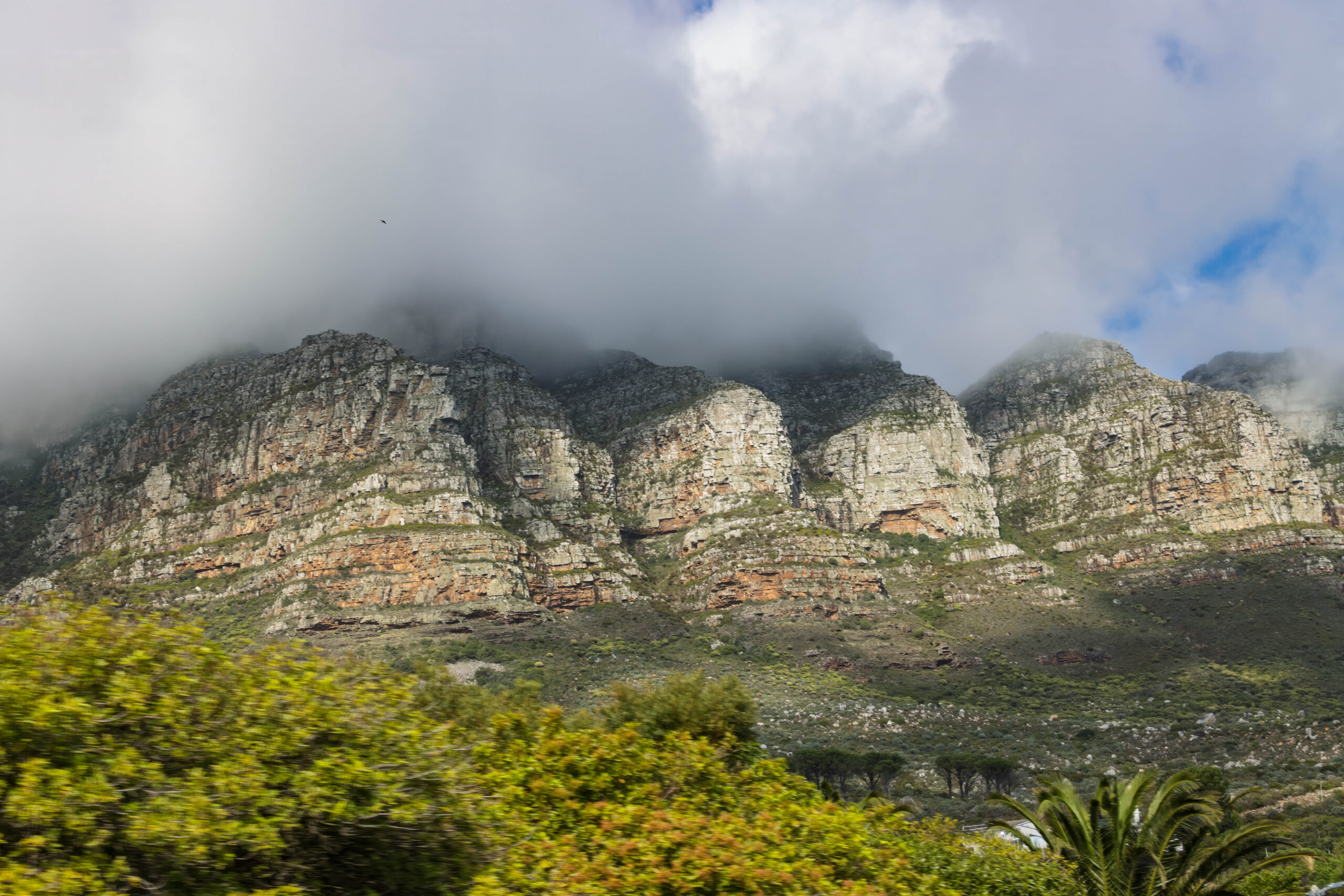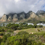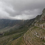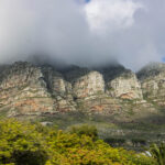 We rode back down the mountain and into the sunshine. We really cannot complain because the weather IS so much better than it has been for the last three days – just not on top of the mountain. Besides we had a ride in a cable car that had a floor that rotated. We’ve never done that before! We were able to board a red route bus straight away when we arrived back at the lower station, to continue on the red route back into the city. The red route joins the blue route at Camps Bay so once again we found ourselves travelling north along Victoria Road. And, finally, the cloud over the mountain was clearing and we actually saw the seaward side of the buttresses that are nicknamed the ‘Twelve Apostles’ … even though there are 18 of them.