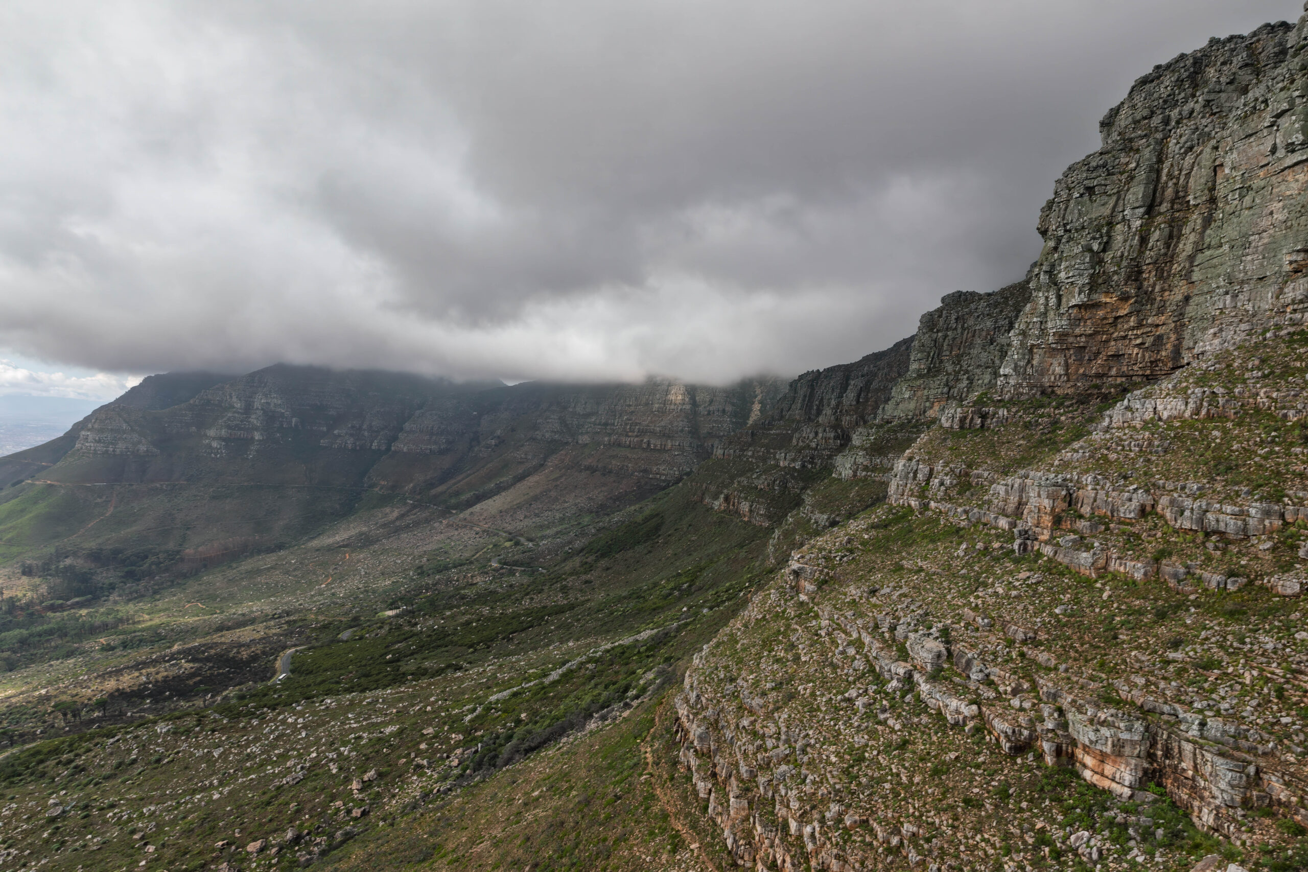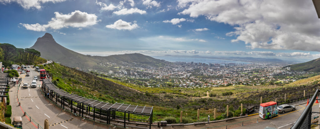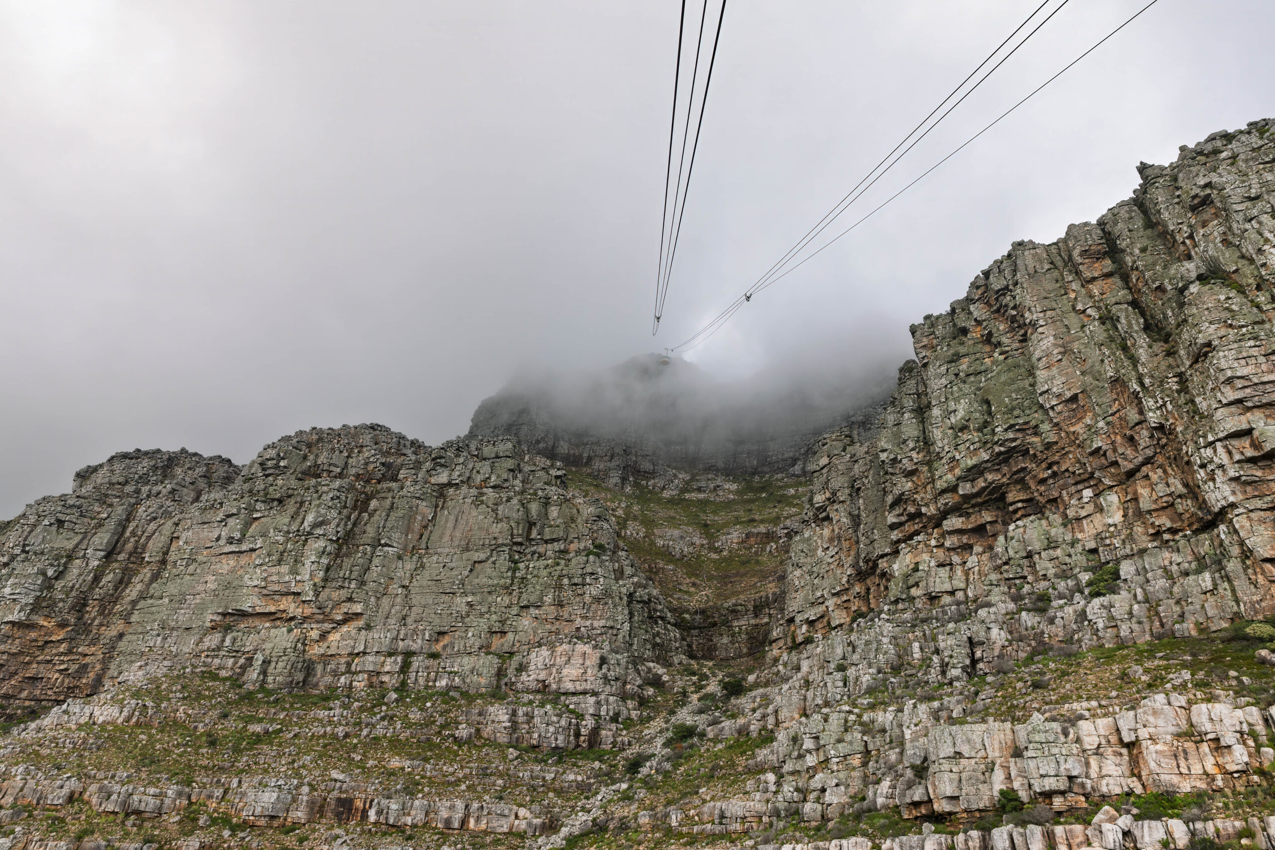 At the end of our ‘Free’ walking tour it was time to stress out over what we should tip Maree. We have no problem paying for an entertaining and informative tour but would prefer that it was priced so that we didn’t have to try to work out the right amount to pay! Especially since she had seemingly organised for the sun to shine for us today. Maree had returned us to the tour office where we planned to continue with the Red Route to travel to the cable car station on Table Mountain. Although the sun was shining in the city and the lower slopes were visible, the summit remaining shrouded in cloud as we drove up the flank of the mountain.