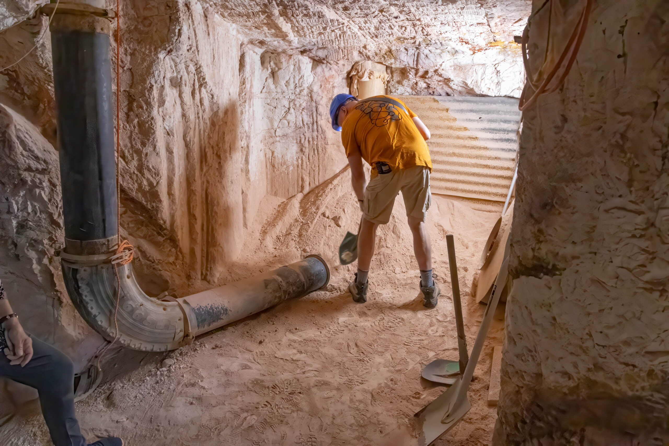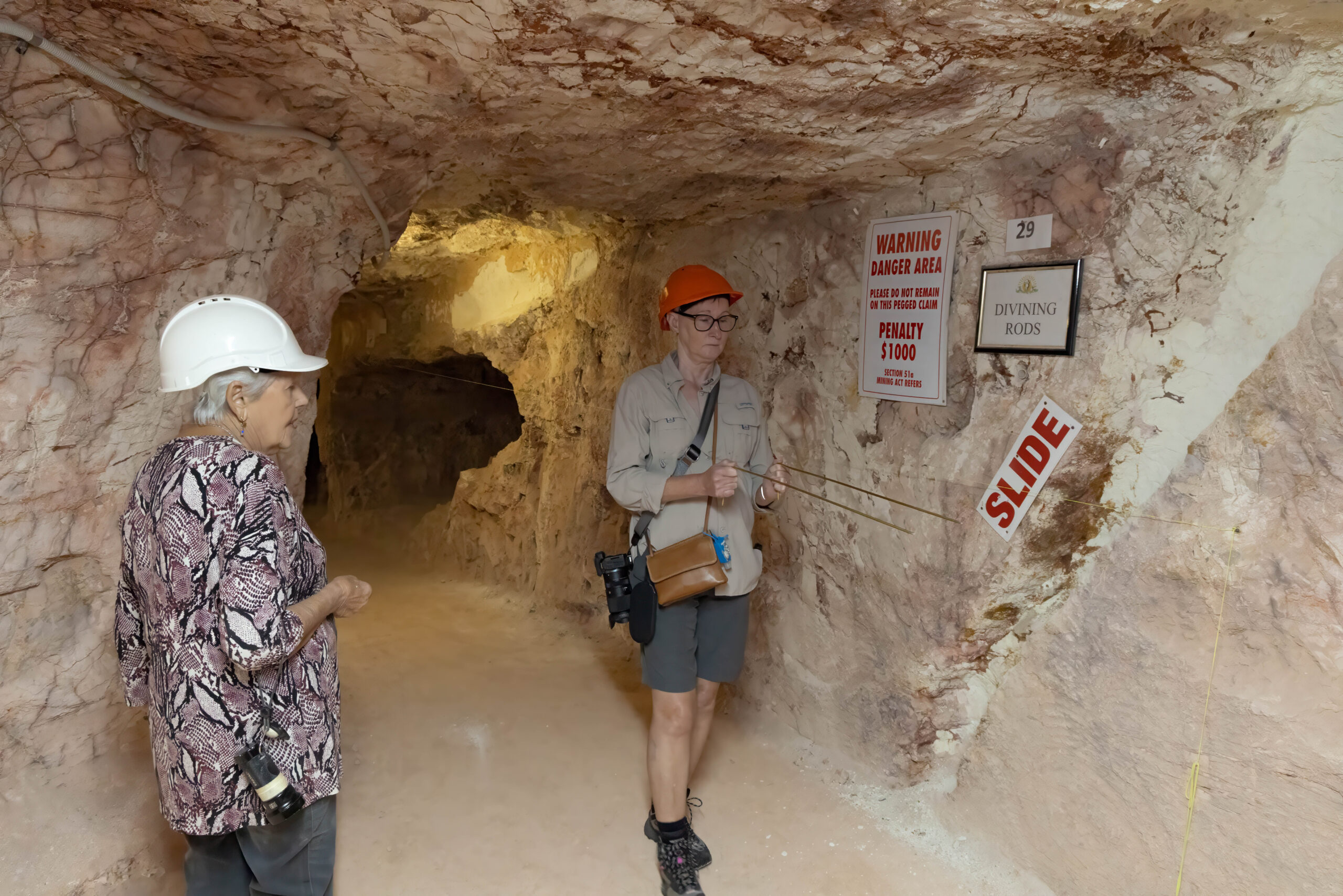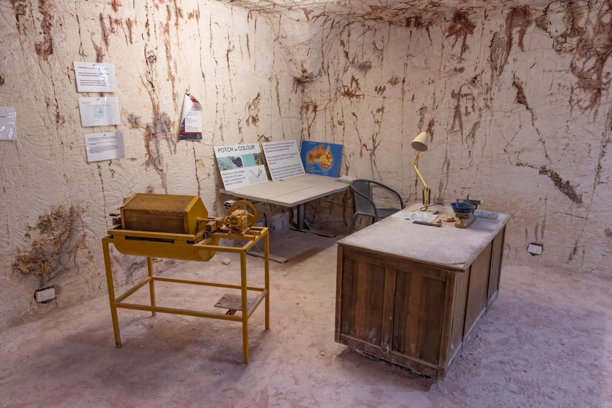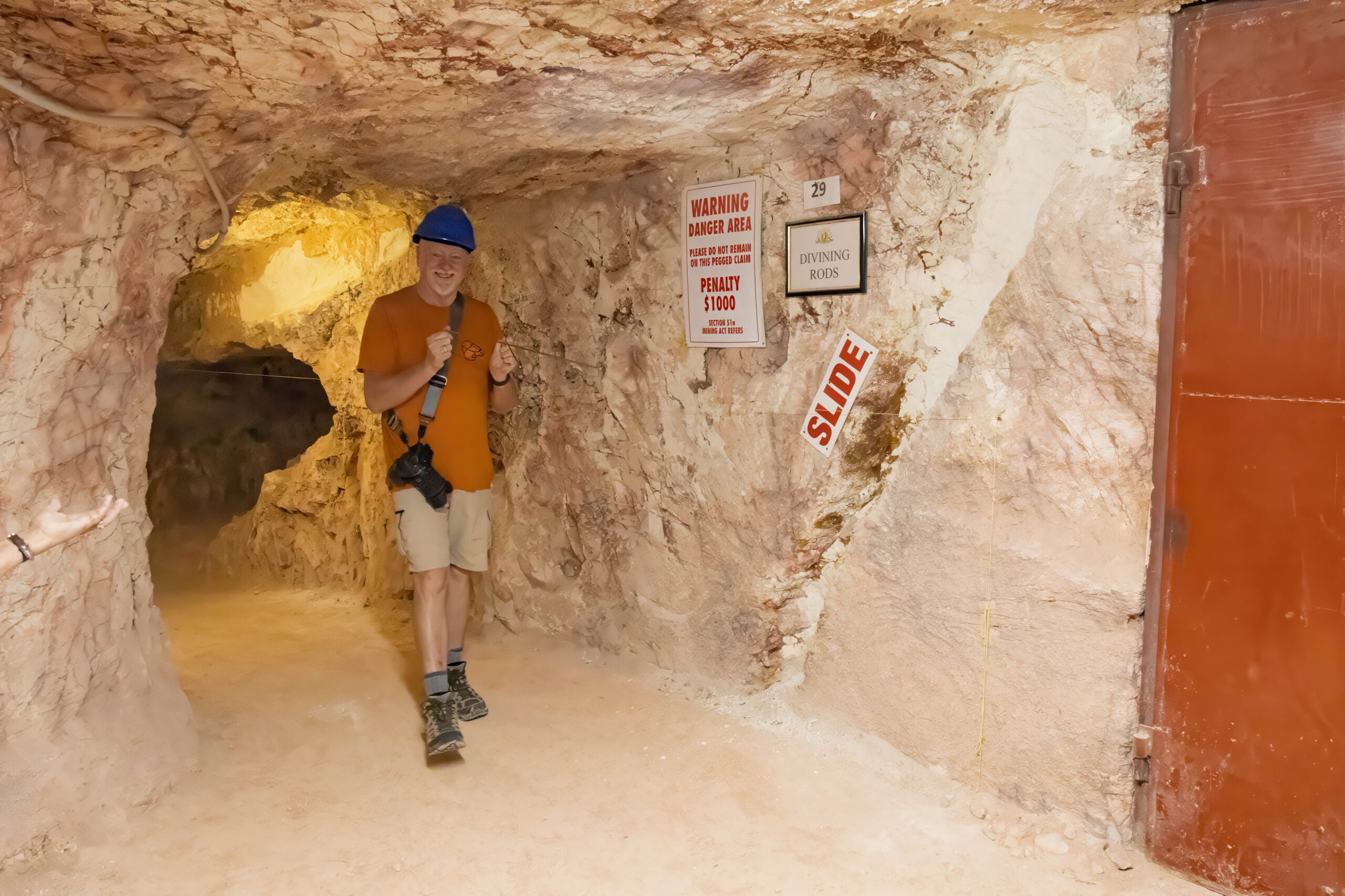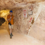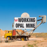 The mines here are very different from those at Lightning Ridge. Not only are the opals different – milky/white vs black – the sandstone is harder here so they can make much larger tunnels without props. We were able to walk through most of the mine without having to stoop at all. The funniest story Mila told us was when she was relating the era when they started using explosives to mine. Back then the use of explosives was barely regulated and she told us she would work down the mine after dropping the kids at school, until the afternoon school run, when she would pick up the boys, then go to the supermarket for bread and milk and a box of gelignite. Yup, they sold it at the supermarket!! And the boys used to help wrap the ‘sausages’ in newspaper and add the fuses, ready to be placed in the holes drilled in the mine the next day.