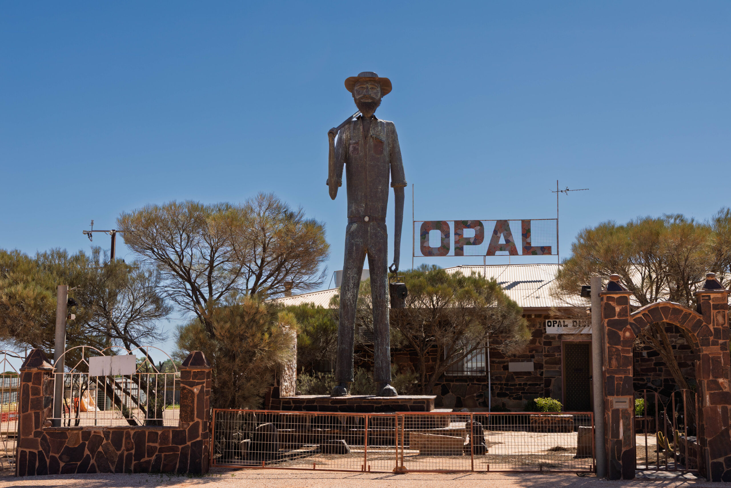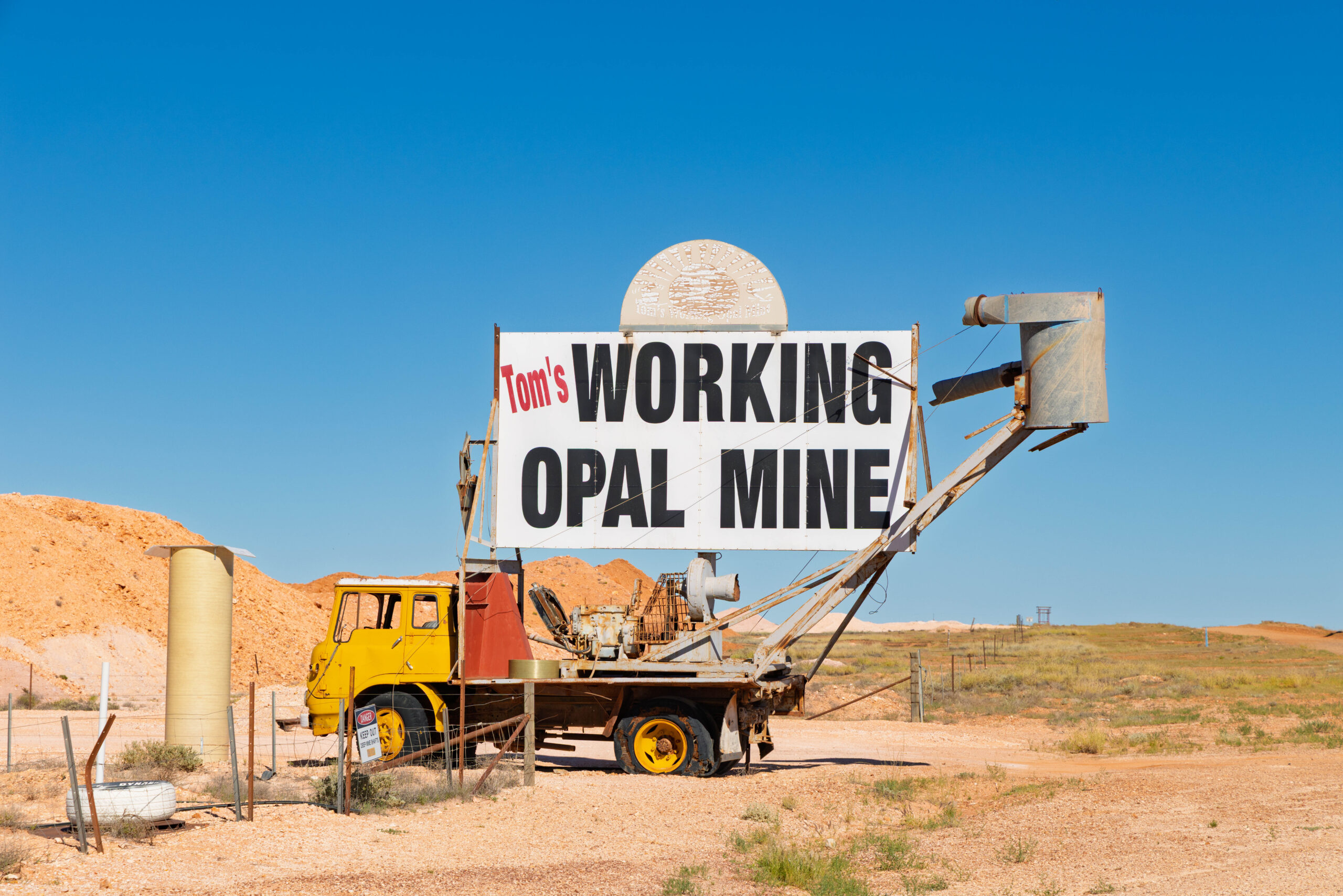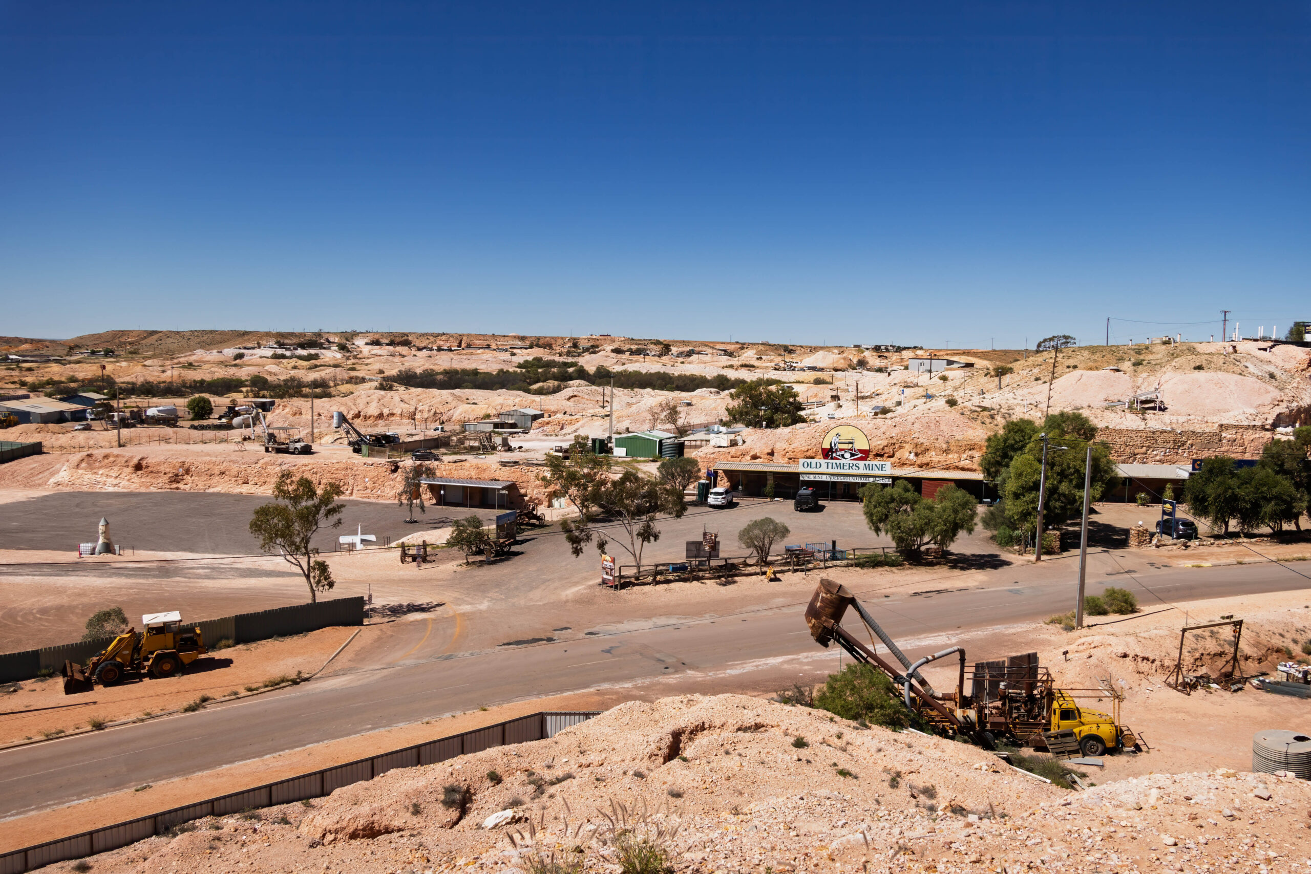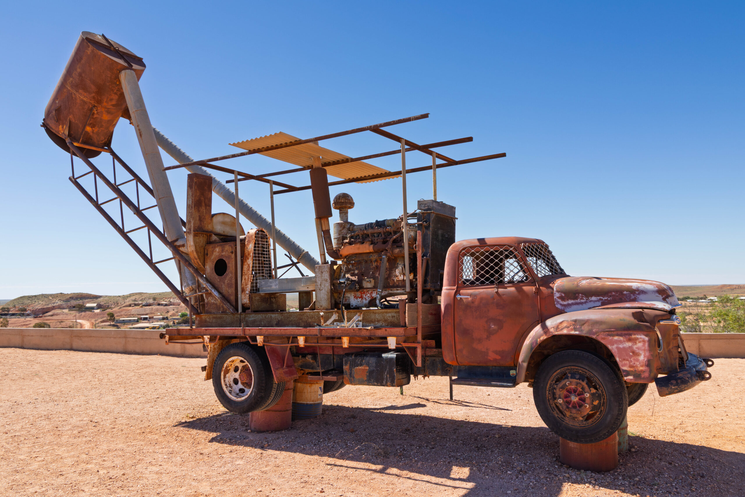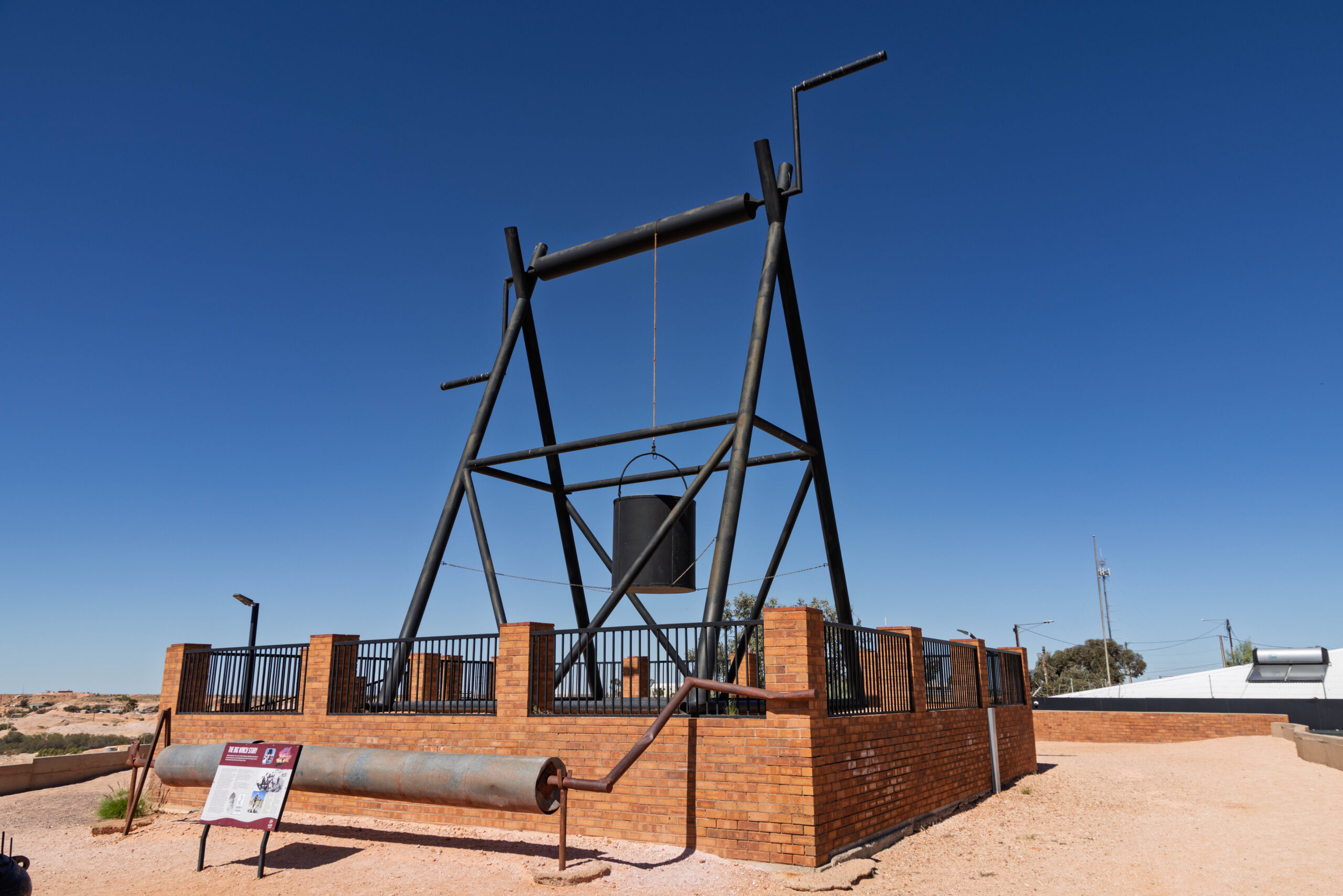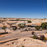 Returning to town, we drove up the hill to visit the Big Winch. With spectacular 360° views over Coober Pedy, the Big Winch has been a popular attraction and meeting place for visitors and locals since it was built by Claus Wirries in the early 1970s. Arriving in Coober Pedy in 1967, Claus was a colorful character who mined, cut and traded opals, spending several months each year selling stones in Europe.