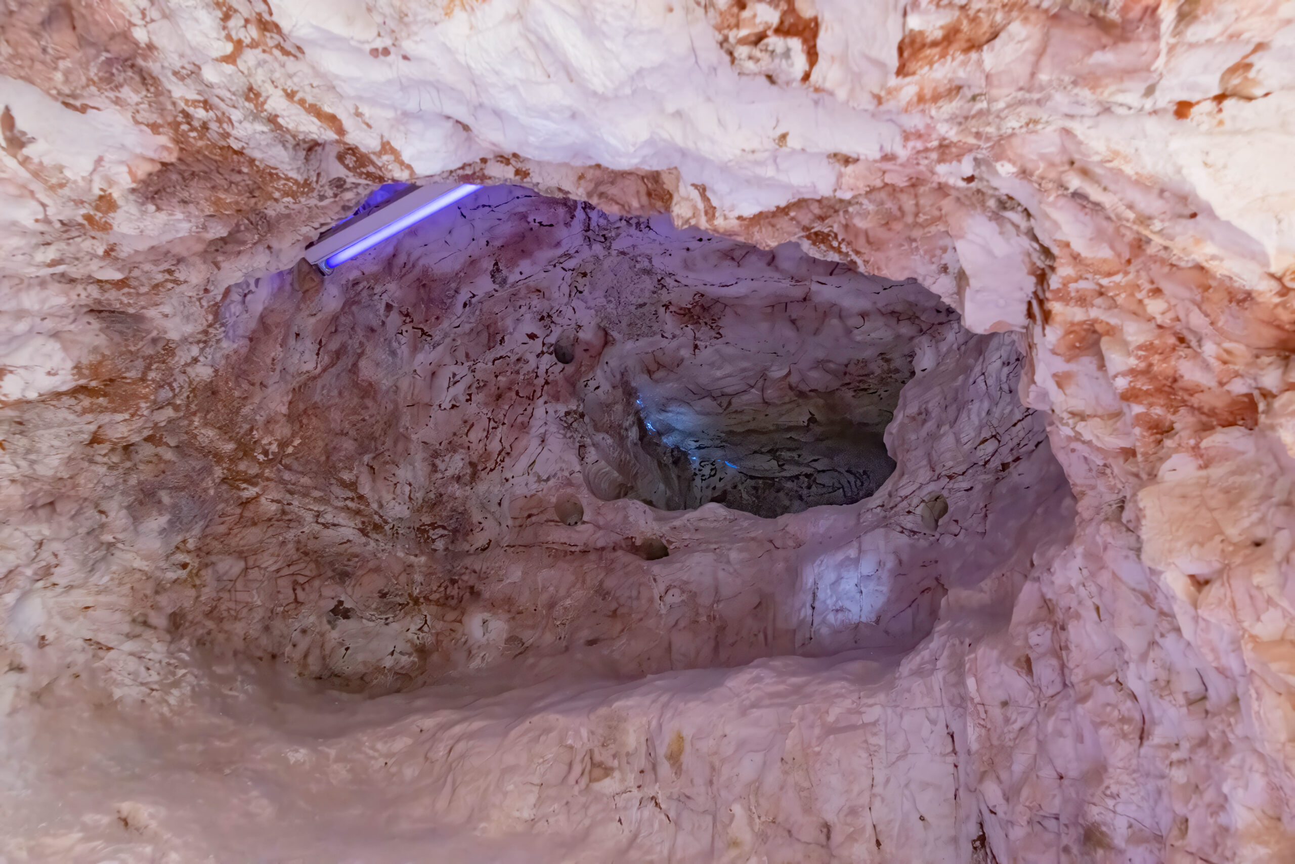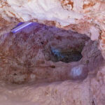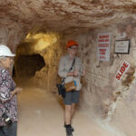 At 10.00am our guide, Mila, issued us with hard hats and UV torches and we headed into the mine. Mila arrived from the Czech Republic in the late 60s and settled in Coober Pedy and … what a stupid idea that was she said!! Anyhow, she stayed and mined with her husband for many years, back in the day when most of the mining was done by hand. She told us it was very hard work for a woman who only weighed 48 kilos at the time! Her husband has passed away now, but her sons still mine.