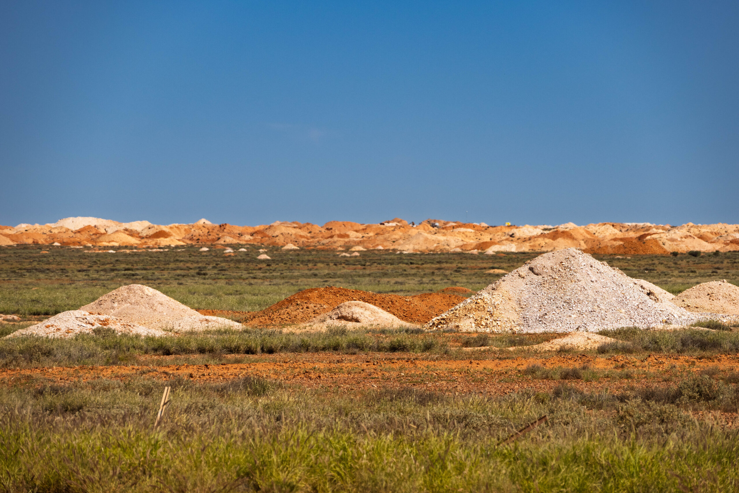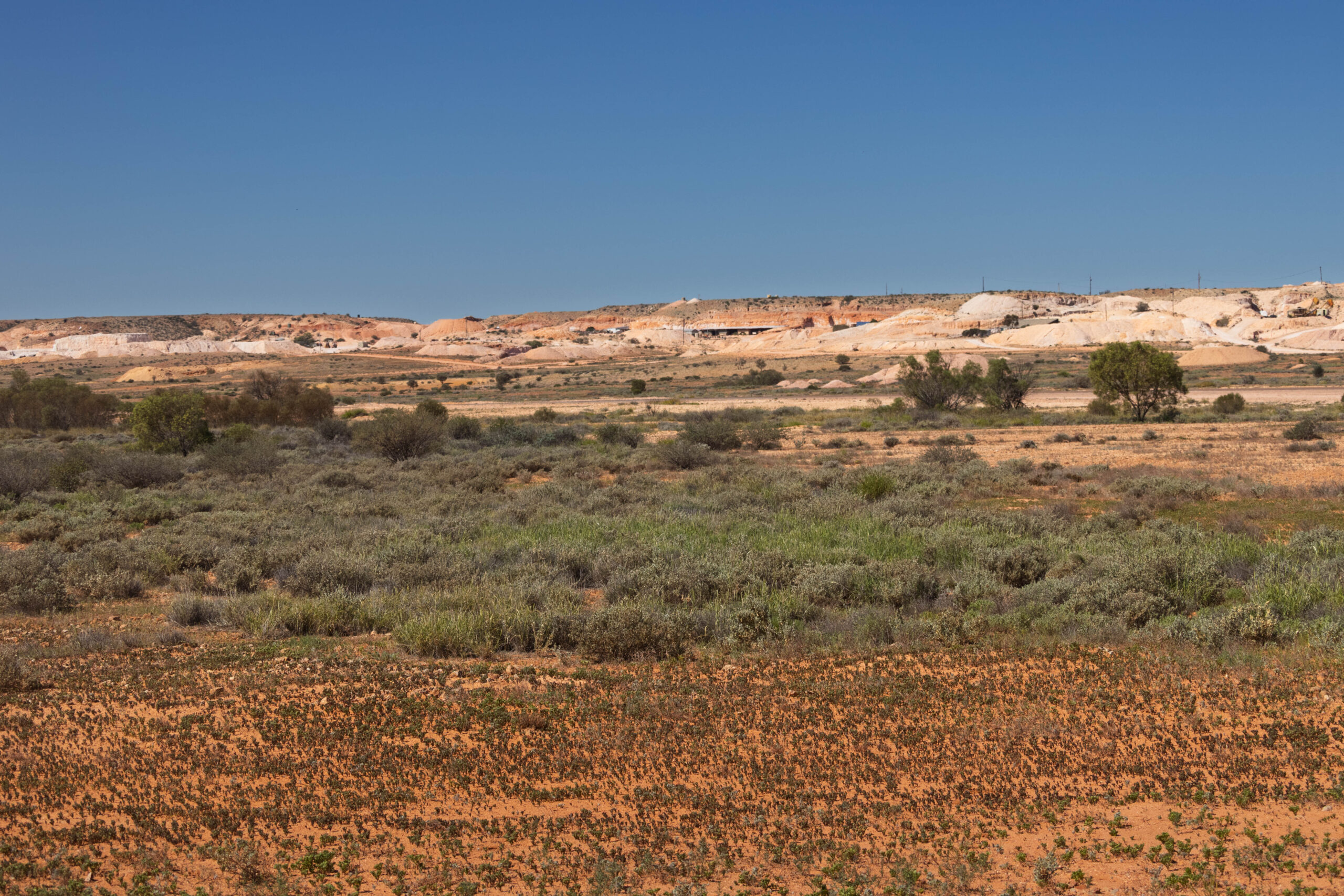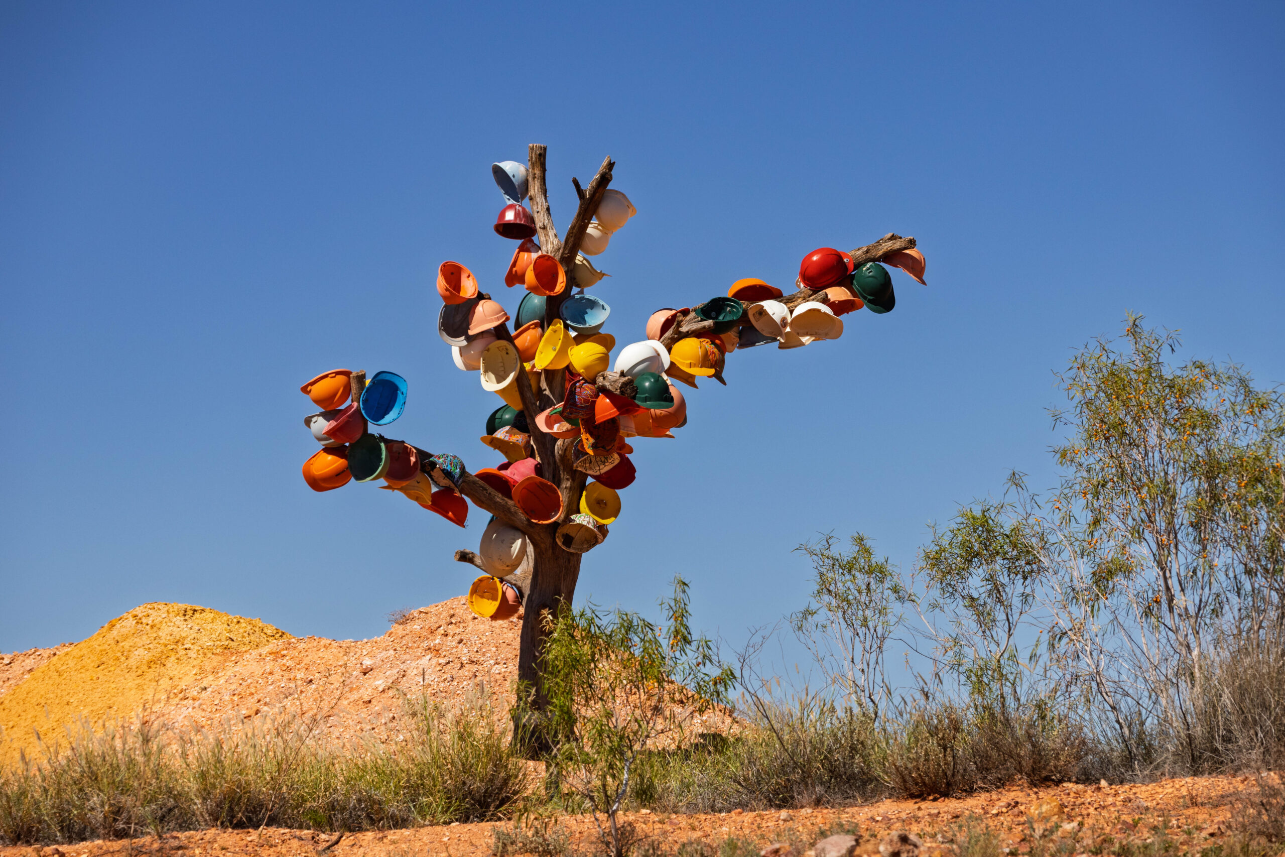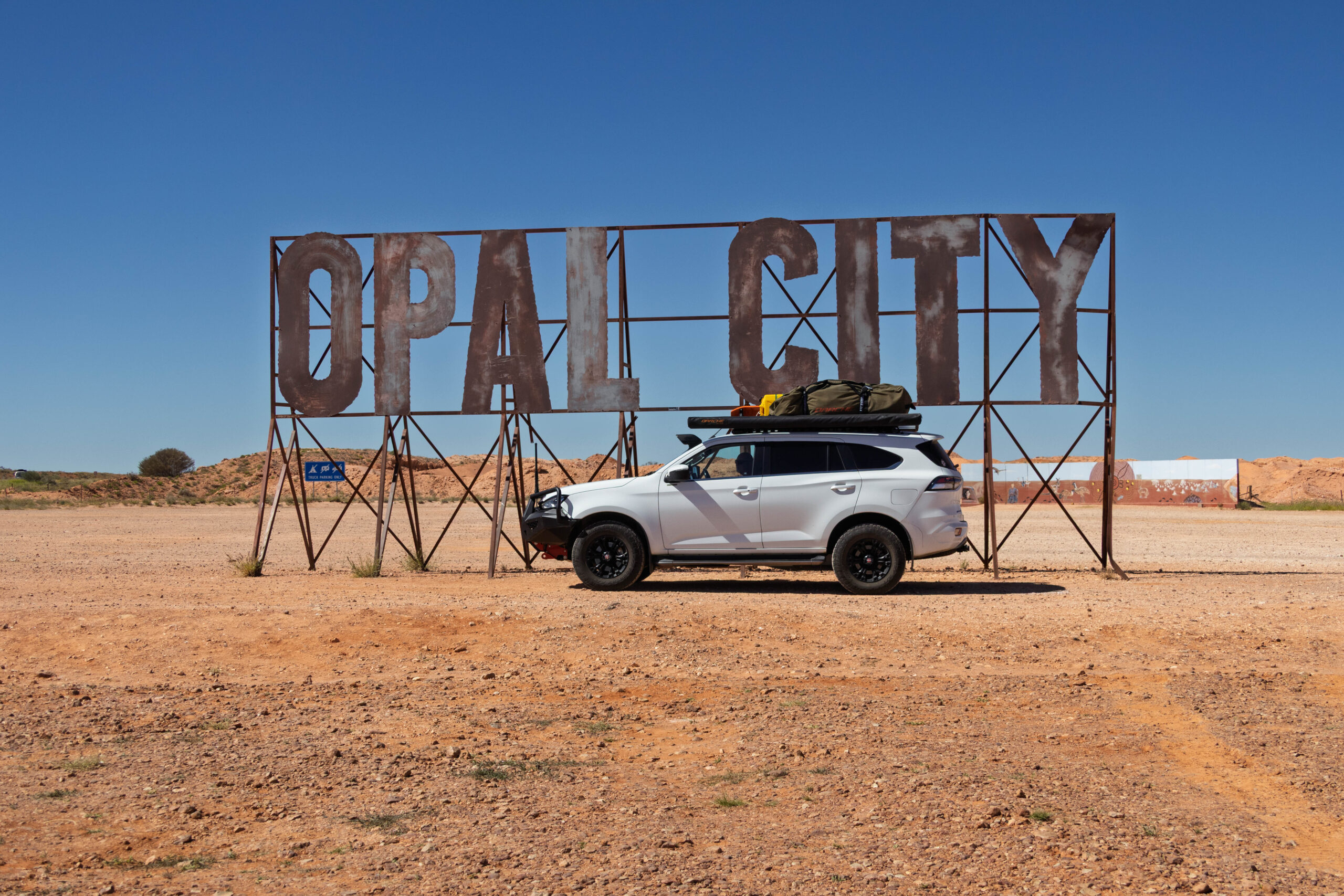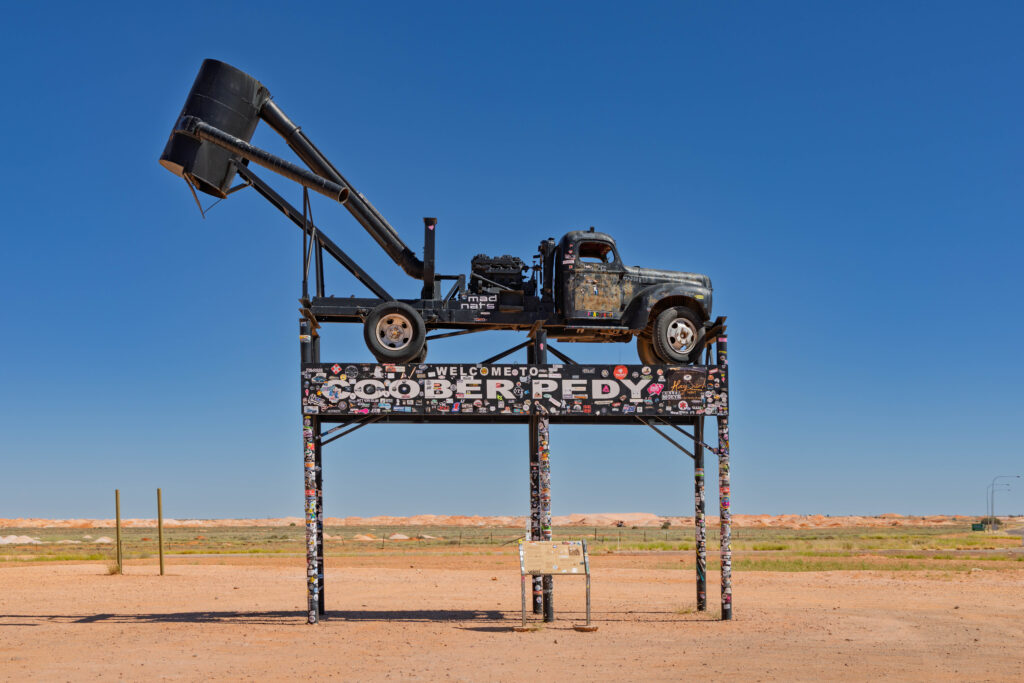 From the mine, located out on the Stuart Highway, we drove back towards Woomera to photograph a few things that we didn’t stop for yesterday afternoon. Very touristy shots along the highway of the Hard Hat Tree, the iconic blower truck with the Welcome to Coober Pedy sign and the OPAL CITY sign. We rounded those out with photos of the mullock heaps and the house fronts on the hillside that are the only visible part of the underground homes.