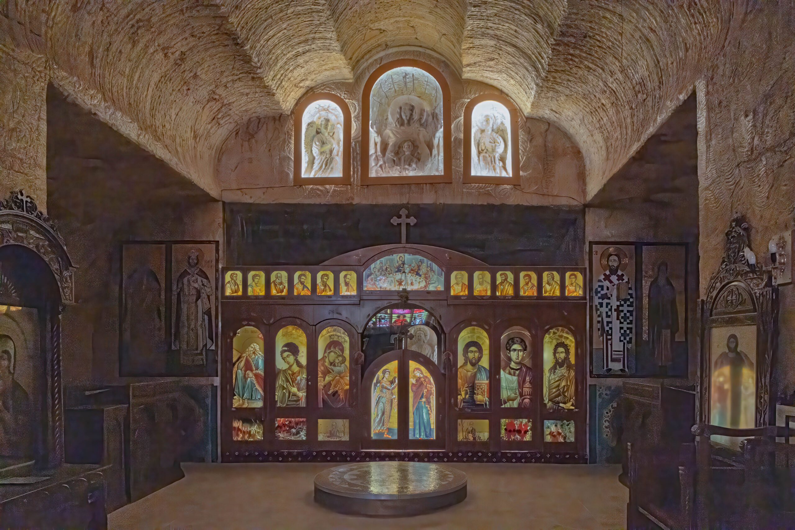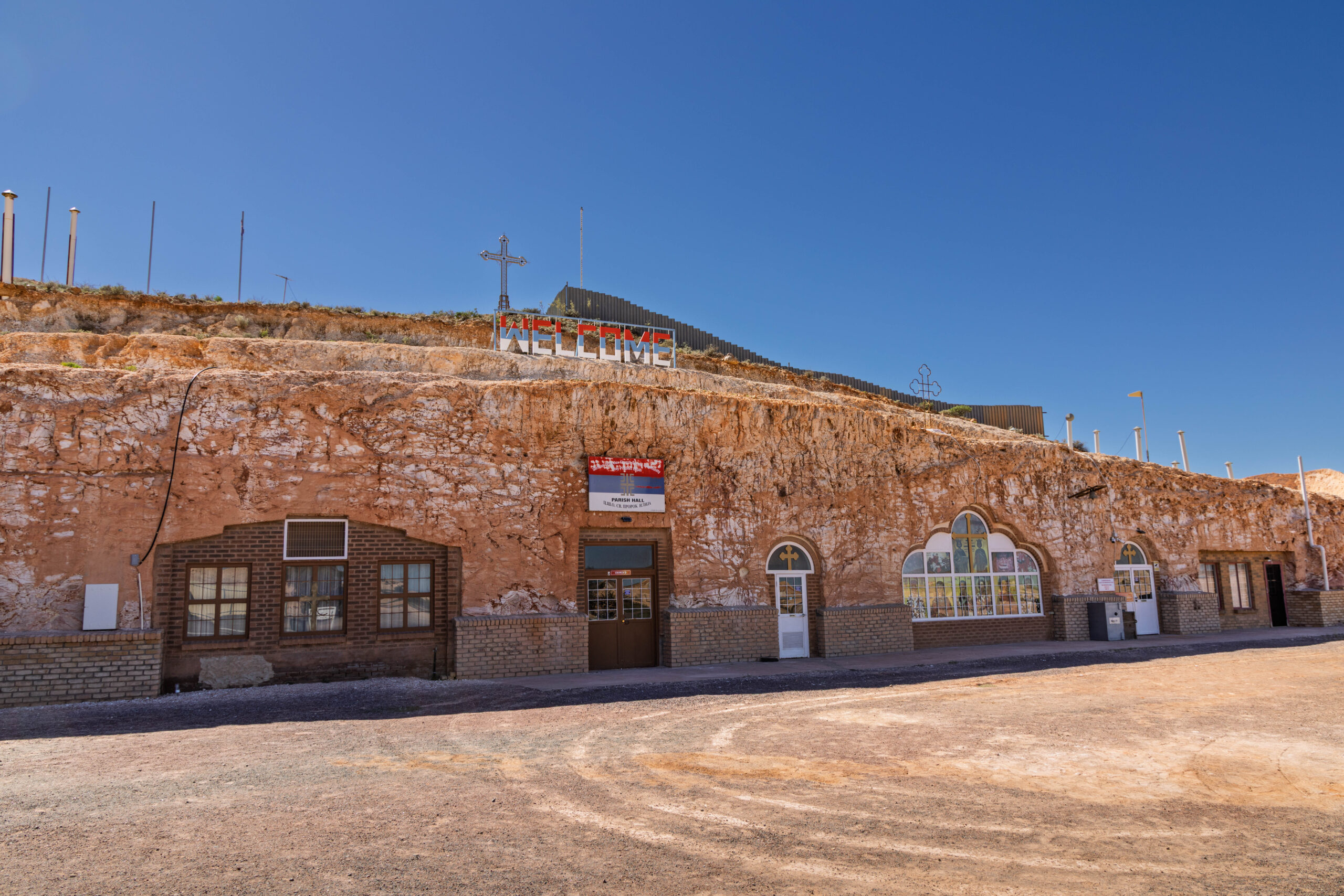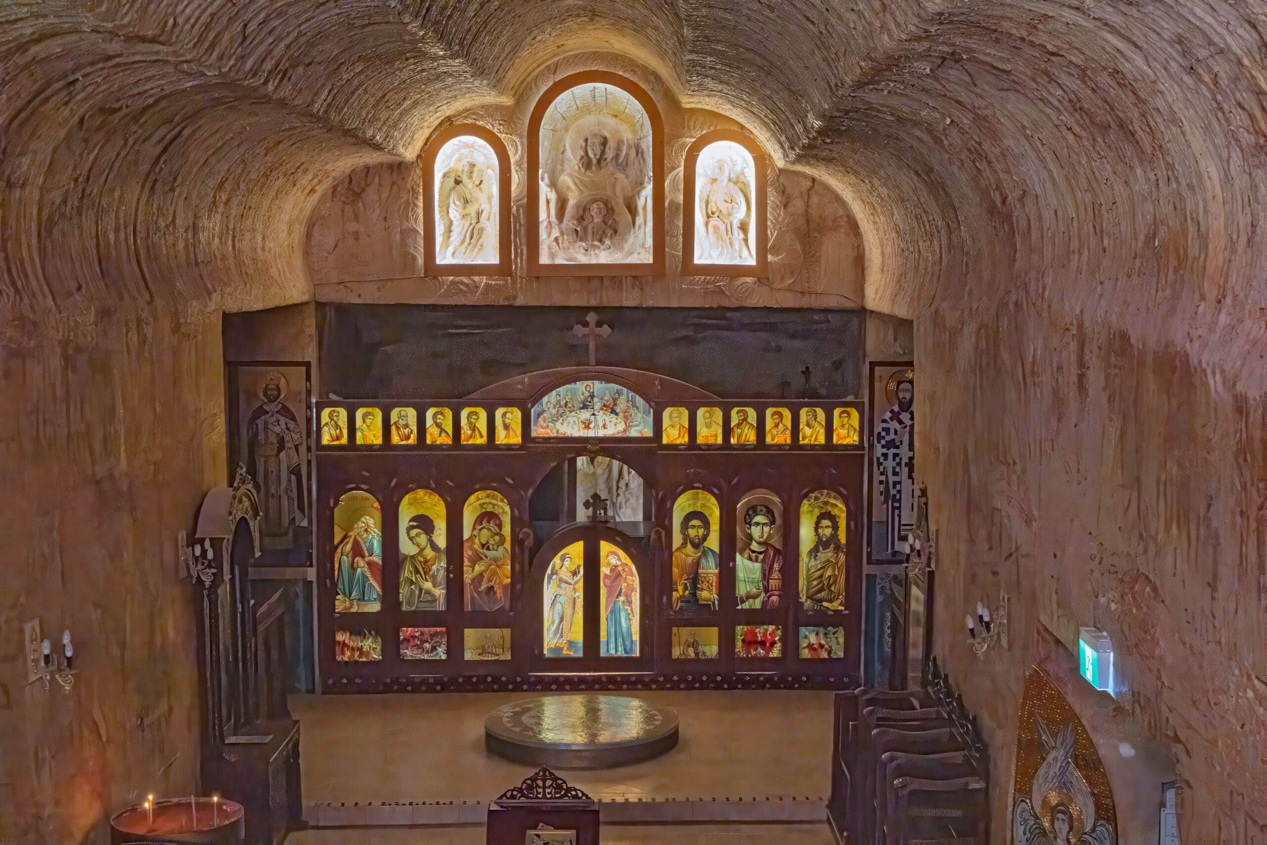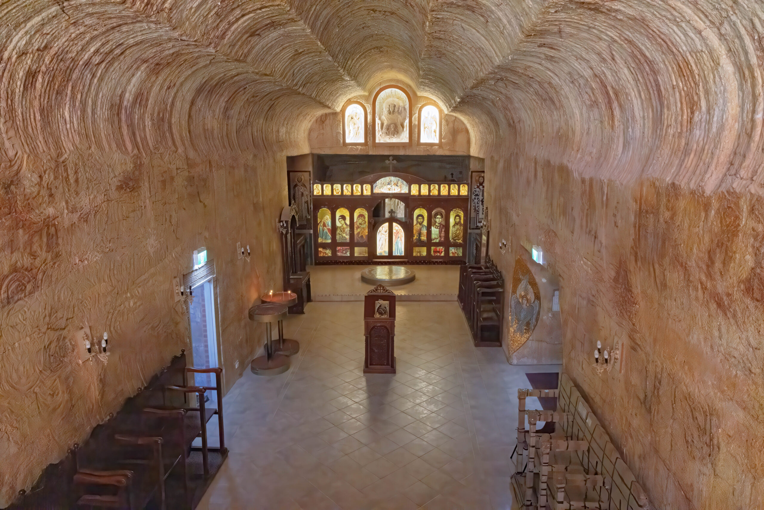 After sharing a delicious Turkish bread BLAT in the cafe at the Big Winch, we drove back down the hill to visit the Big Miner, who stands out the front of an opal jewelers shop on Simmos Street. Next on the agenda was the underground church tour of Coober Pedy. We started at the Serbian Orthodox Church which is spectacular. It was built, or rather carved into the hillside, in 1993 and is known officially as the Church of Saint Elijah, the prophet.