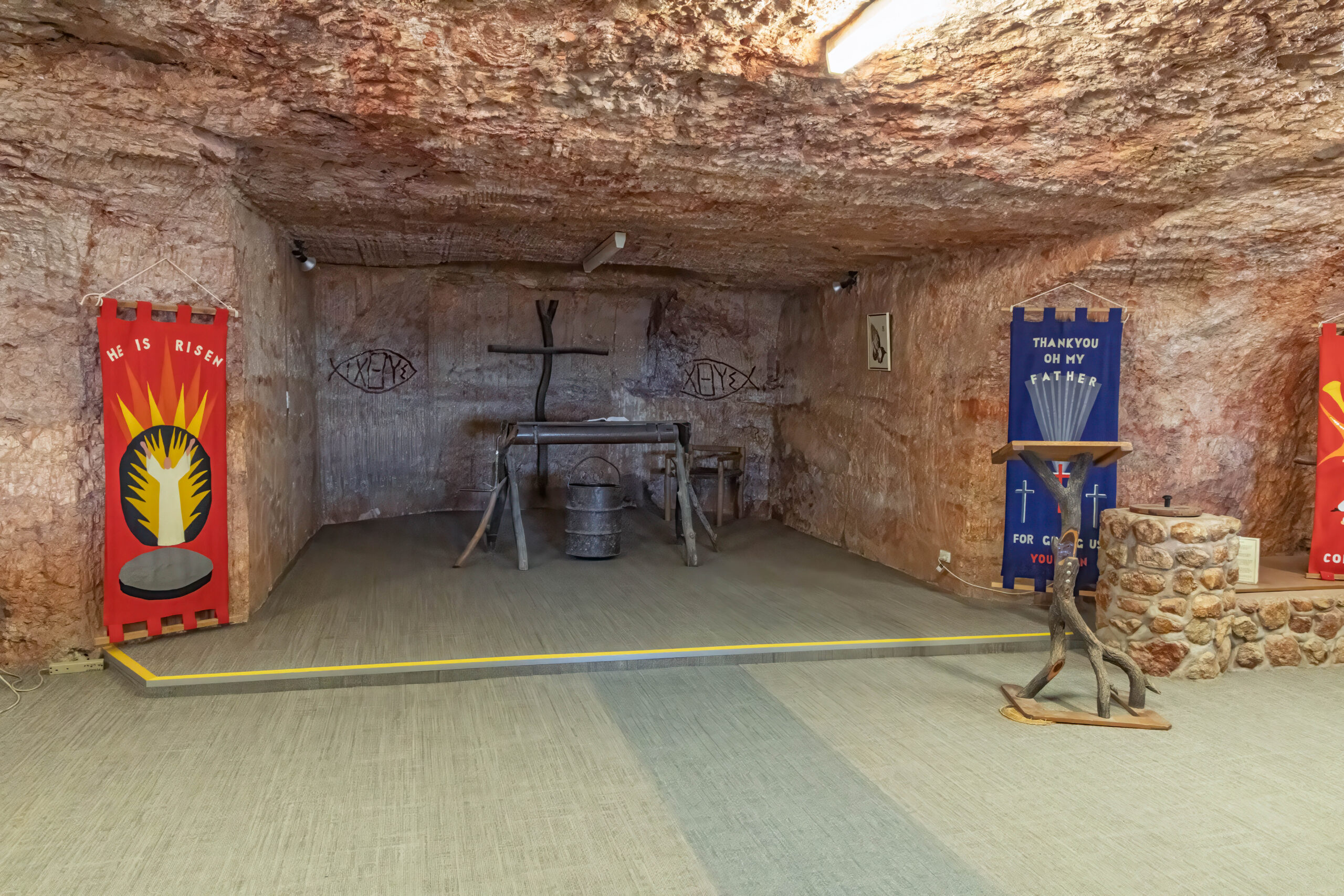 Our next stop was at the Anglican Catacomb Church of Coober Pedy. The church and rectory sites were originally dug for people to live in but were never completed and became available for the church to purchase. Services were commenced in the Rectory dug out in 1973. The Catcomb Church dug out was formally completed in June 1977, with services moving into that space thereafter. Because the space is underground and used by Christians, it was decided to name the church after the Catacombs of Rome, which were used by Christians in Roman times to bury their dead and escape persecution by the Roman Emperors.