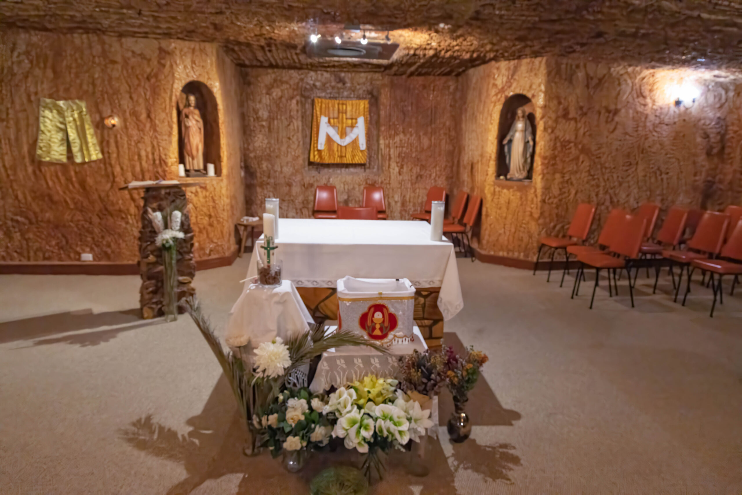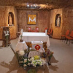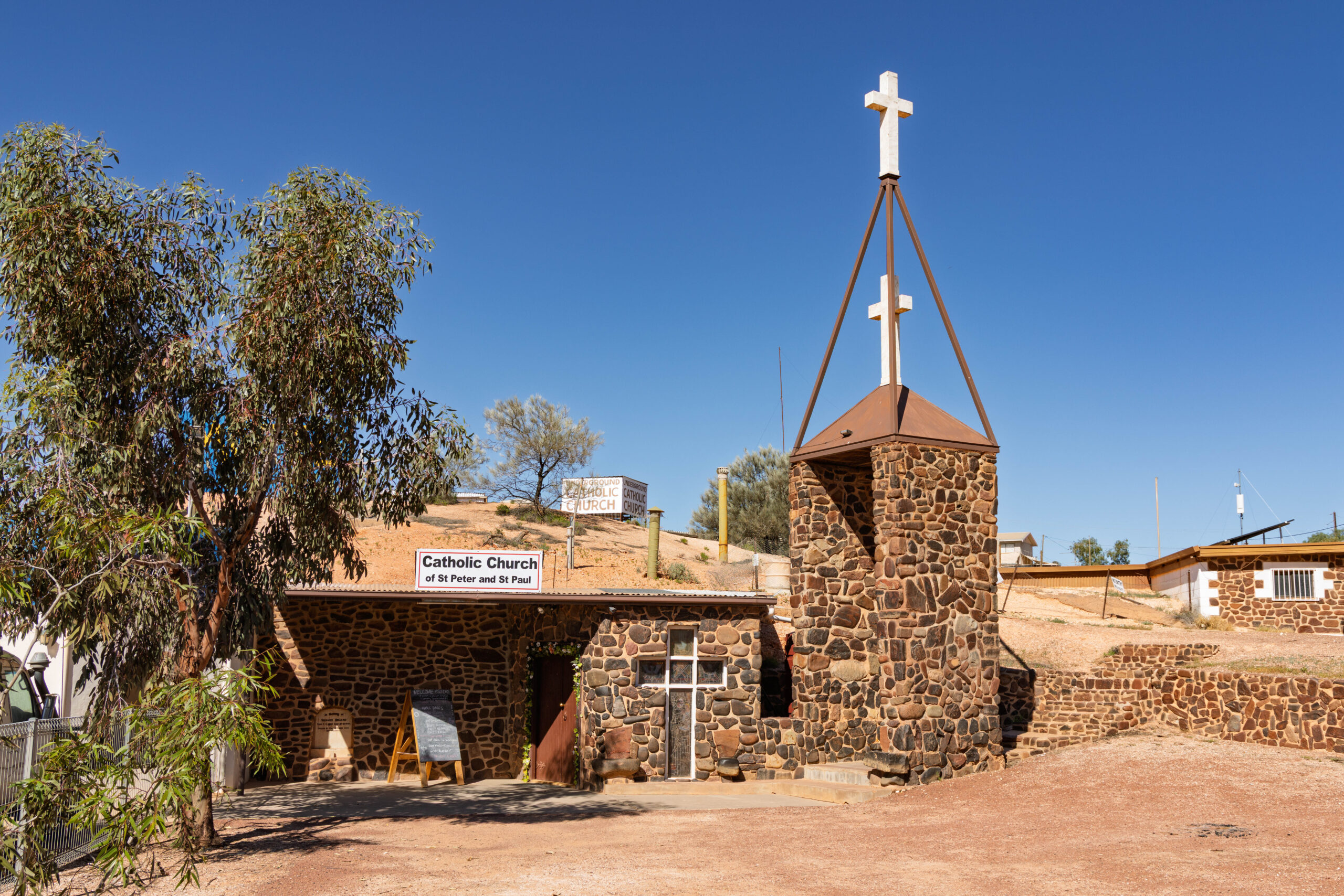 Next we drove to the St Peter & St Paul Catholic Church on Hutchison Street. There has been a priest based in Coober Pedy since 1965, caring for an outback flock in a huge parish that includes Uluru and borders Western Australia, the Northern Territory, Queensland and New South Wales. This small church dug into the side of the hill hosts services most Sundays … when the Priest is not out bush!