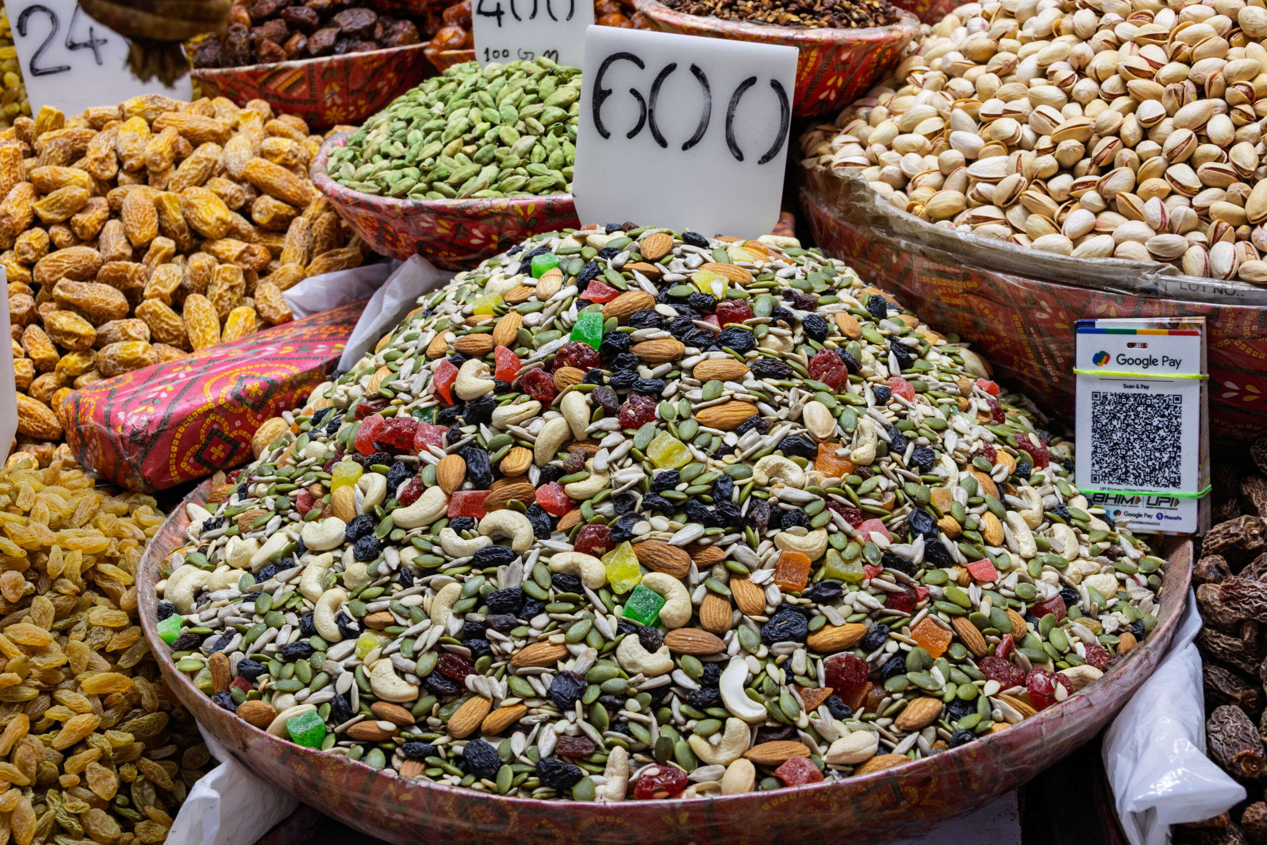 At the end of the street, we went for a walk through the spice market, which was quite an experience. The spices, teas, nuts and dried fruits displayed for sale presented us with an aromatic and colourful ‘feast’ for our noses and eyes. Others have been complaining about how bad the city smells, but we haven’t found it objectionable. We are the oldest members of the group (OMG when did we become the oldest ones in a tour group??) so maybe we don’t have as acute a sense of smell any more?? Anyhow, we COULD smell the delicious potpourri of spices!