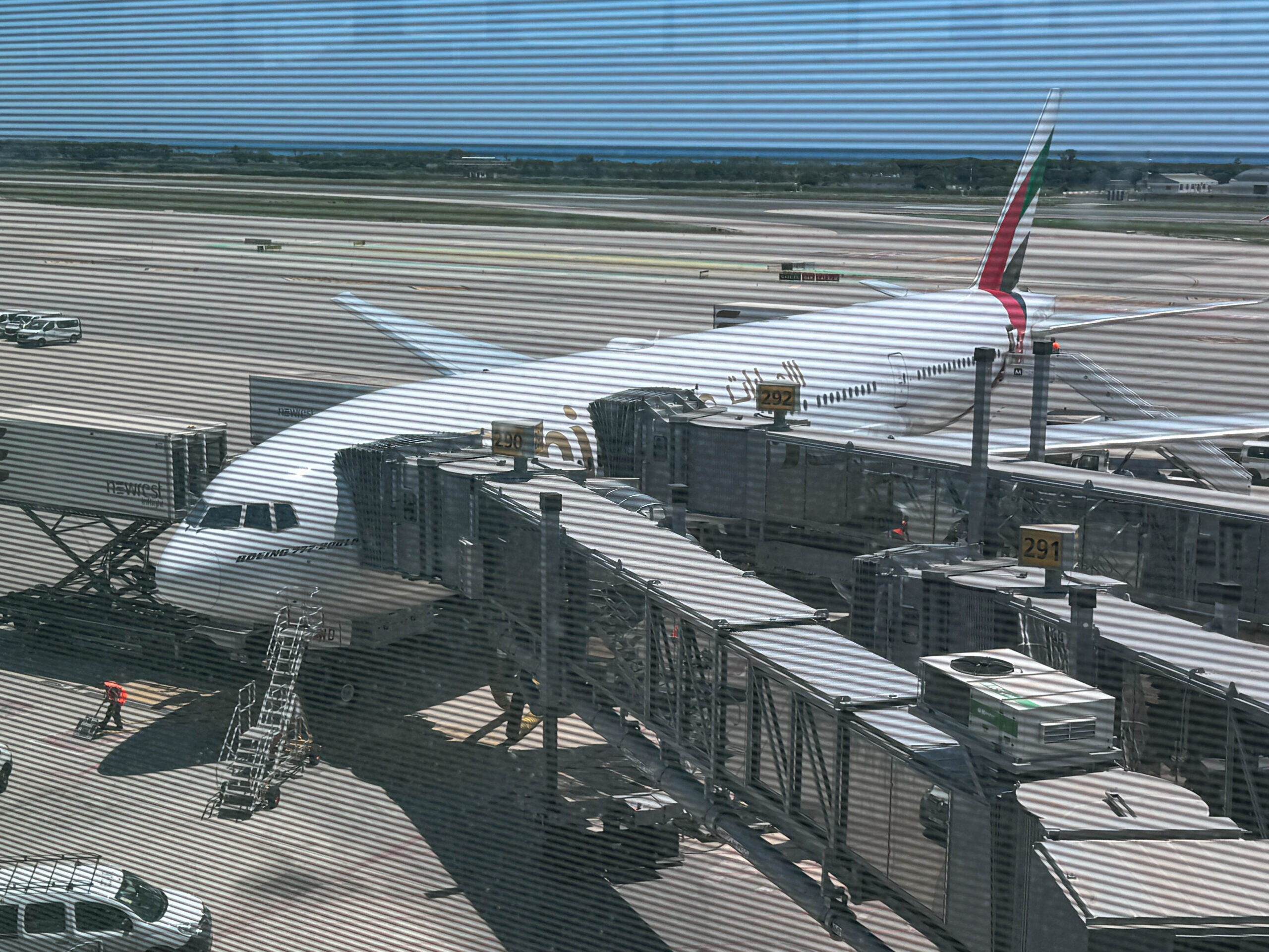 After all this fun we settled in to wait at the gate until flight time. There was no aeroplane at the gate when we arrived, so Bernie stalked it on Flight Radar. He discovered that it was flying in from Mexico City and was expected to arrive in Barcelona on time. Phew, it was good to know that we were looking good for an on-time departure to Dubai. Sure enough, the aeroplane pulled into the gate before 2.00pm leaving enough time for it to be serviced before boarding was due to commence at 2.45pm. While we waited, we tried to hydrate for the flight ahead and I dosed up on Panadol and Nurofen in the hope of managing my sinus situation. Double dosing has been keeping my snot under control on the ground, fingers crossed that it will assist in the pressurized cabin??