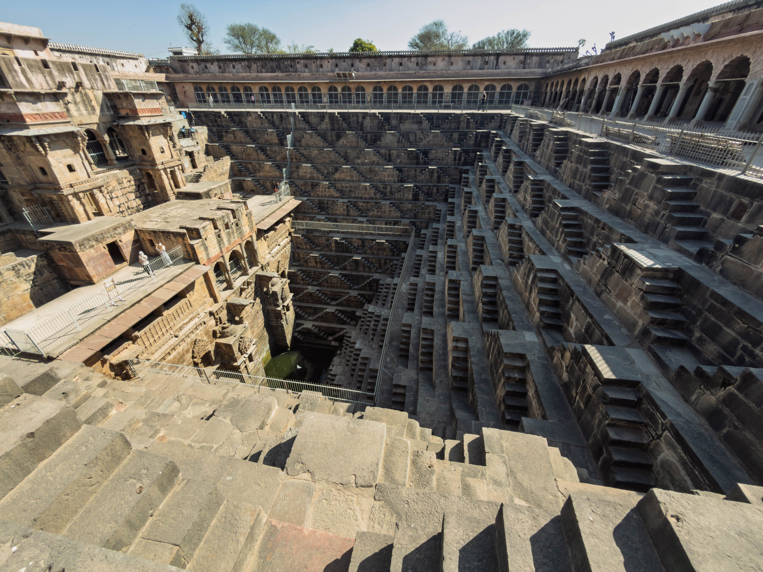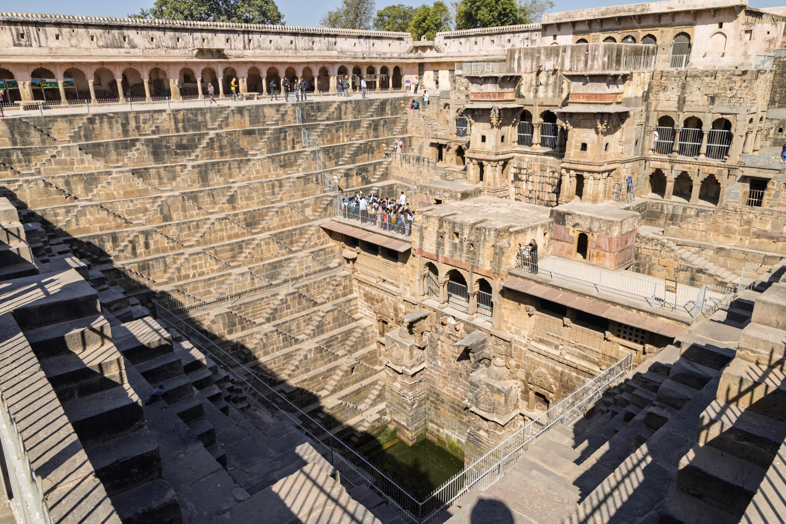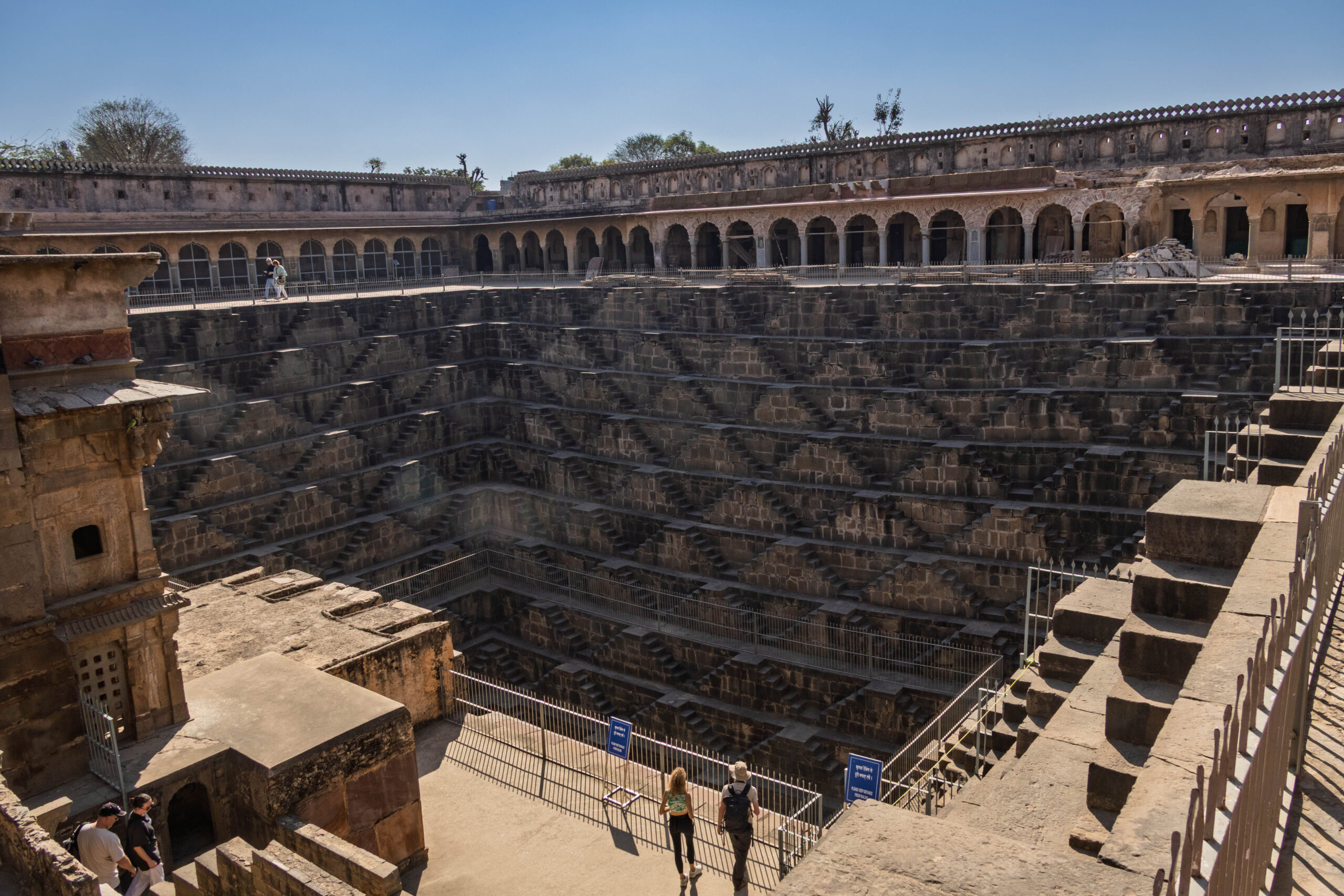 From the loos we made our way to the step well. It is believed that the Chand Baori Step Well has a religious connection and that’s the reason it was built in front of the temple. The well is an ancient (1,200-year-old) construction that acted as the village’s water catchment for centuries. Built from sandstone, there are steps built into each side of the huge, square well so that people could still access the water as the level went down and down … and down during the period between the wet seasons. An impressive structure.
