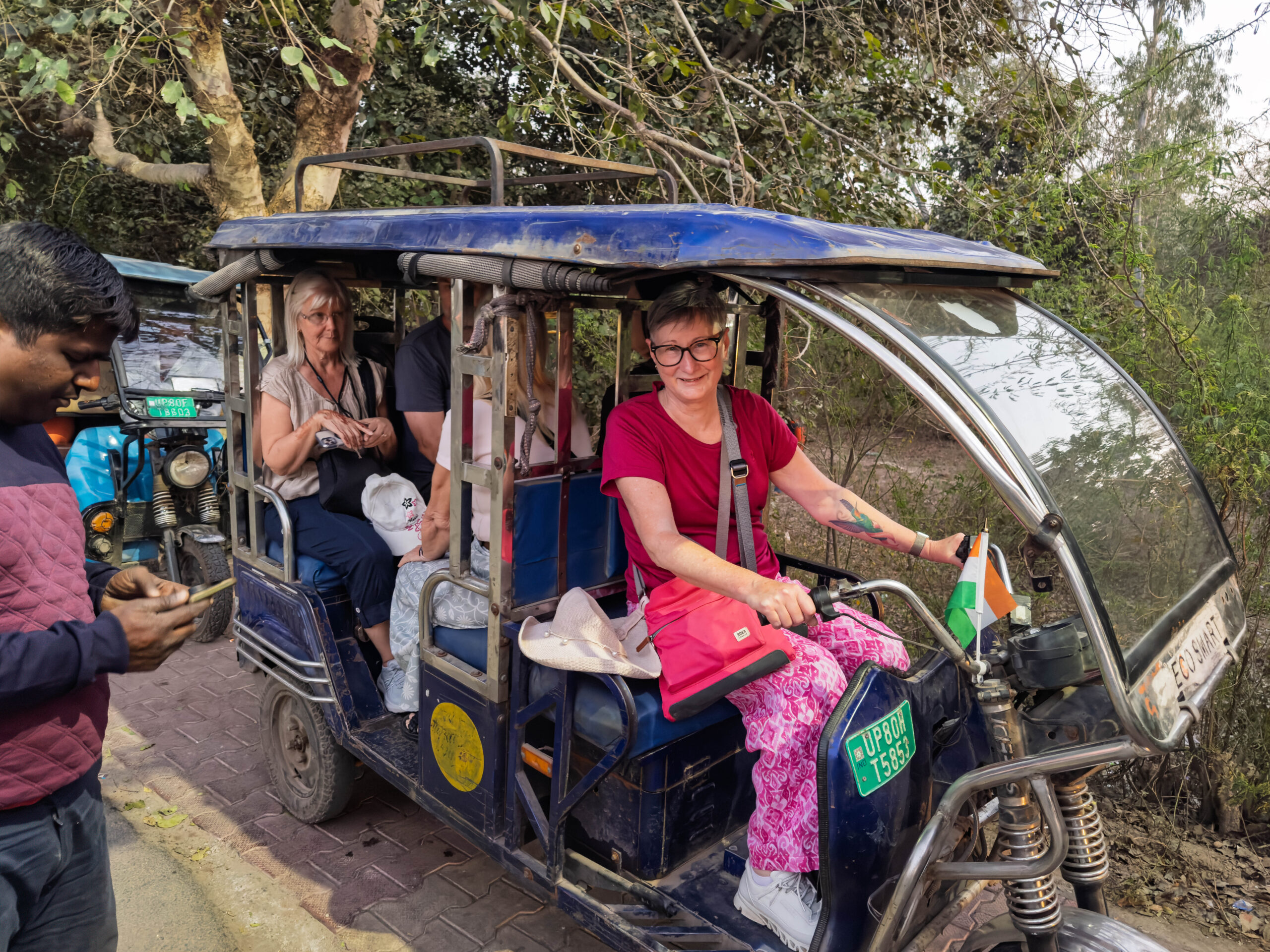 After the Red Fort we had the option to enjoy this world-famous city at leisure or choose an optional activity. We had already purchased the optional tour, along with most other member of the group. Chandresh encouraged the remaining two group members to join us, rather than return to the hotel. Although our itinerary said we would be travelling to the Itmad ud Daulah (‘Baby Taj’) in an air-conditioned vehicle, Chandresh made it more of an adventure by arranging for us to take electric rickshaws. He told us that the bus would have to drive many kilometres to use the bridge suitable for heavy vehicles and this would take much more time than crossing on the nearby bridge in a convoy of small vehicles. Well, not really a convoy because I think our drivers all took their personal favourite route AND, in the afternoon traffic there was no chance of travelling in convoy.