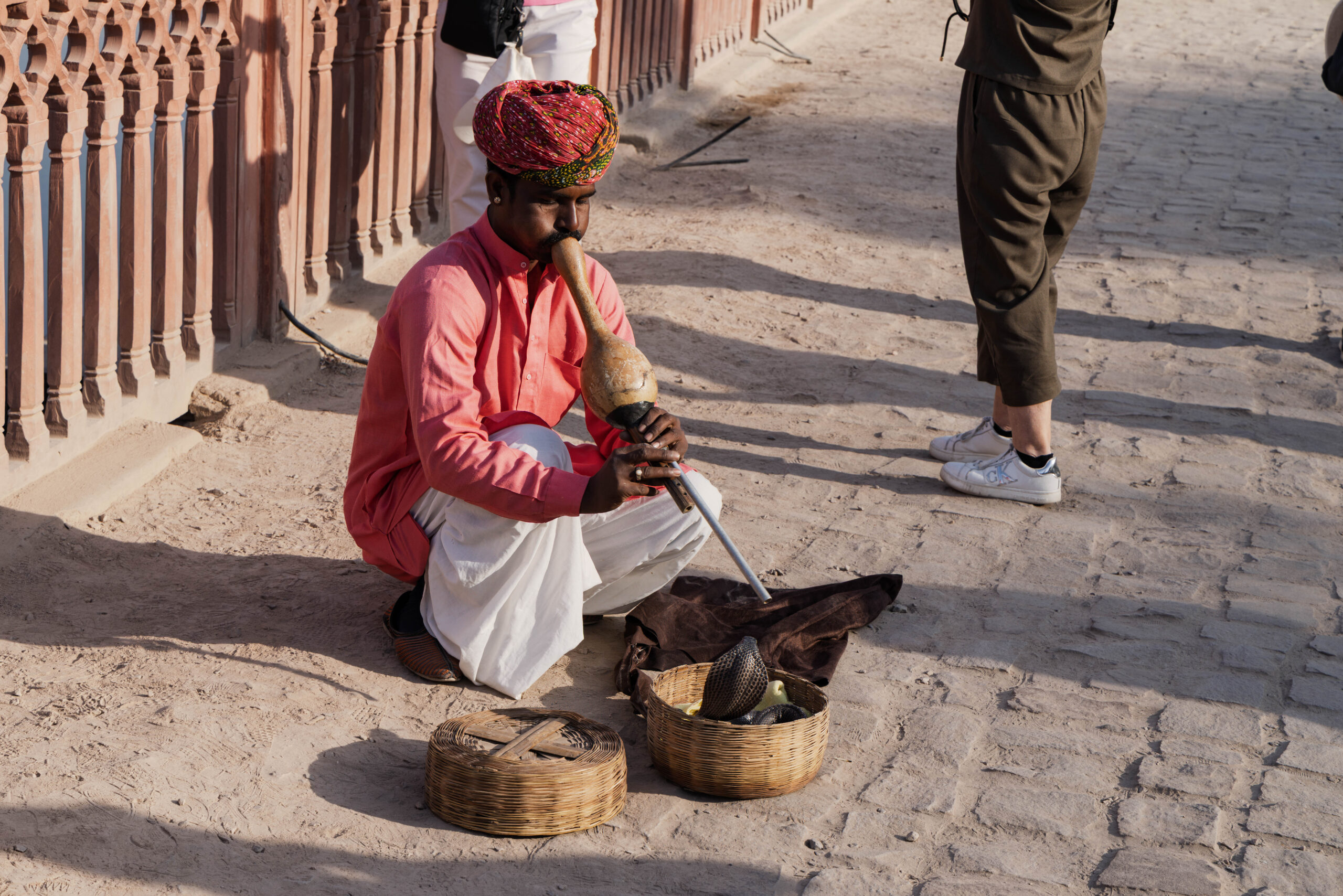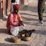 This morning after breakfast, eight of us set out for the Amber Fort located 11-kilometres from Jaipur. Unfortunately our group was reduced to eight with a couple of group members feeling a little under the weather today. On our way out of Jaipur we passed Man Sagar Lake and the mist shrouded Jai Mahal (Water Palace) with Chandresh telling us that we would return for photos later in the day when the light would be better. Arriving at Maota Lake, our first view of the Amber Fort across the water was spectacular. The viewing area was total chaos, packed with tourists and vendors trying to sell their wares to the tourists and … a snake charmer or two. Ugh, I tried to keep plenty of distance between me and the crazy men with cobras in their baskets!