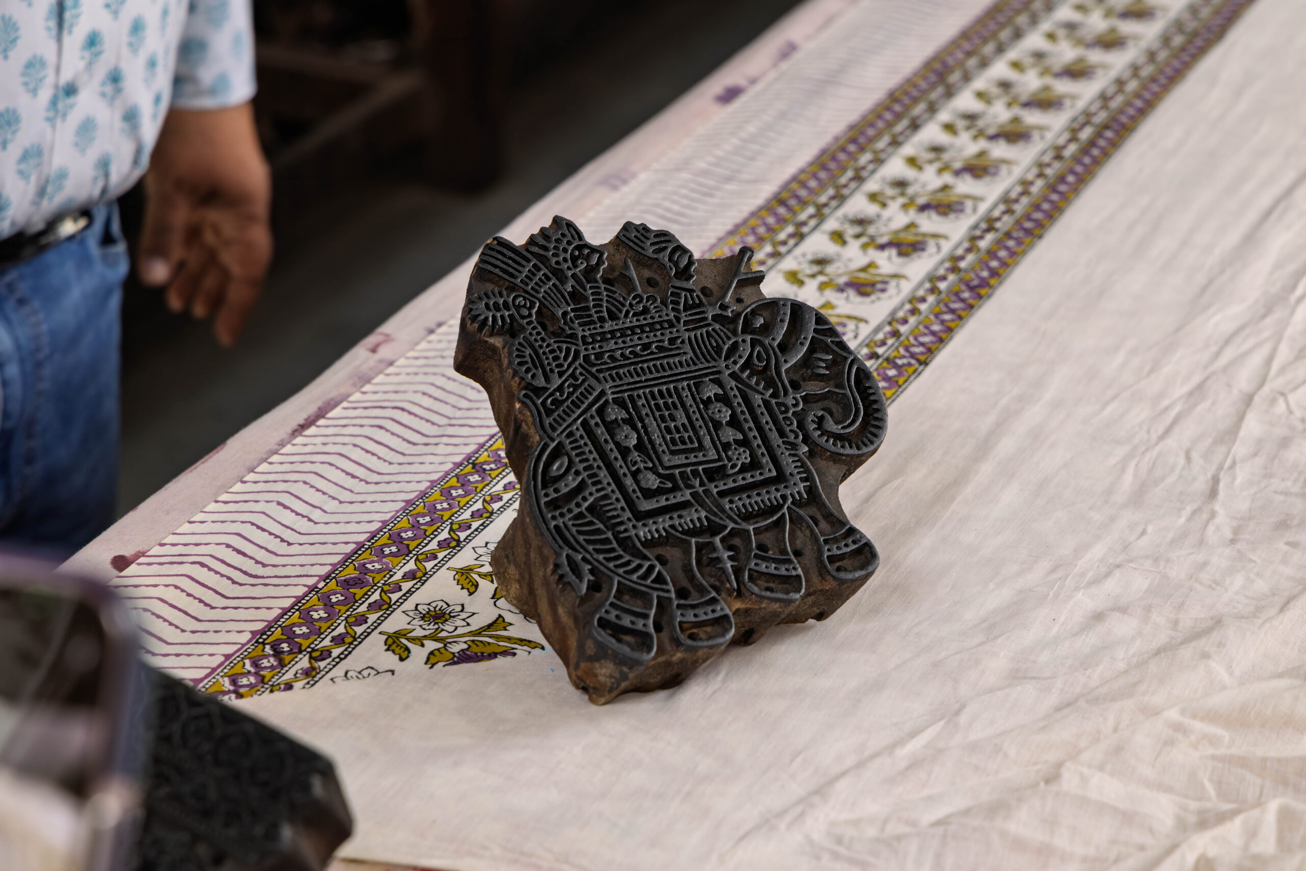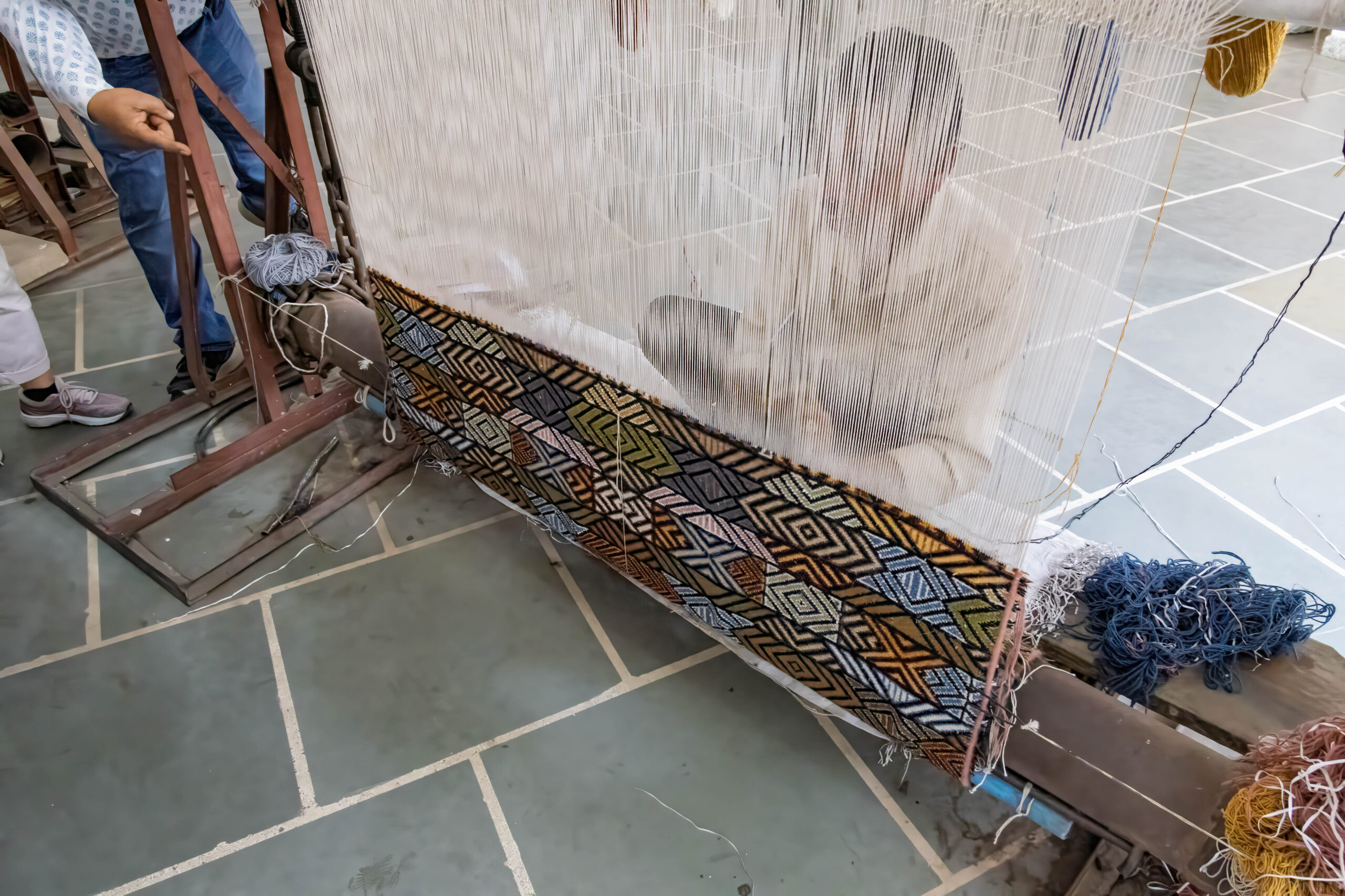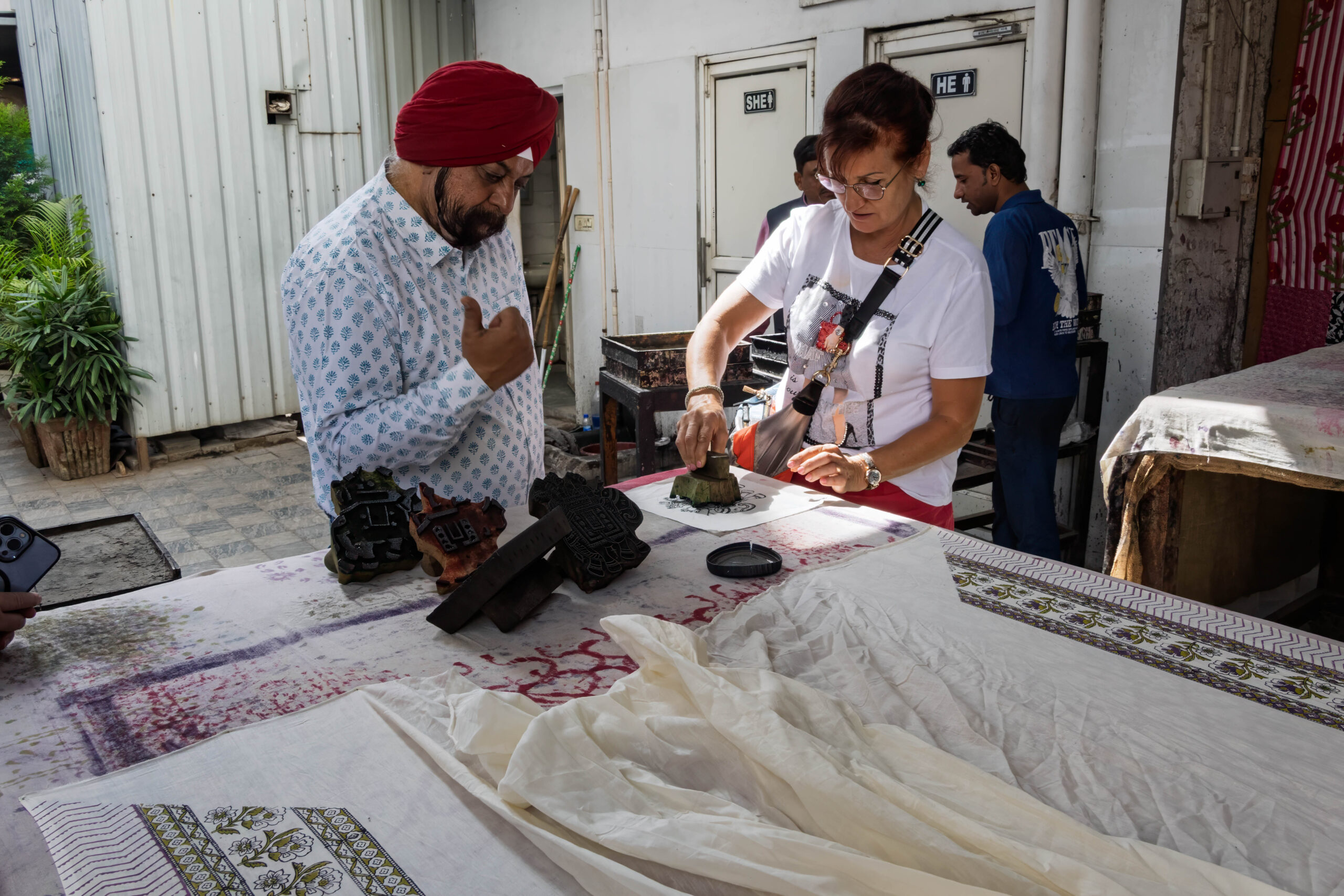 Karamvir drove us back into Jaipur to the Paliwal Carpets and Textile Factory. The factory is a Government sponsored cooperative that employs (I think it was about 4,500) locals. Our first demonstration was the block printing of fabric. As a sewer I found it really interesting as we were walked through the printing, setting and washing phases of printing the cloth.