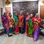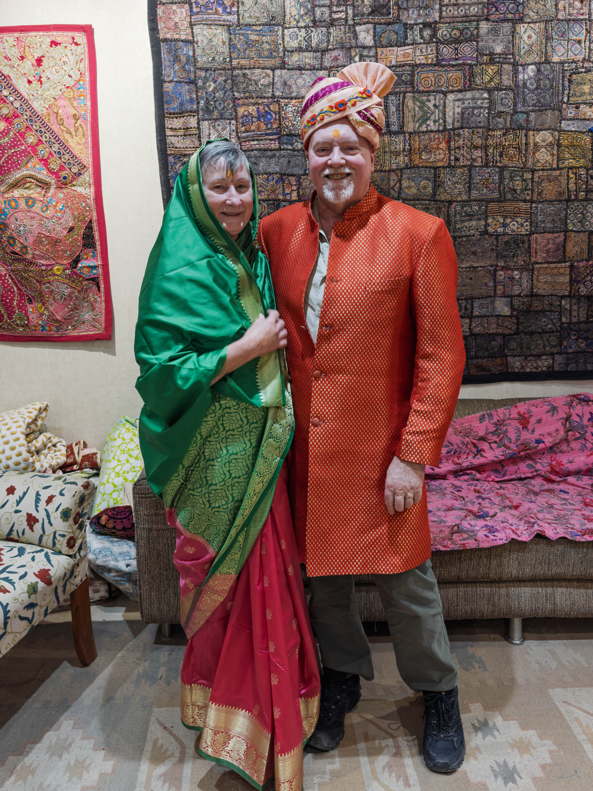 We were escorted to another room, where we participated in a sari wrapping demonstration. That was a bit of fun with nearly all of the girls getting wrapped up in colourful 6-metre lengths of sari silk and having stick on bindis from a peel off sheet added to the sandalwood spots on our foreheads. Bernie was even persuaded into a bright orange Nehru jacket before posing with his harem – first wife by his side, ha, ha. With the only other man in our group out of action today it was just Bernie and the girls on tour today.