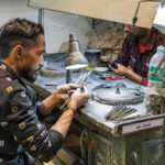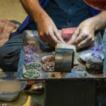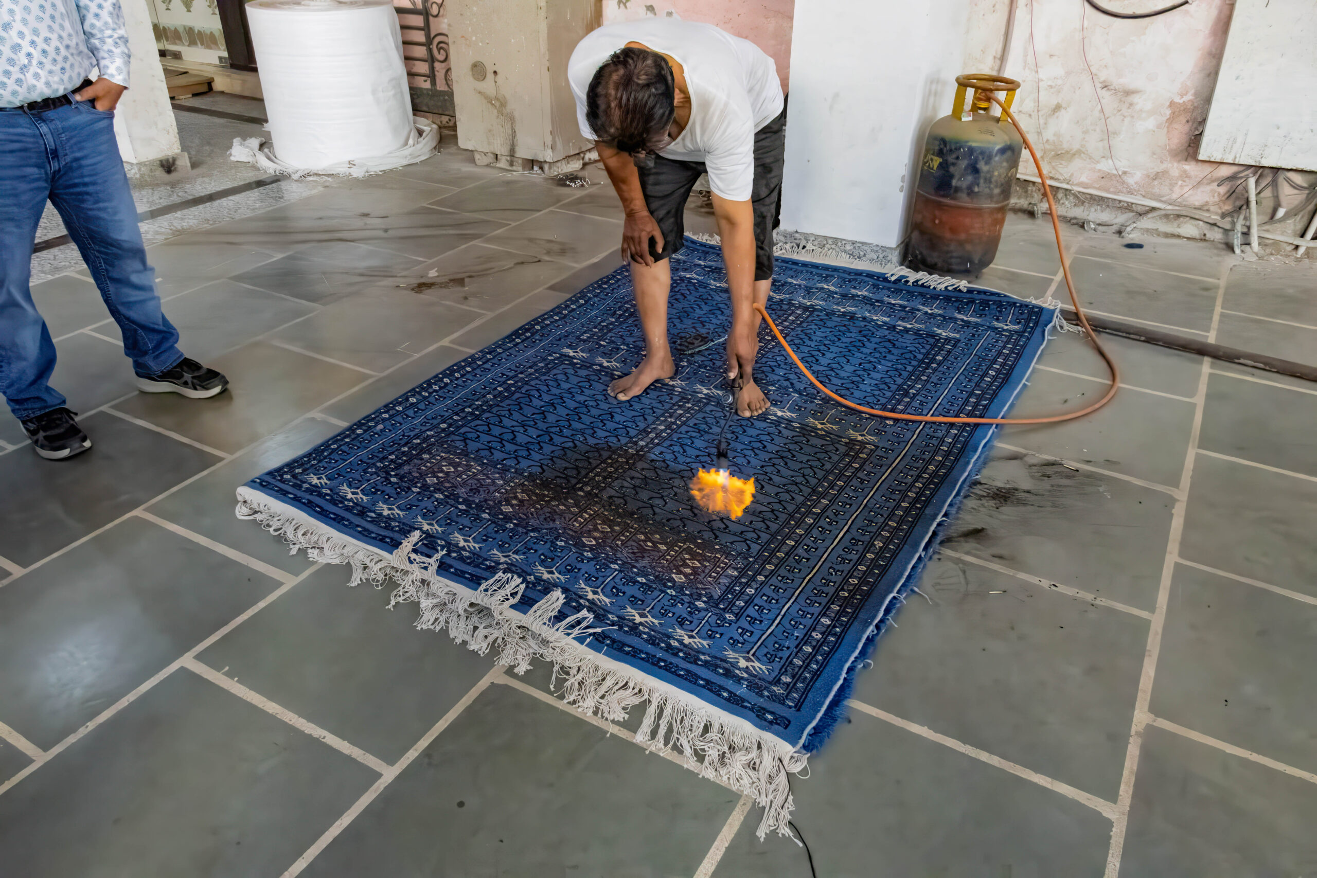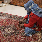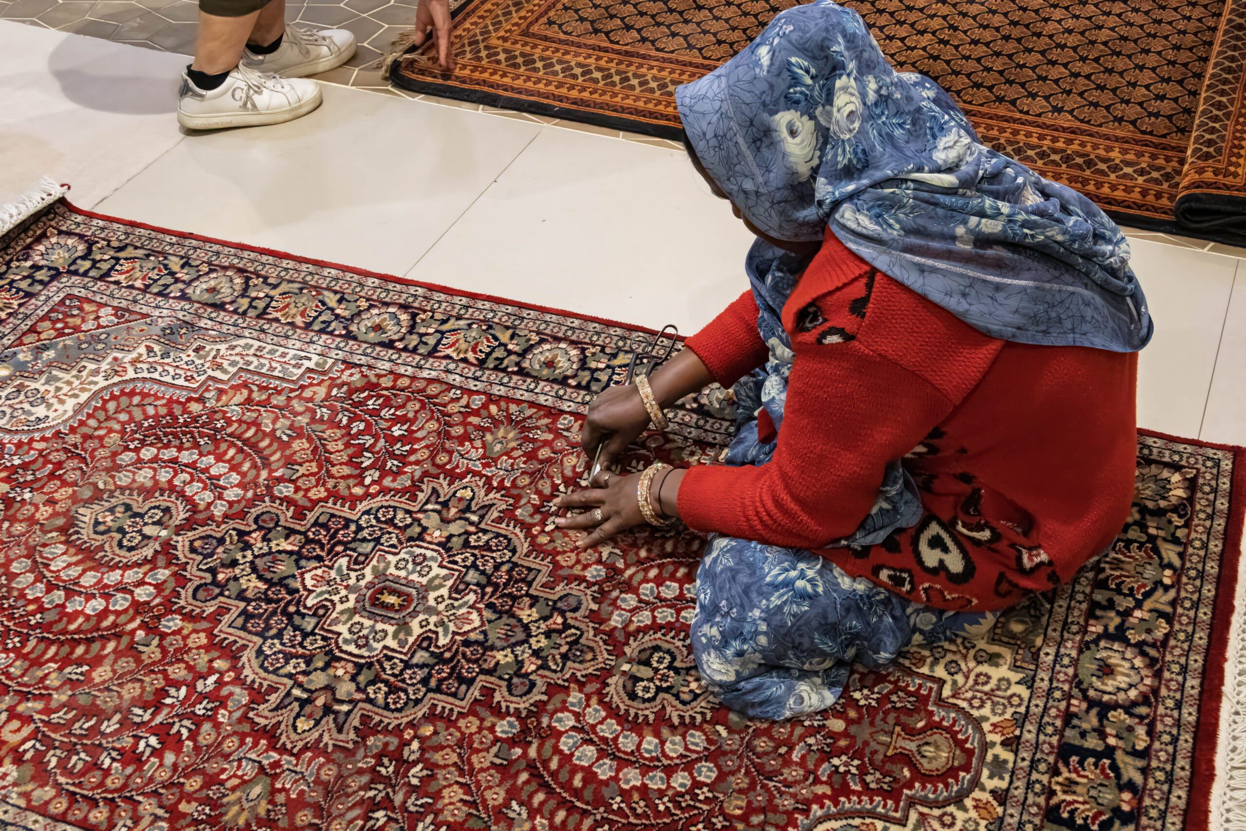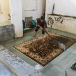 Next, we were able to watch two rug weavers at work on their looms, as our guide explained that they weave camel wool and fine silk carpets at the factory. After that we were shown the finishing processes where they singe the waste from the back of the carpets and then wash them. Upstairs we observed a couple of women hand finishing the carpets by plucking out any stray threads that distracted from the overall pattern of the carpet. Incredibly fine work requiring excellent eyesight and a sharp pair of scissors.