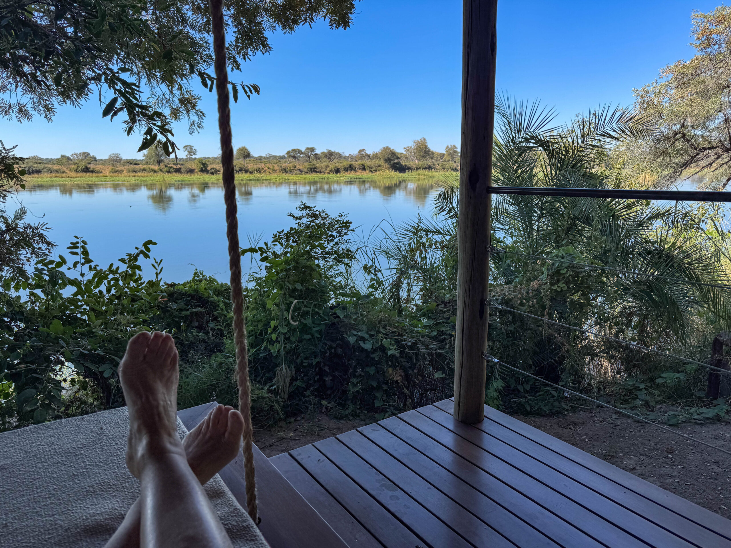 We returned to the restaurant for some toasted sandwiches for lunch and then we were able to enjoy a couple of hours to ourselves. Bernie took the laptop to the restaurant area where the wi-fi was available to process some photos, while I set myself up on the swinging day bed to write my travel diary. I had barely started when I heard grunting that I thought might be a hippo. I tried to lock up with the multitude of keys on our key ring, then raced up to the restaurant decking where there were indeed hippos frolicking in the water a short distance from the deck. Cool.