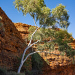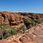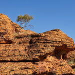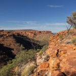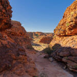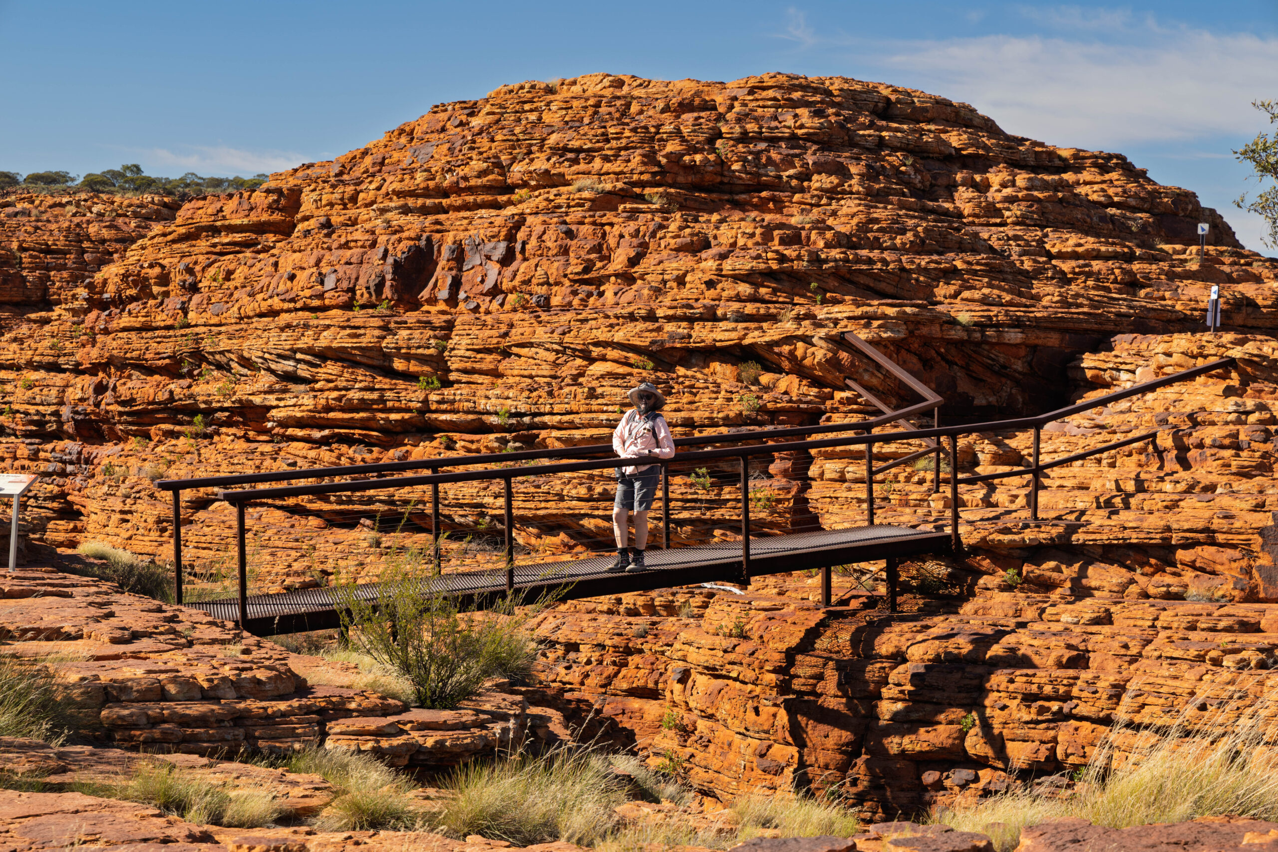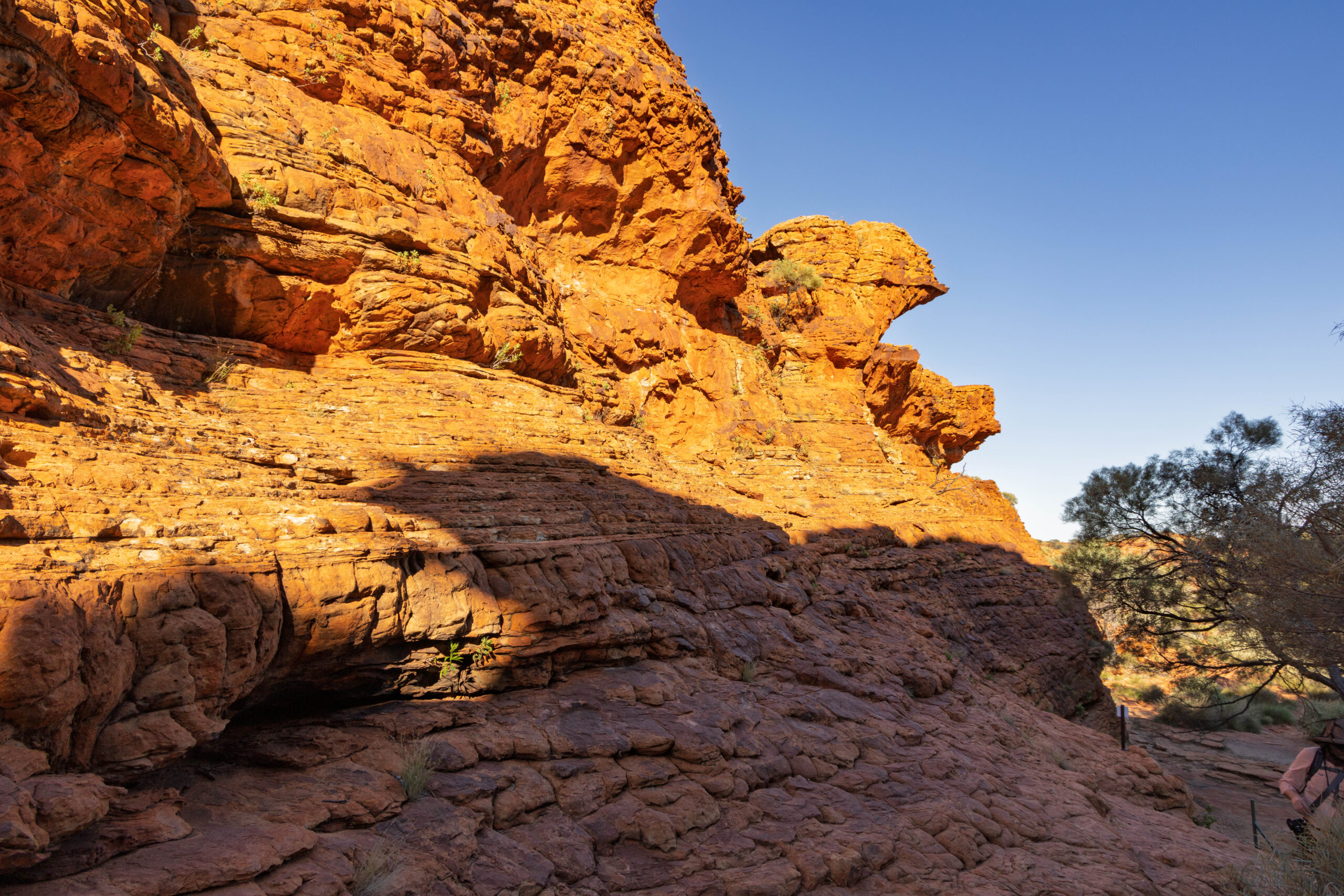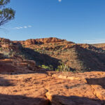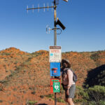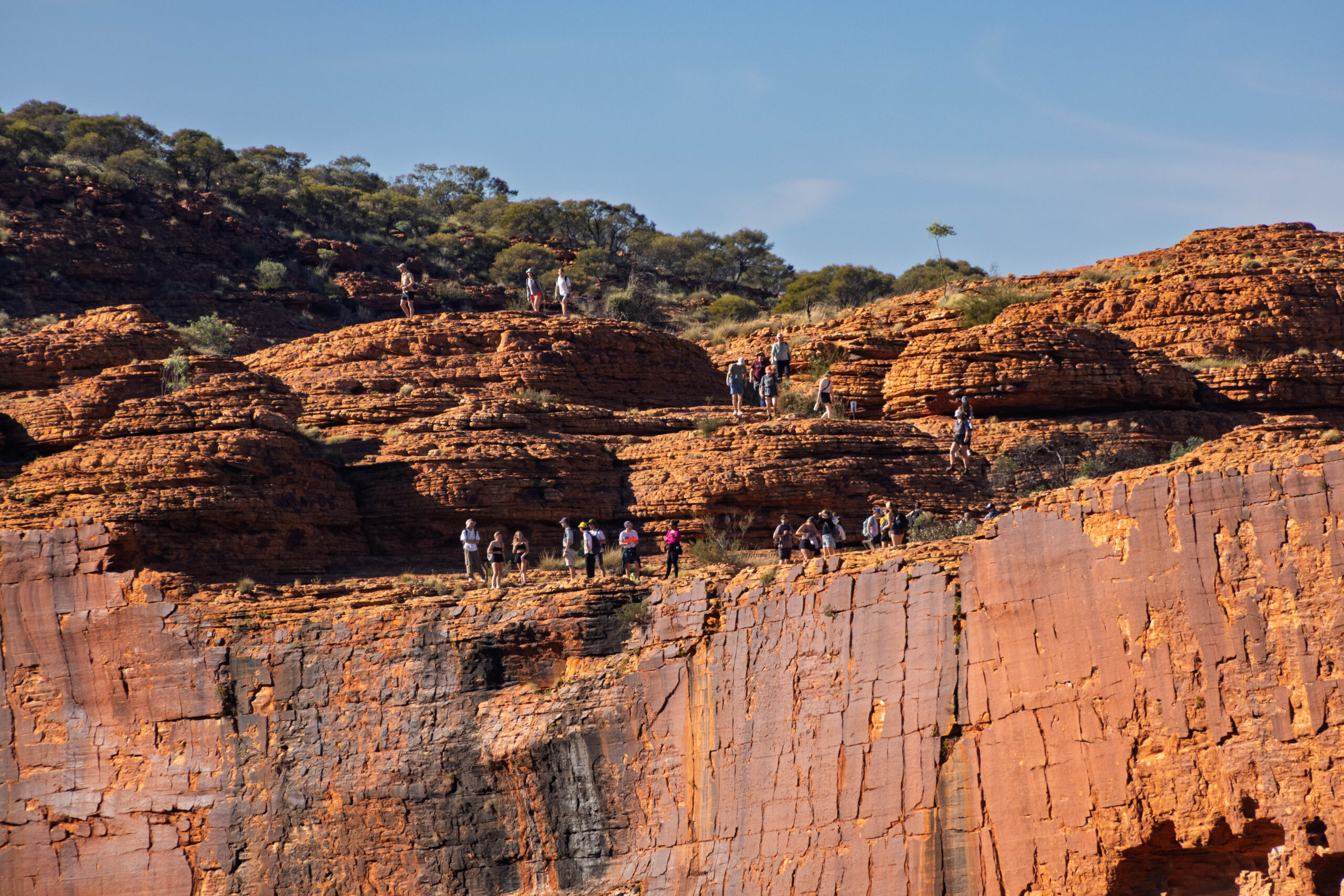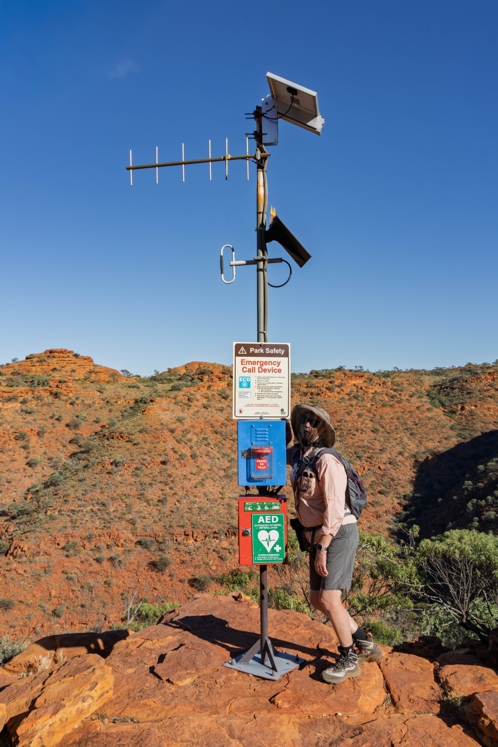 After breakfast, we drove out to Watarrka National Park to undertake the Kings Canyon Rim Walk a six kilometre loop graded Moderate but … with a hard section at the beginning of the walk. Yup, it was a steep climb on rock steps to the top of the canyon. You know it’s a hard climb when you arrive at the top to be greeted with a defibrillator and emergency radio!! Fortunately neither of us needed that yet.