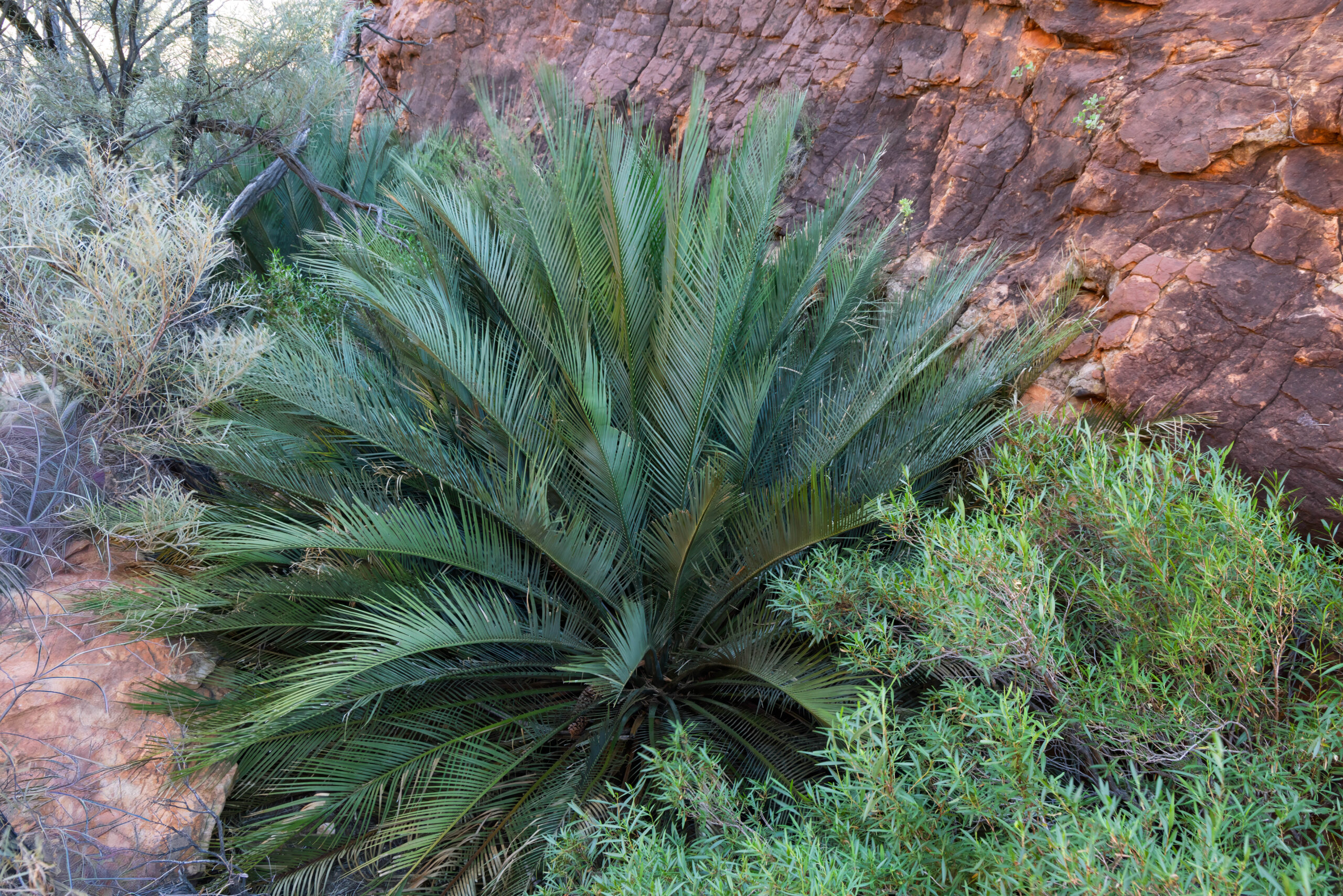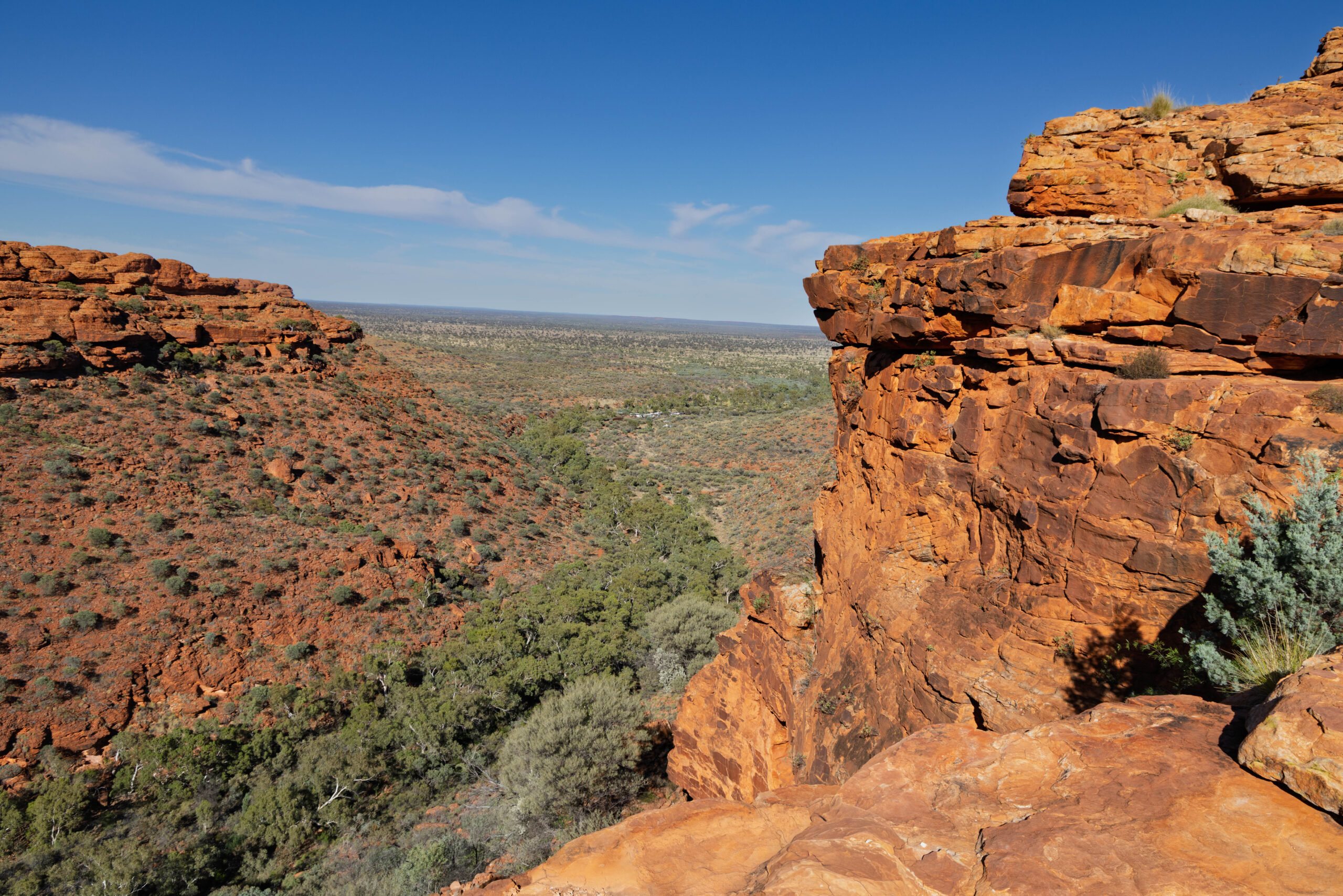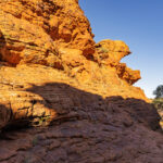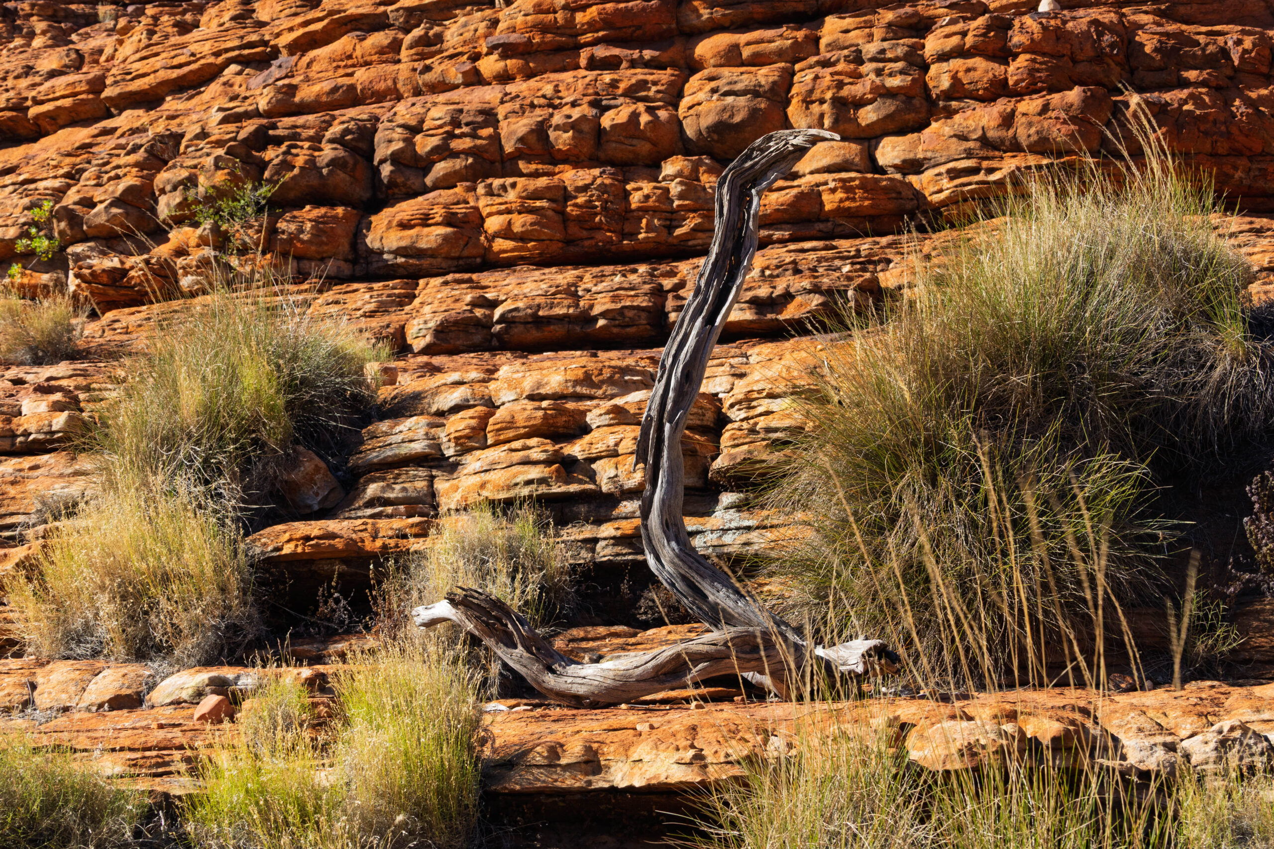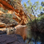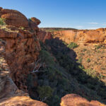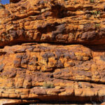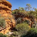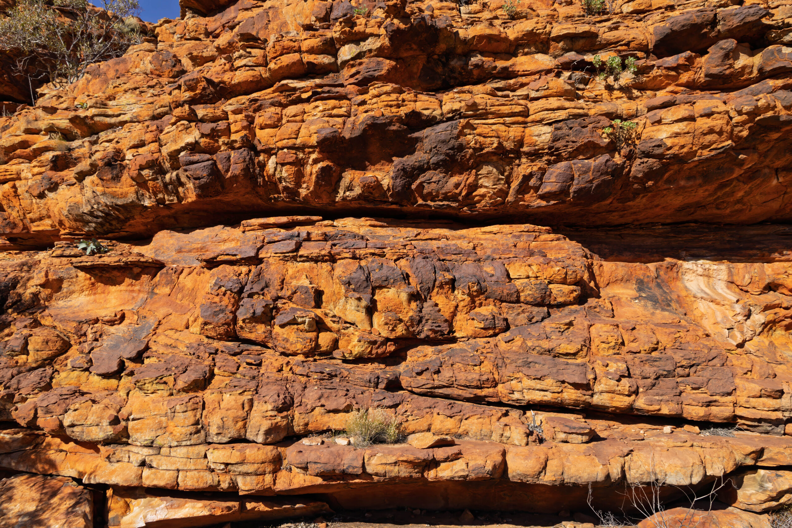 Where we were now standing in the George Gill Range, at the intersection of three major landforms. To the north-east the MacDonnell Ranges, to the south and west the sand plains of the Lake Amadeus region and the western deserts and to the south east the low hills and mesas of the Simpson Desert. The rocks beneath our feet started as sand dunes 400 million years ago before becoming Mereenie Sandstone, consisting of tough quartz grains cemented with silica. Beneath this hard cliff top surface lies Carmichael Sandstone, a more crumbly sandstone consisting of softer minerals mixed with quartz. The canyon started forming when cracks occurred in the Mereenie Sandstone allowing water to erode the softer Carmichael Sandstone beneath it.