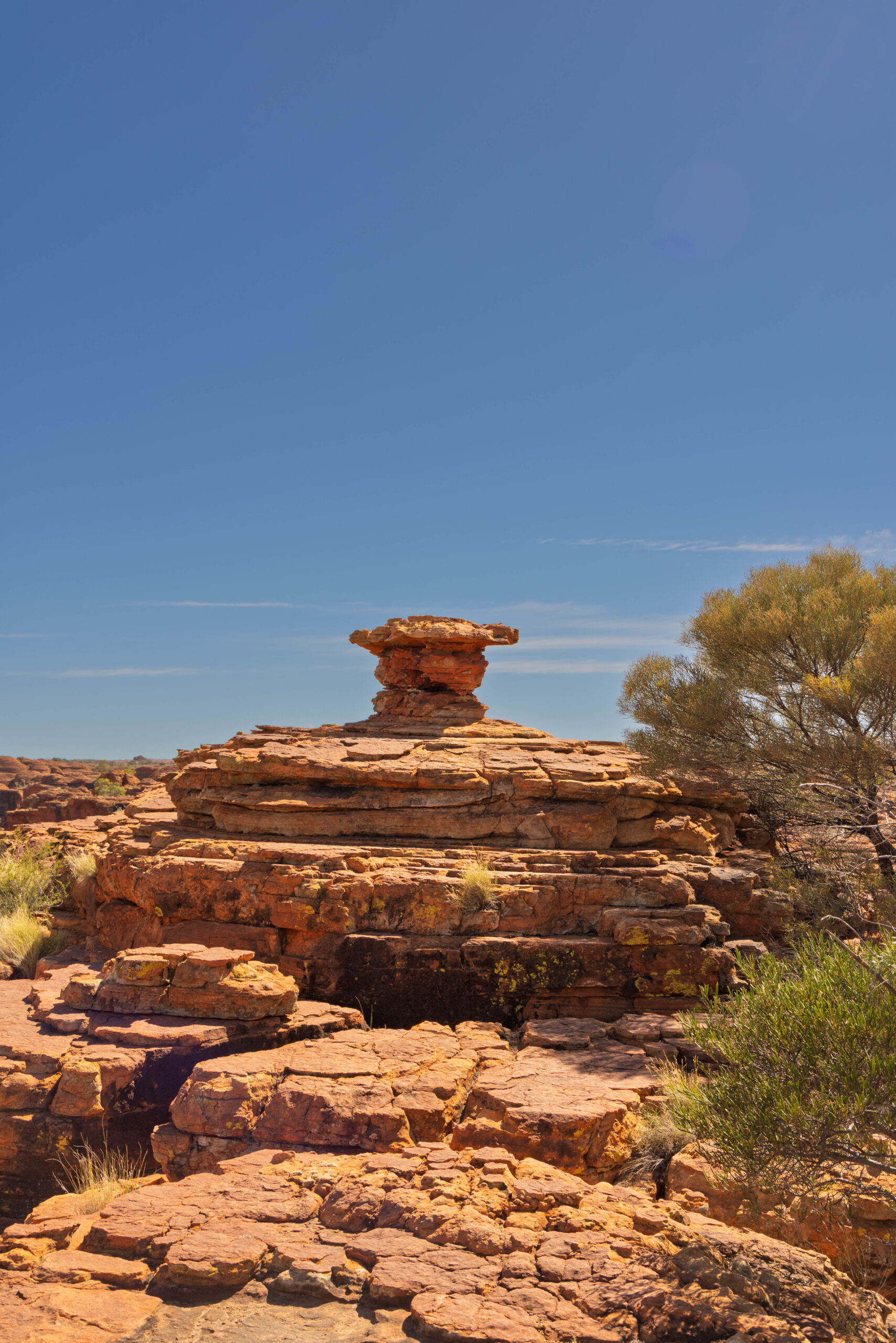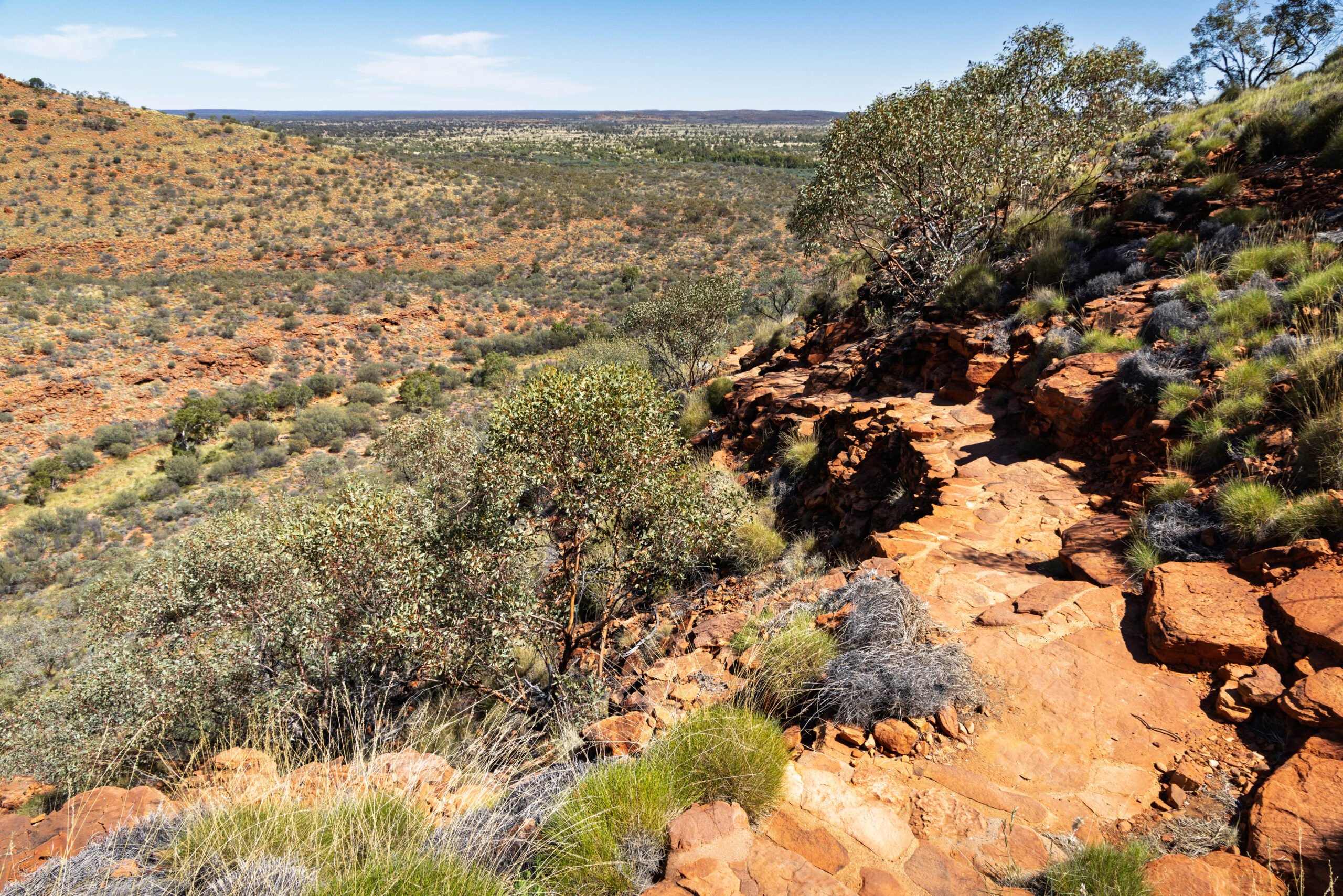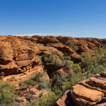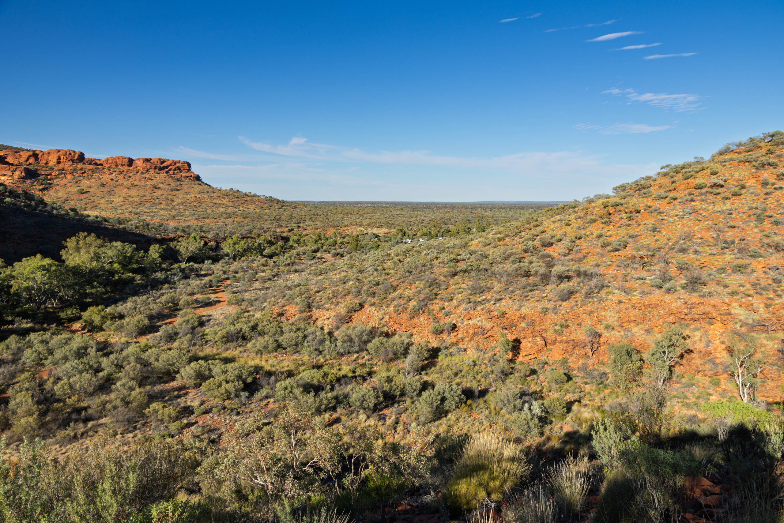 Where we were now standing in the George Gill Range, at the intersection of three major landforms. To the north-east the MacDonnell Ranges, to the south and west the sand plains of the Lake Amadeus region and the western deserts and to the south east the low hills and mesas of the Simpson Desert. The rocks beneath our feet started as sand dunes 400 million years ago before becoming Mereenie Sandstone, consisting of tough quartz grains cemented with silica. Beneath this hard cliff top surface lies Carmichael Sandstone, a more crumbly sandstone consisting of softer minerals mixed with quartz. The canyon started forming when cracks occurred in the Mereenie Sandstone allowing water to erode the softer Carmichael Sandstone beneath it.