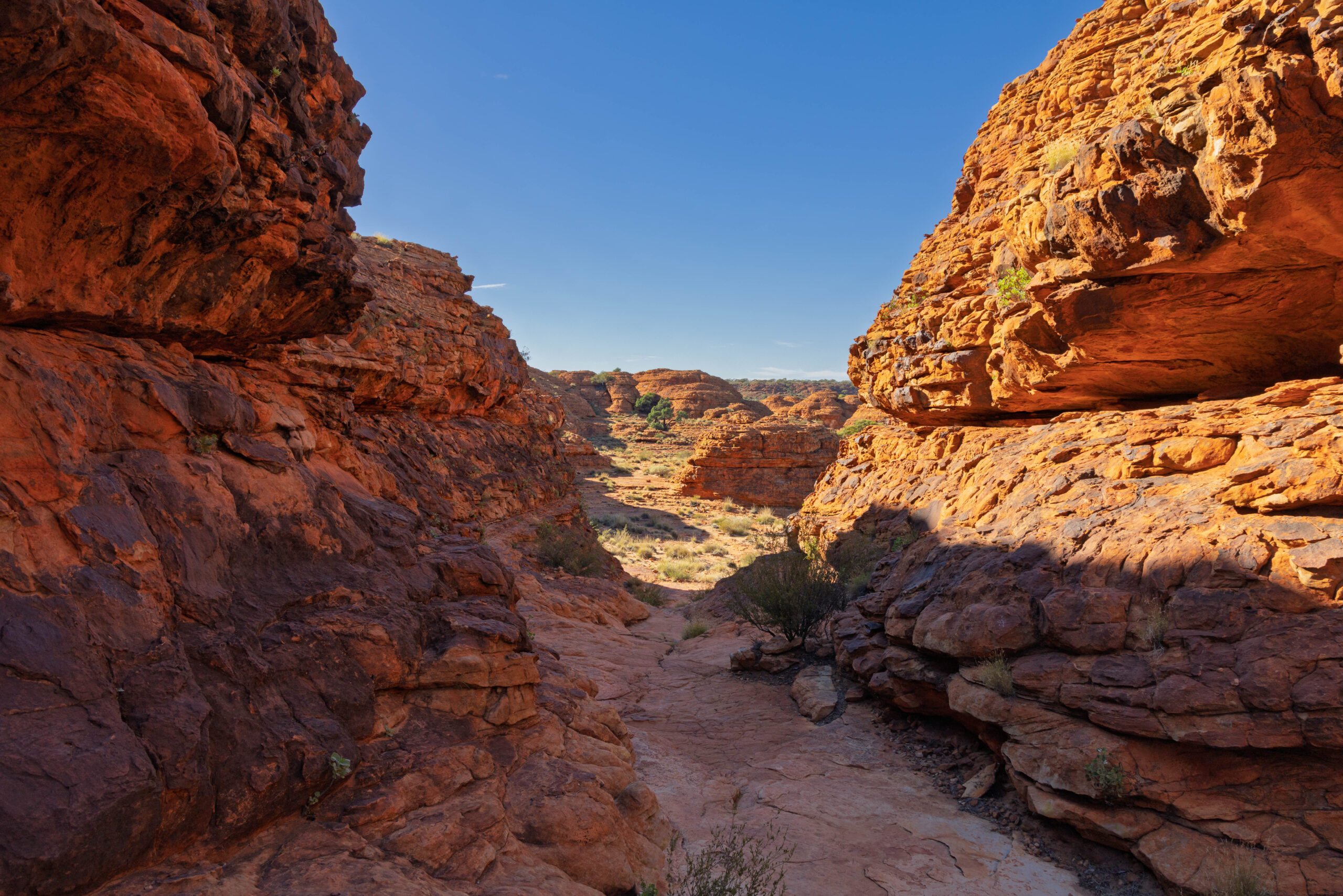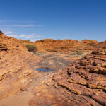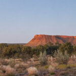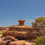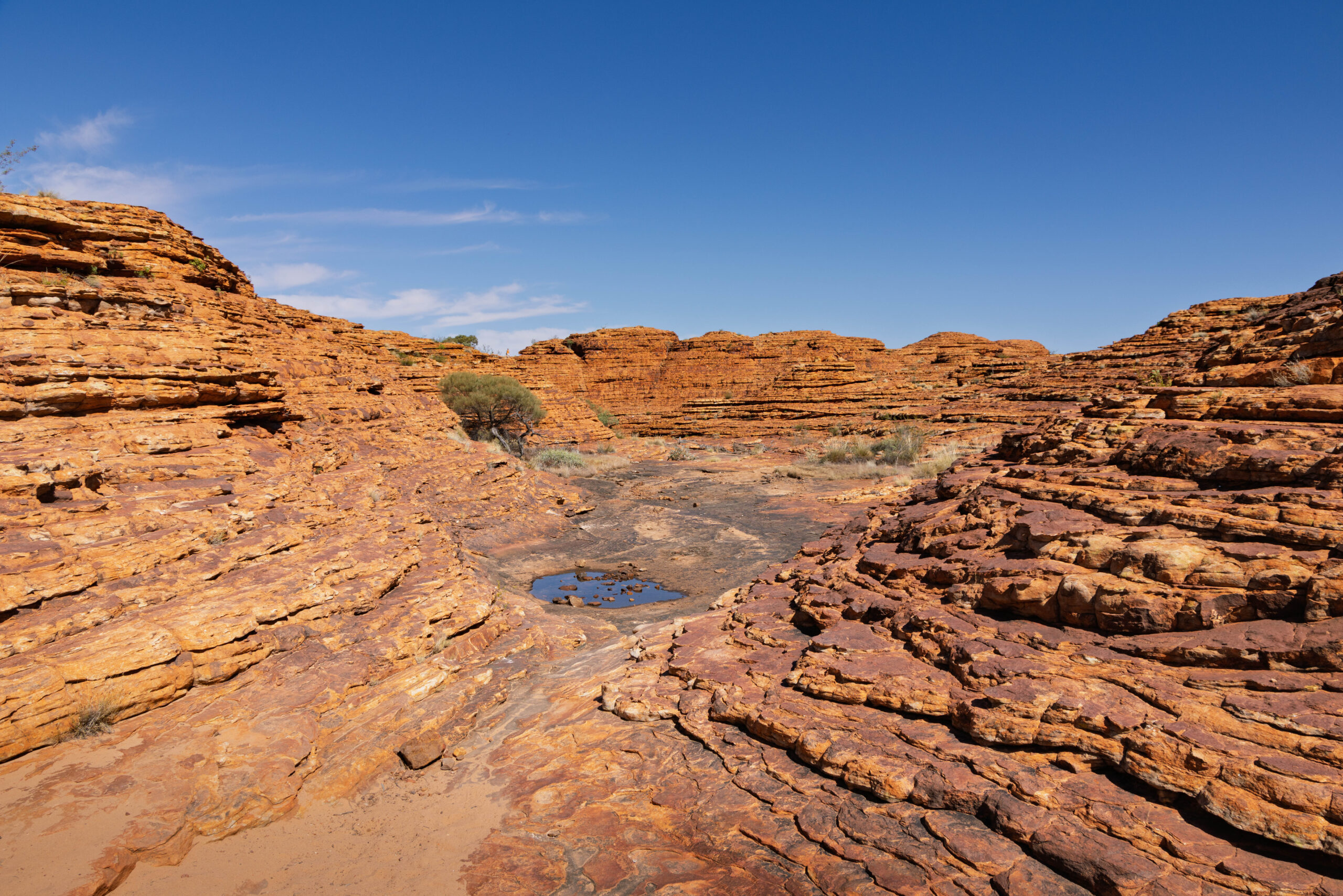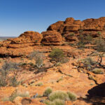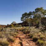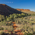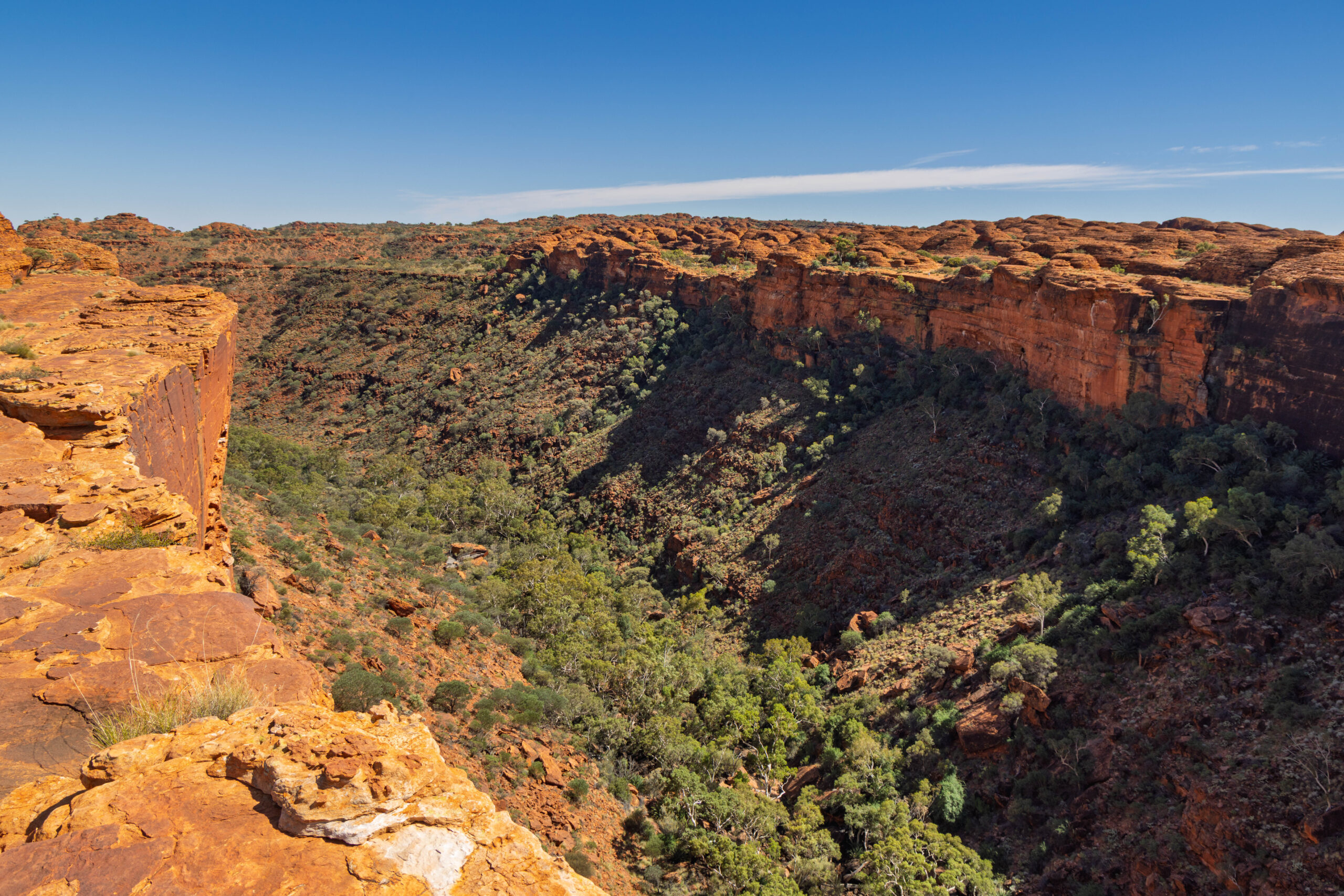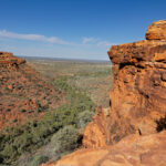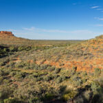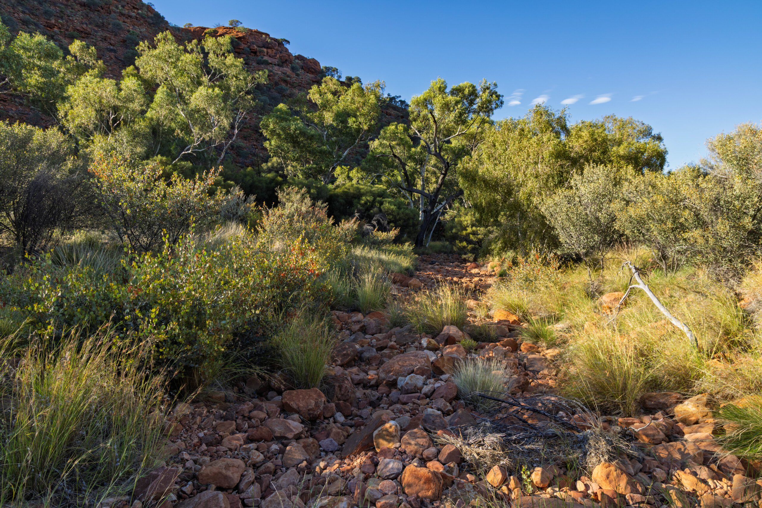 Where we were now standing in the George Gill Range, at the intersection of three major landforms. To the north-east the MacDonnell Ranges, to the south and west the sand plains of the Lake Amadeus region and the western deserts and to the south east the low hills and mesas of the Simpson Desert. The rocks beneath our feet started as sand dunes 400 million years ago before becoming Mereenie Sandstone, consisting of tough quartz grains cemented with silica. Beneath this hard cliff top surface lies Carmichael Sandstone, a more crumbly sandstone consisting of softer minerals mixed with quartz. The canyon started forming when cracks occurred in the Mereenie Sandstone allowing water to erode the softer Carmichael Sandstone beneath it.