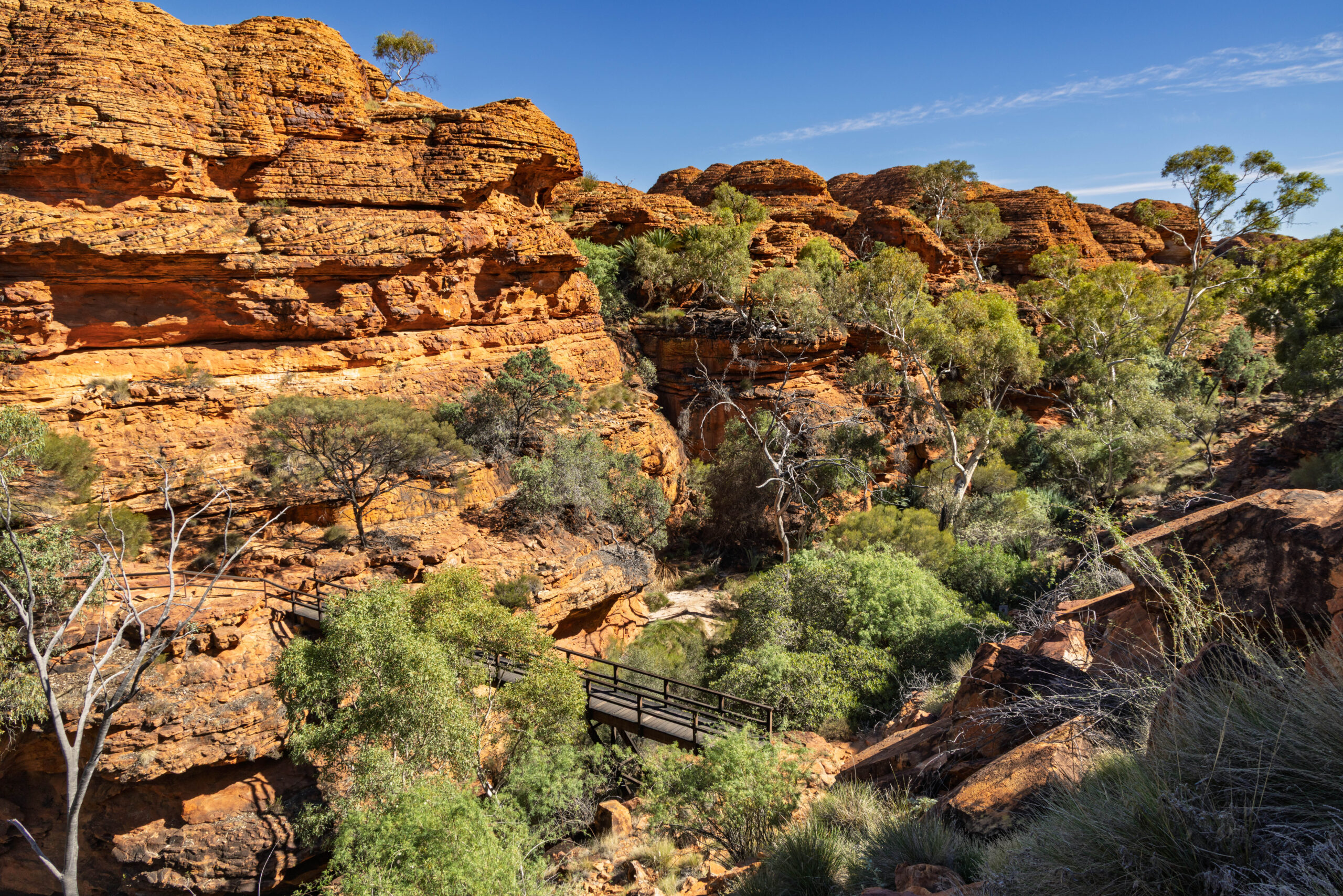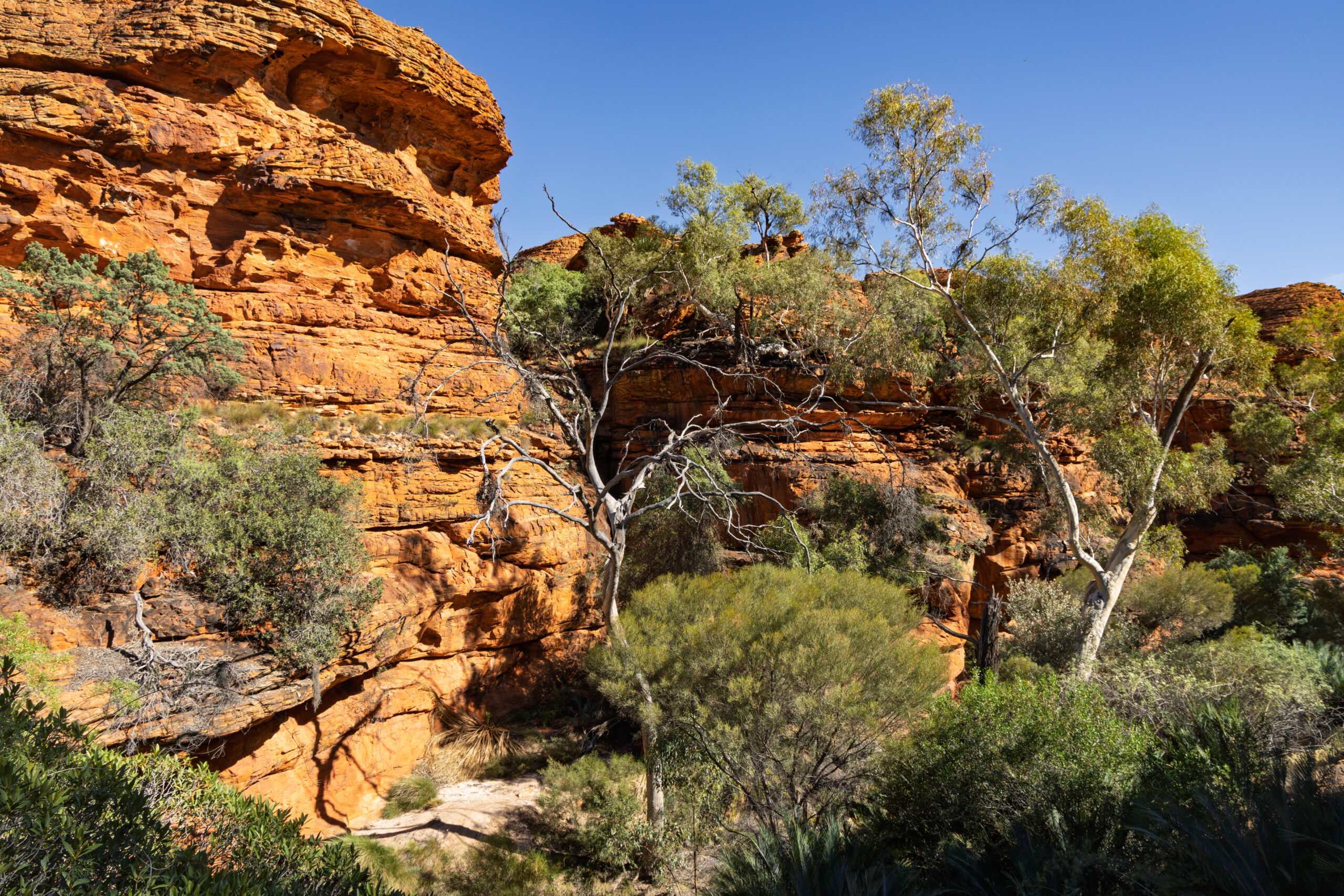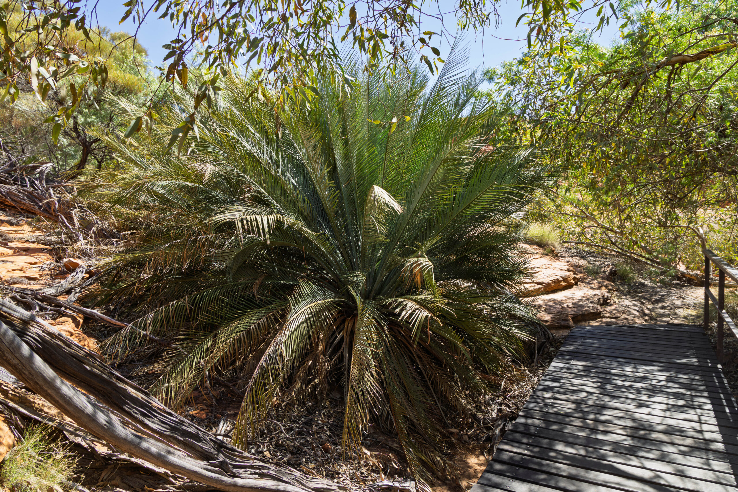 From the lookout we made our way back to the main trail. We both thought that the rim walk was all the way around the rim and we would not be descending until we were nearly back at the car park. Ahem, that would be a no! We had to cross Kings Creek. That involved climbing down some substantial timber stairs almost to the creek bed and then hauling ourselves back up again on more stairs. Before the final flight back to the rim we were presented with the option to descend into the Garden of Eden. We ummed and ahhed about whether to add another side trip. We had glimpsed the creek and its lush vegetation from the bridge across the creek, did we need to go down again to creek level?