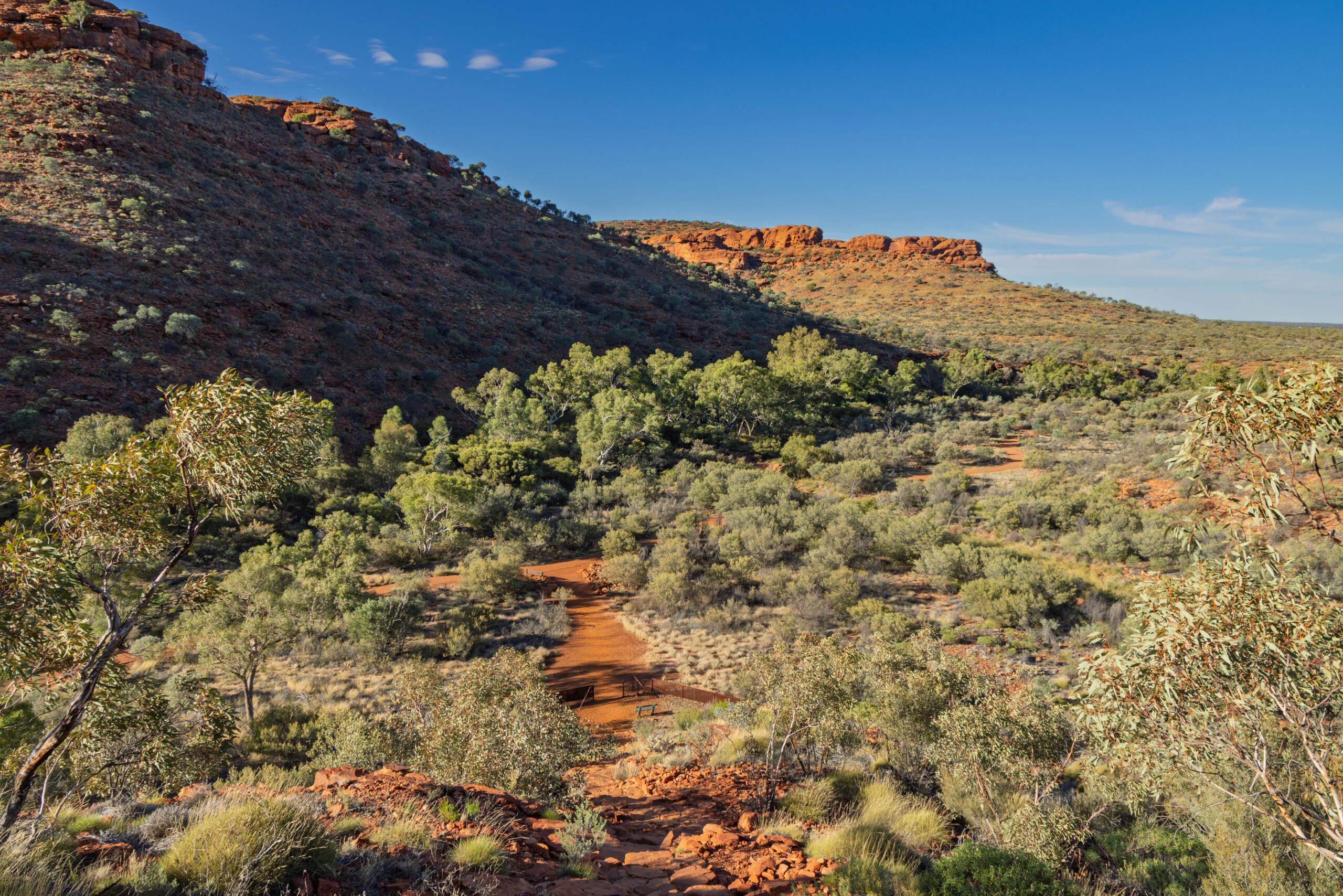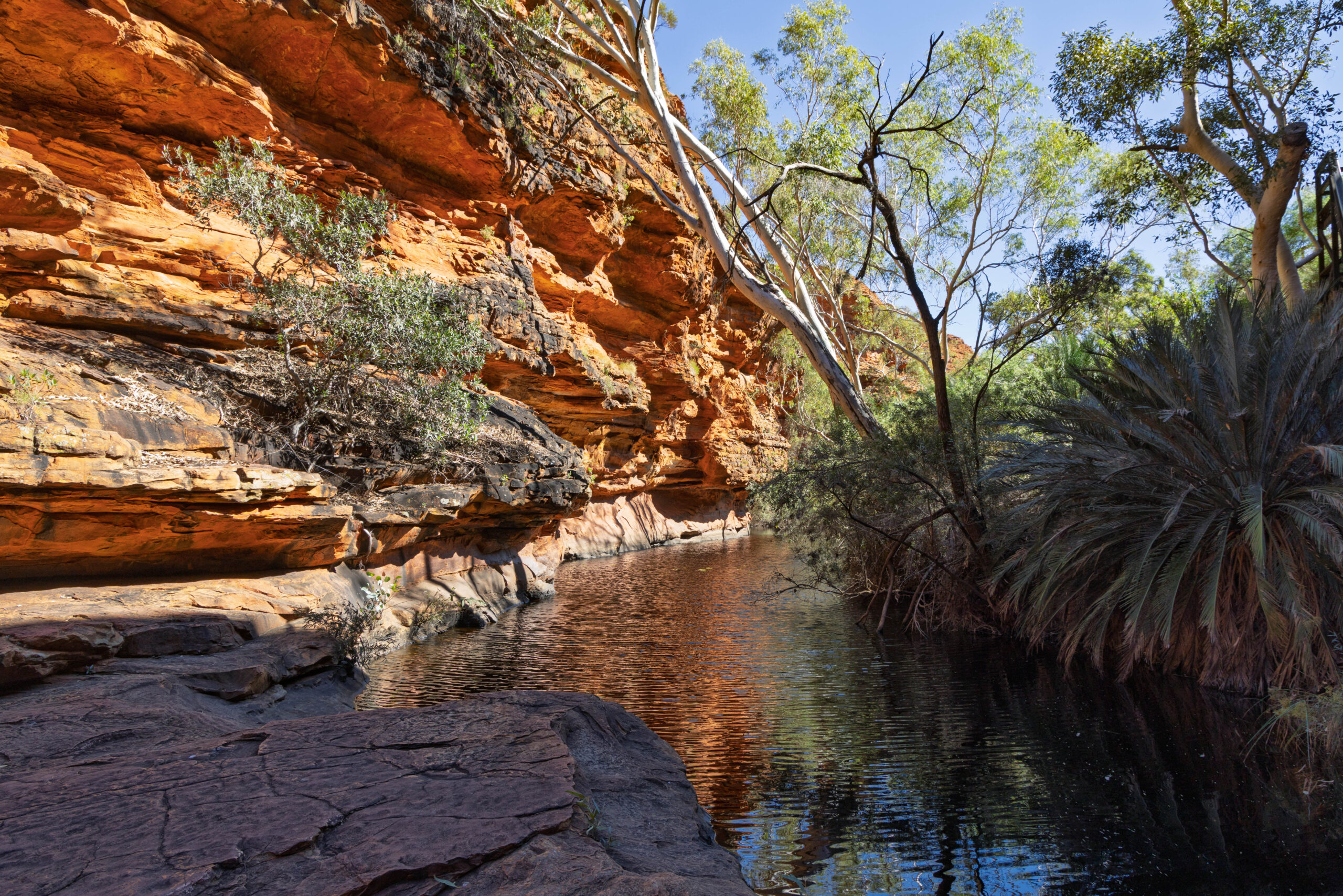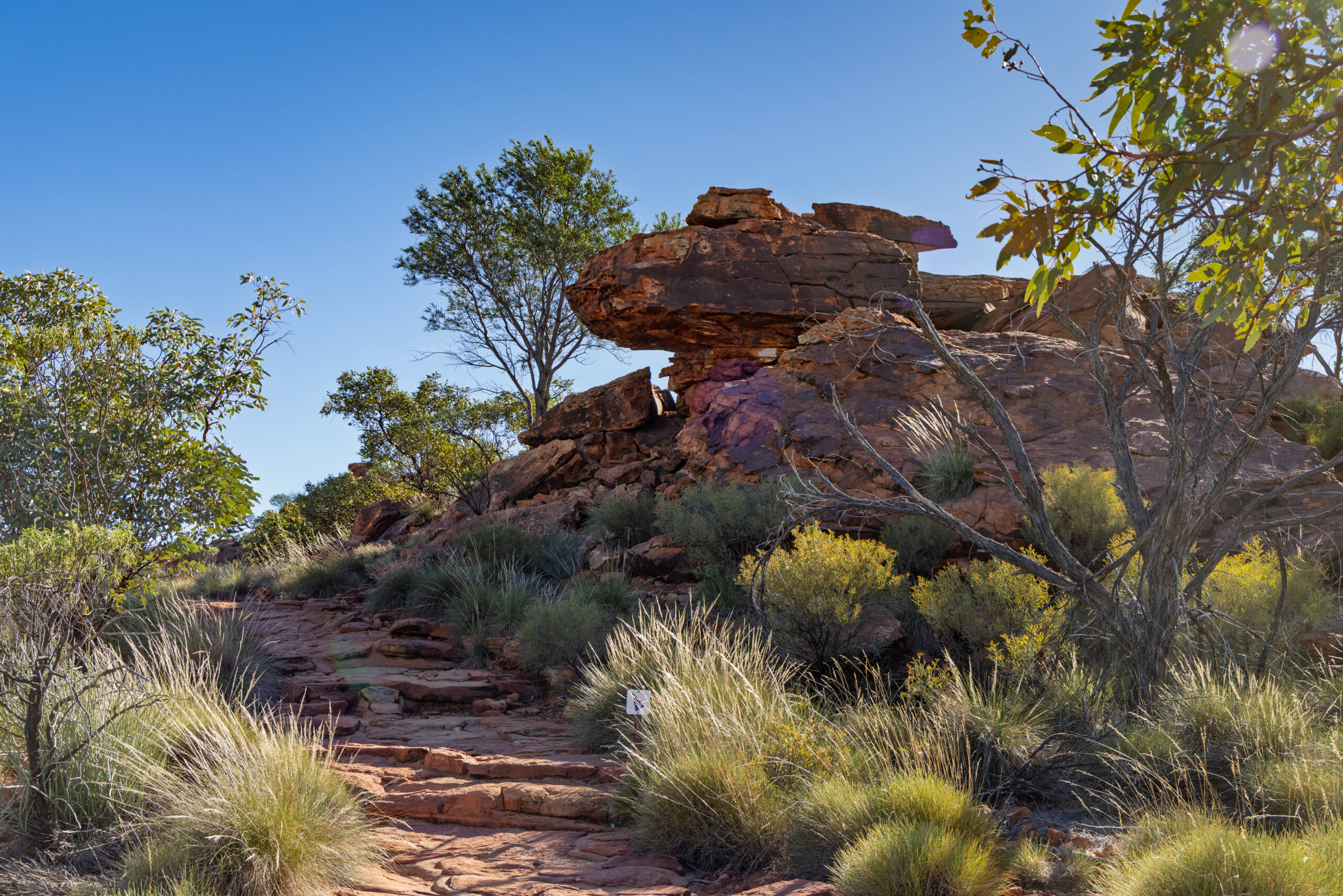From the lookout we made our way back to the main trail. We both thought that the rim walk was all the way around the rim and we would not be descending until we were nearly back at the car park. Ahem, that would be a no! We had to cross Kings Creek. That involved climbing down some substantial timber stairs almost to the creek bed and then hauling ourselves back up again on more stairs. Before the final flight back to the rim we were presented with the option to descend into the Garden of Eden. We ummed and ahhed about whether to add another side trip. We had glimpsed the creek and its lush vegetation from the bridge across the creek, did we need to go down again to creek level?