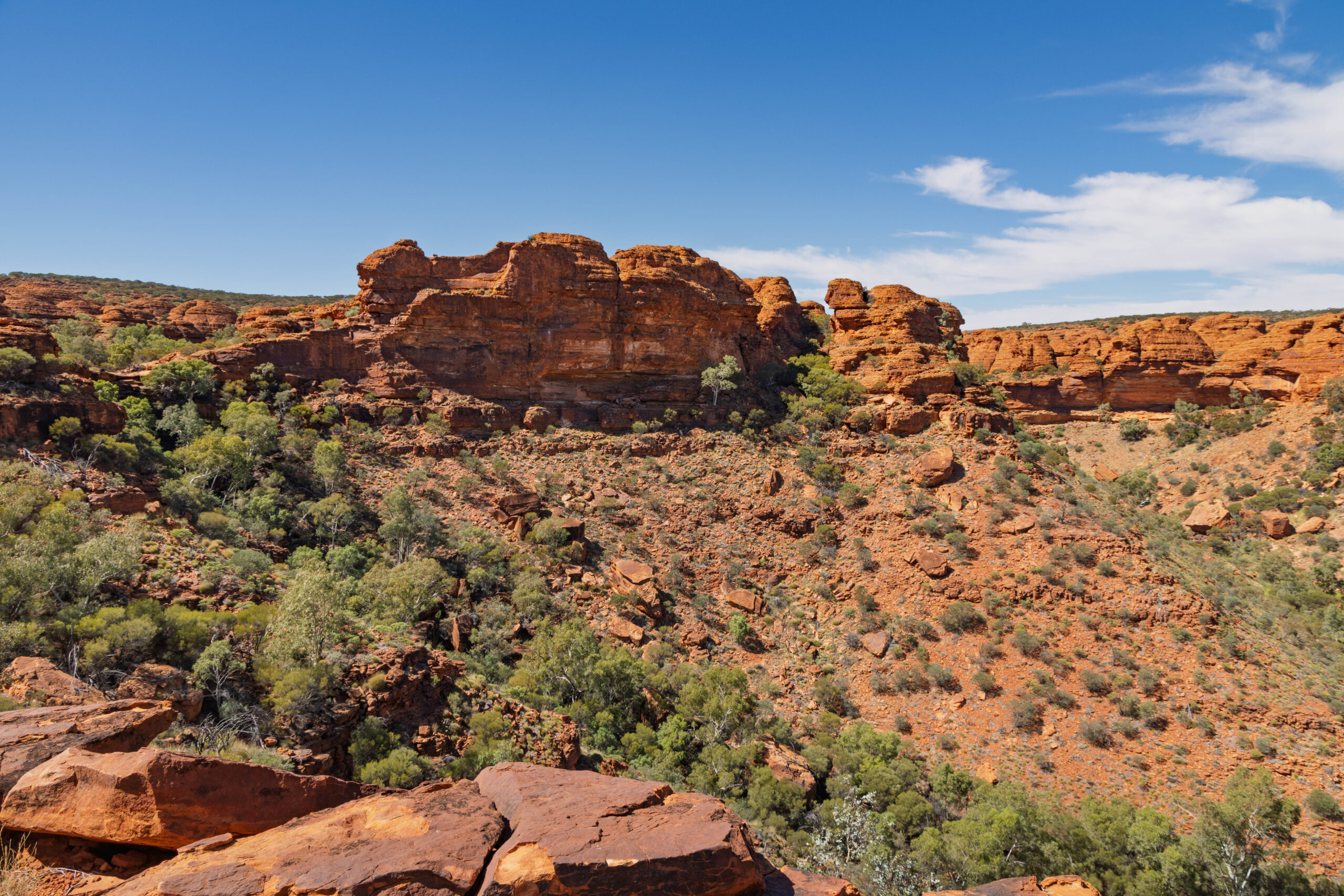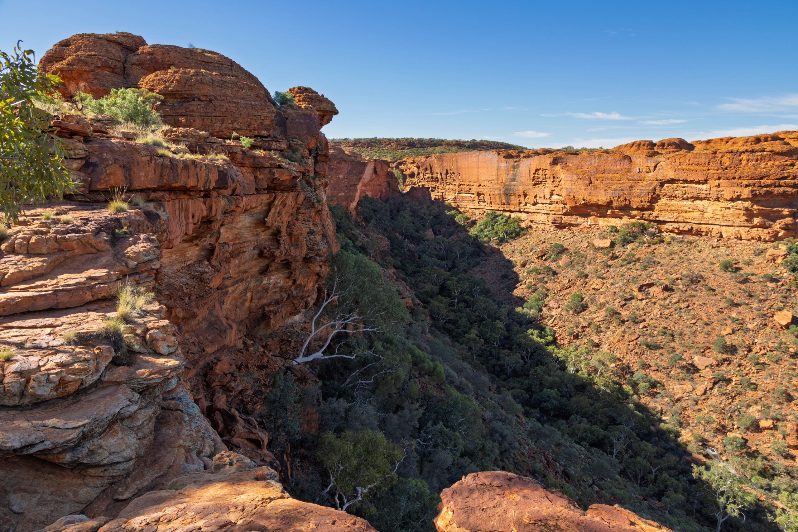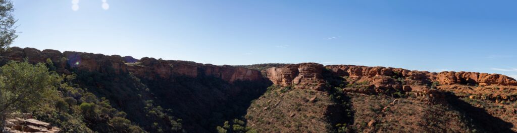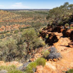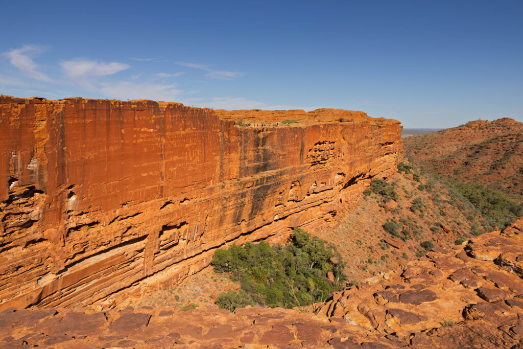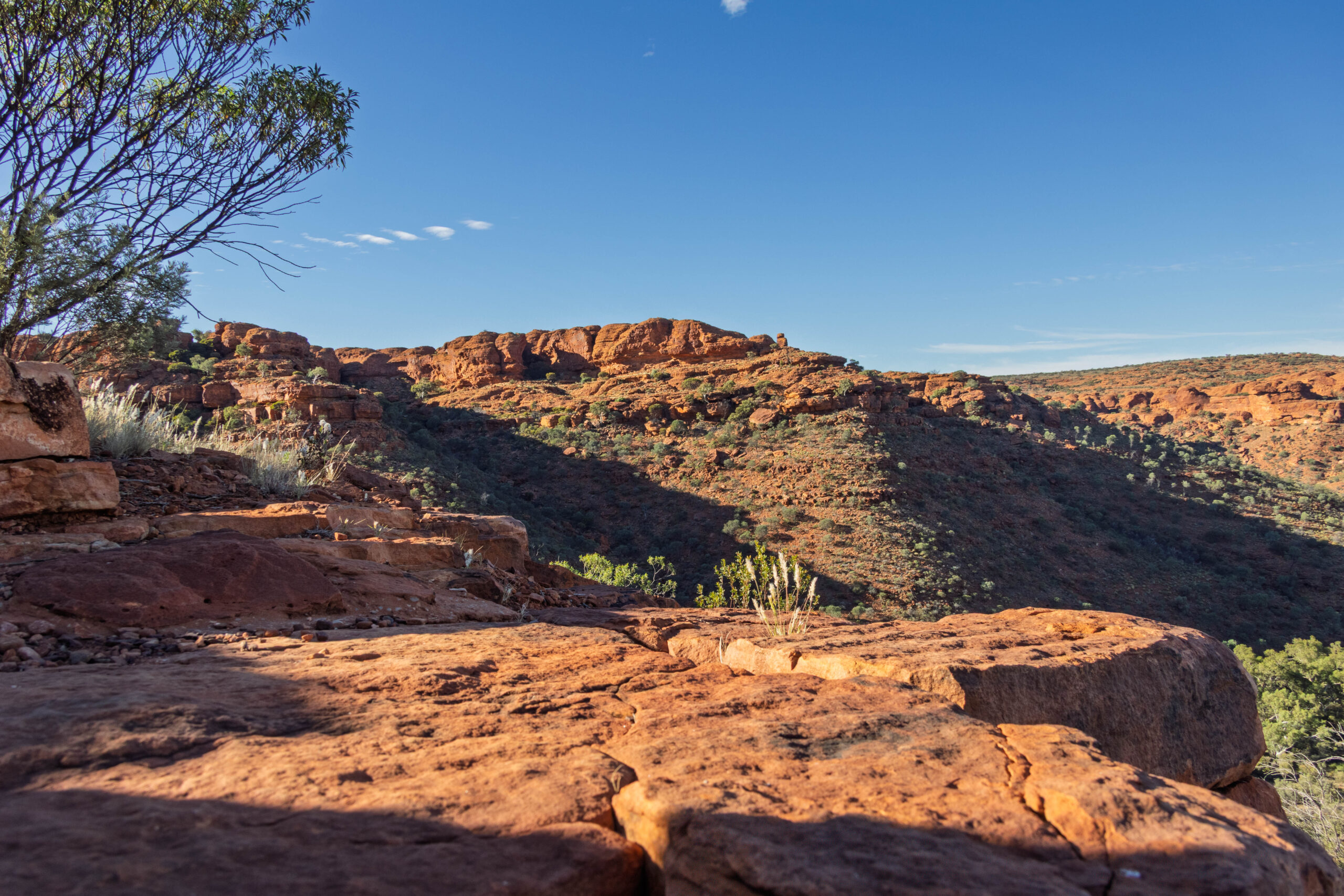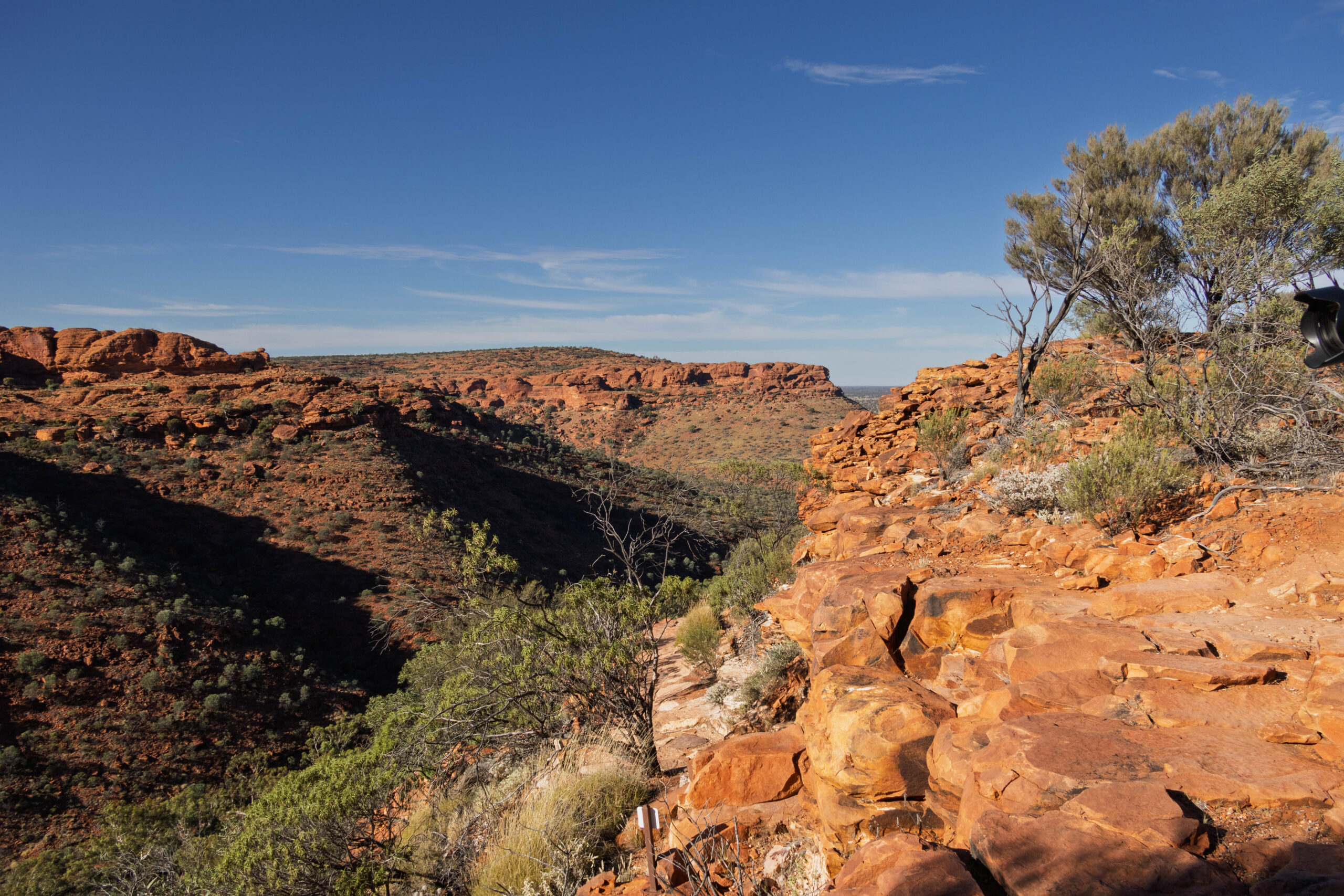 We reached a turn off for Cotterill’s Lookout that told us it was a 600 metres (return) side trip. As we peeled off the main path to walk out to the lookout we wondered if this 600 metres was included in the six kilometres or if we were adding more steps to our perambulation around the rim?? The detour did require some rock scrambling but it was worth it for the panoramic vista of the canyon, particularly the sheer south wall of the canyon opposite.