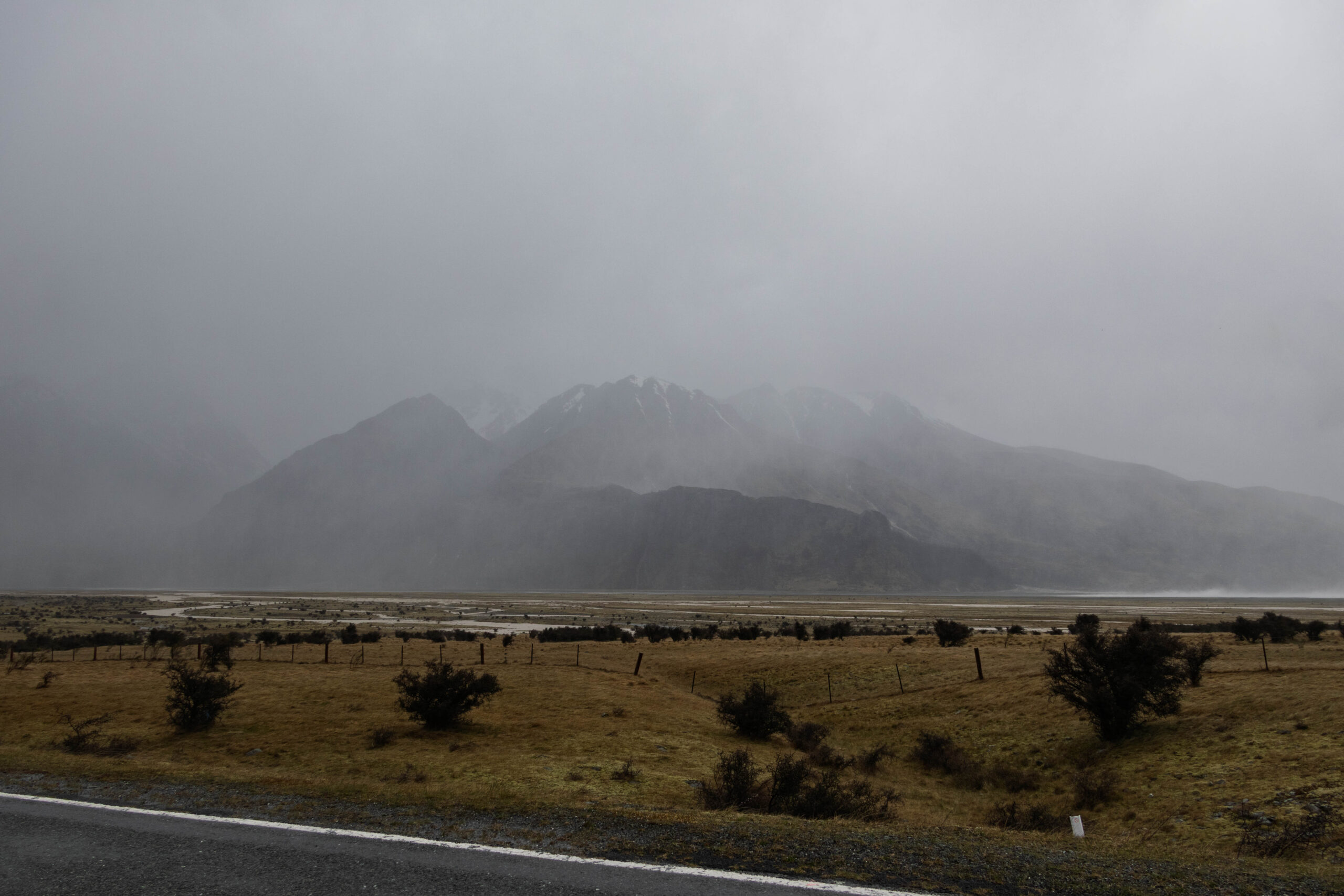 Bernie decided if the Suzuki Swift could do it, the Ford Focus could. Bernie entered the water and … we made it across without being washed off the road. No-one else followed us! We safely negotiated the second patch of water and continued towards Mount Cook Village. We reached the head of the lake and now found ourselves driving alongside the Tasman Delta where the braided channels of the Tasman River meander their way to the lake. This broad, flat valley was where the wind kicked in. So windy that it was raining horizontally! Anyone in a motorhome would be struggling.