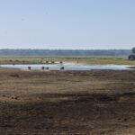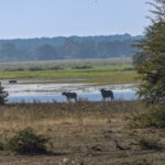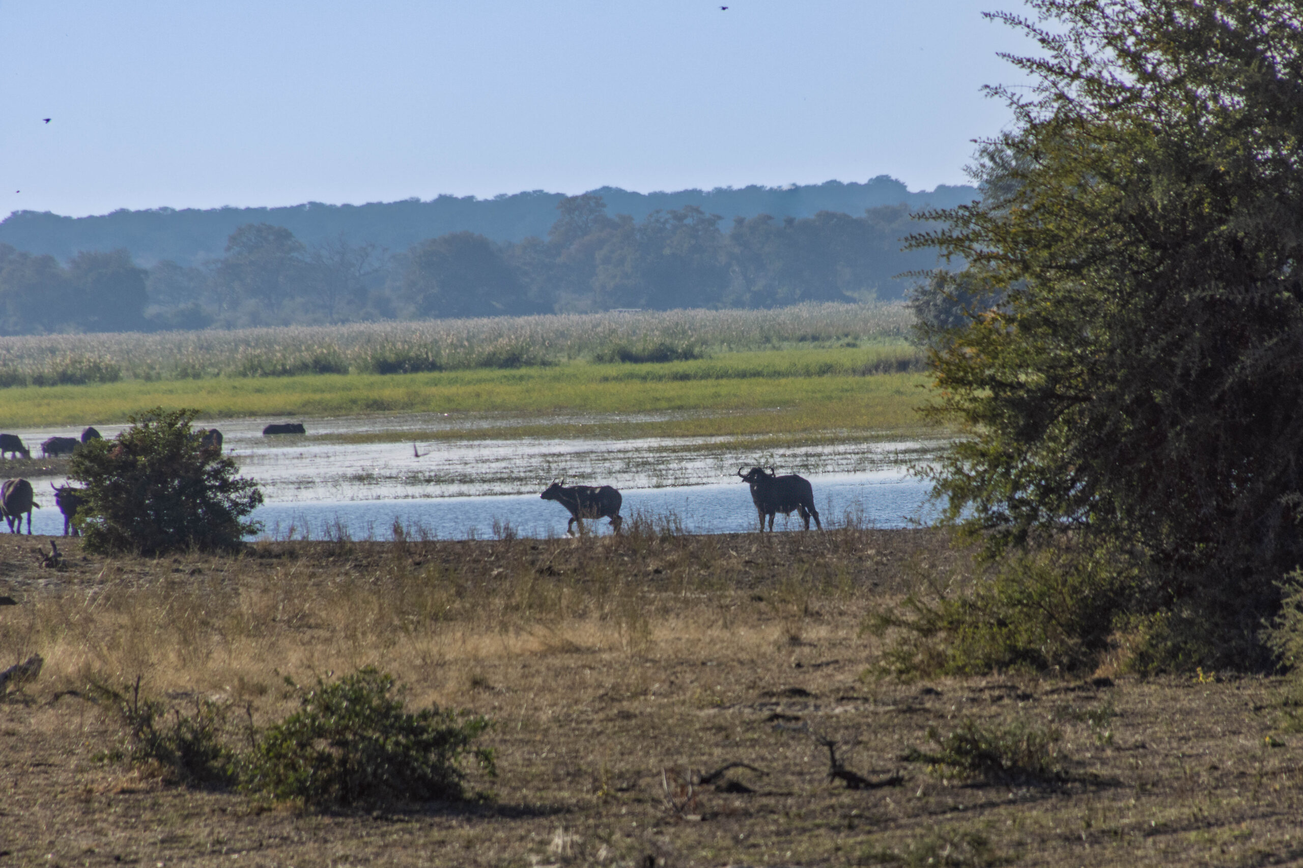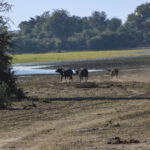 Travelling south on the C48, we were soon back at the gate for the Mahango Core Area, that we visited yesterday, where Wian collected a permit that would allow us to drive through the park to the Botswana border. As we drove through the park we were treated to an informal game drive with giraffes on the road. Wian stopped to show us some leaves that had been left on the road by elephants and told us how to tell when the elephants may have passed. The leaves were wilted but not dry so, during the night was his guess. We came to a waterhole where we, once again, could see cape buffalo, but only in the distance. The buffalo continue to be a bit elusive. Our last game sighting before the border was of a herd of elephants crossing the road. Pretty good game sightings from the main road!
