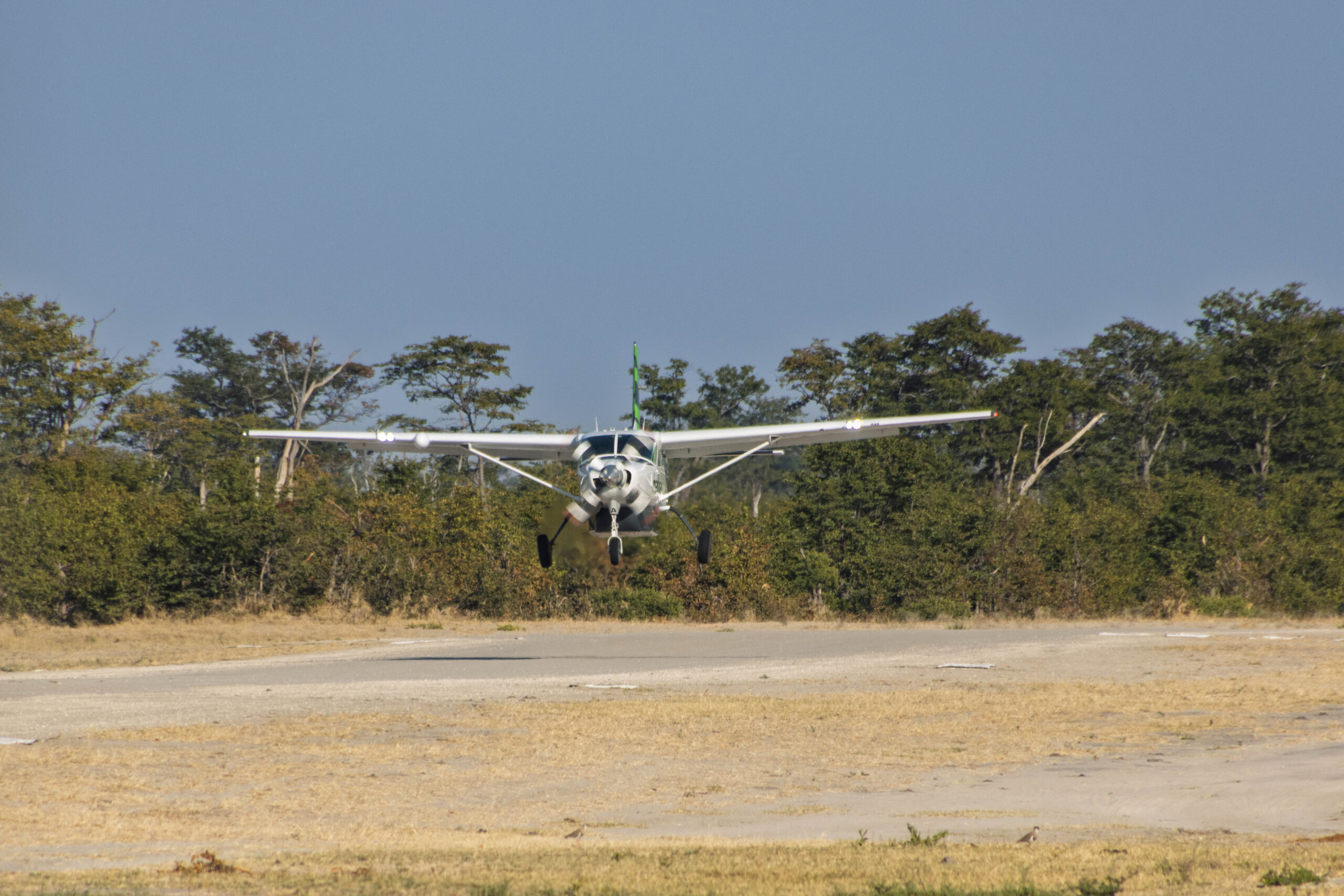 Arriving at the airport, Solomon drove part way along the runway checking for any wildlife or obstructions. There was a shovel in the back of the truck to shovel elephant poo off the runway if necessary, but it was all clear. Soon, Solomon and Wian were saying that they could hear the light plane coming. Ahem, younger ears and better hearing than the rest of us! Before long though, we could see the plane, which did a flyover, checking the runway and watching for any signal from Solomon that there was a problem. The pilot touched down lightly and taxied to the end of the runway.