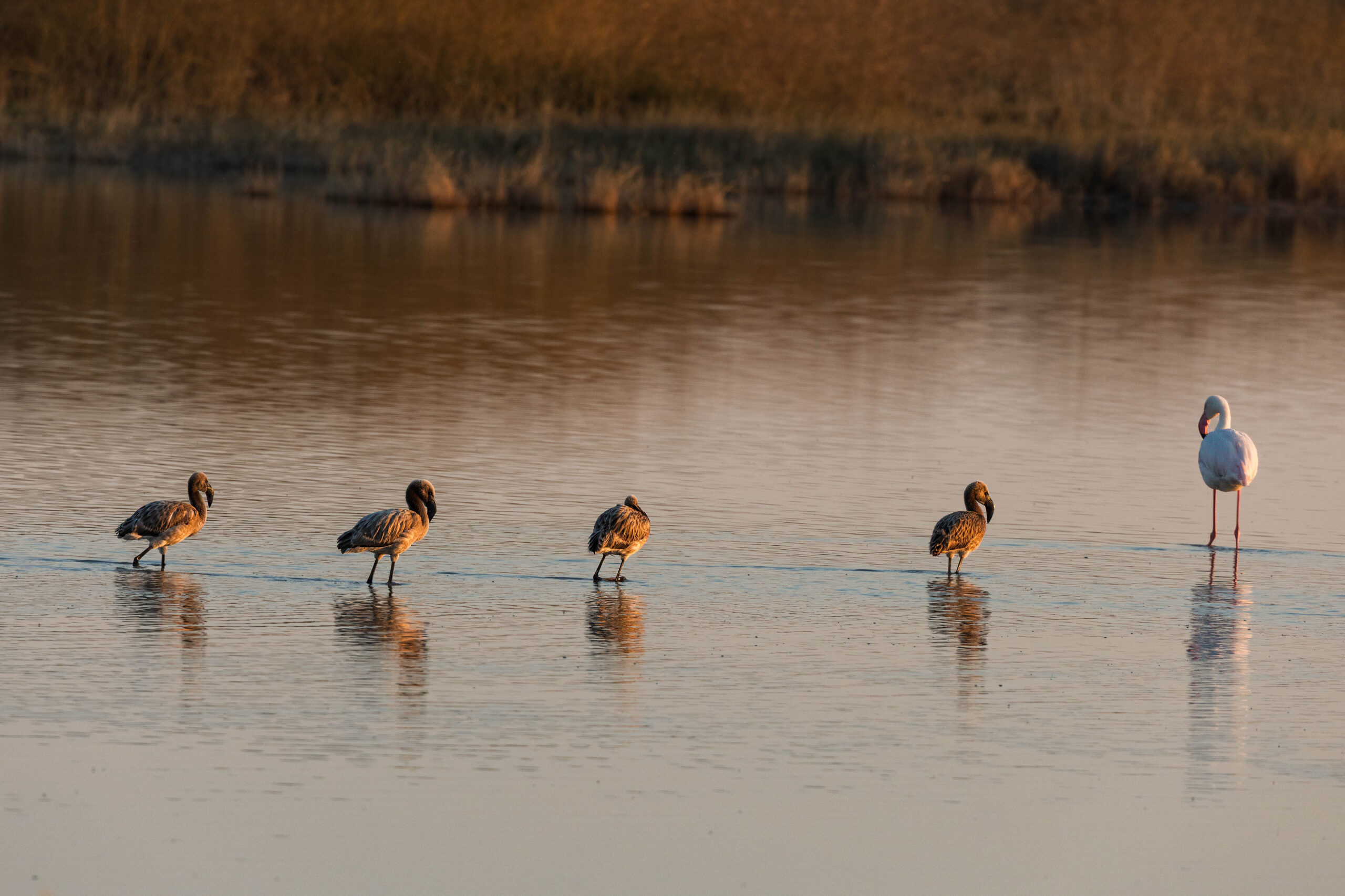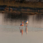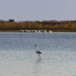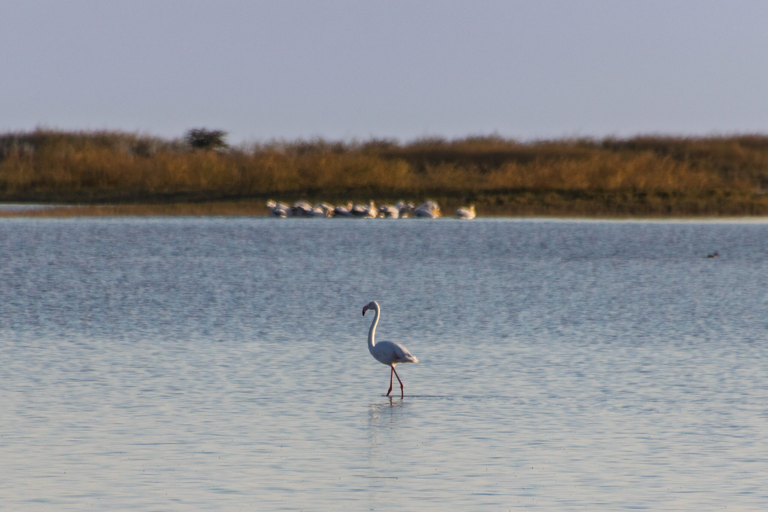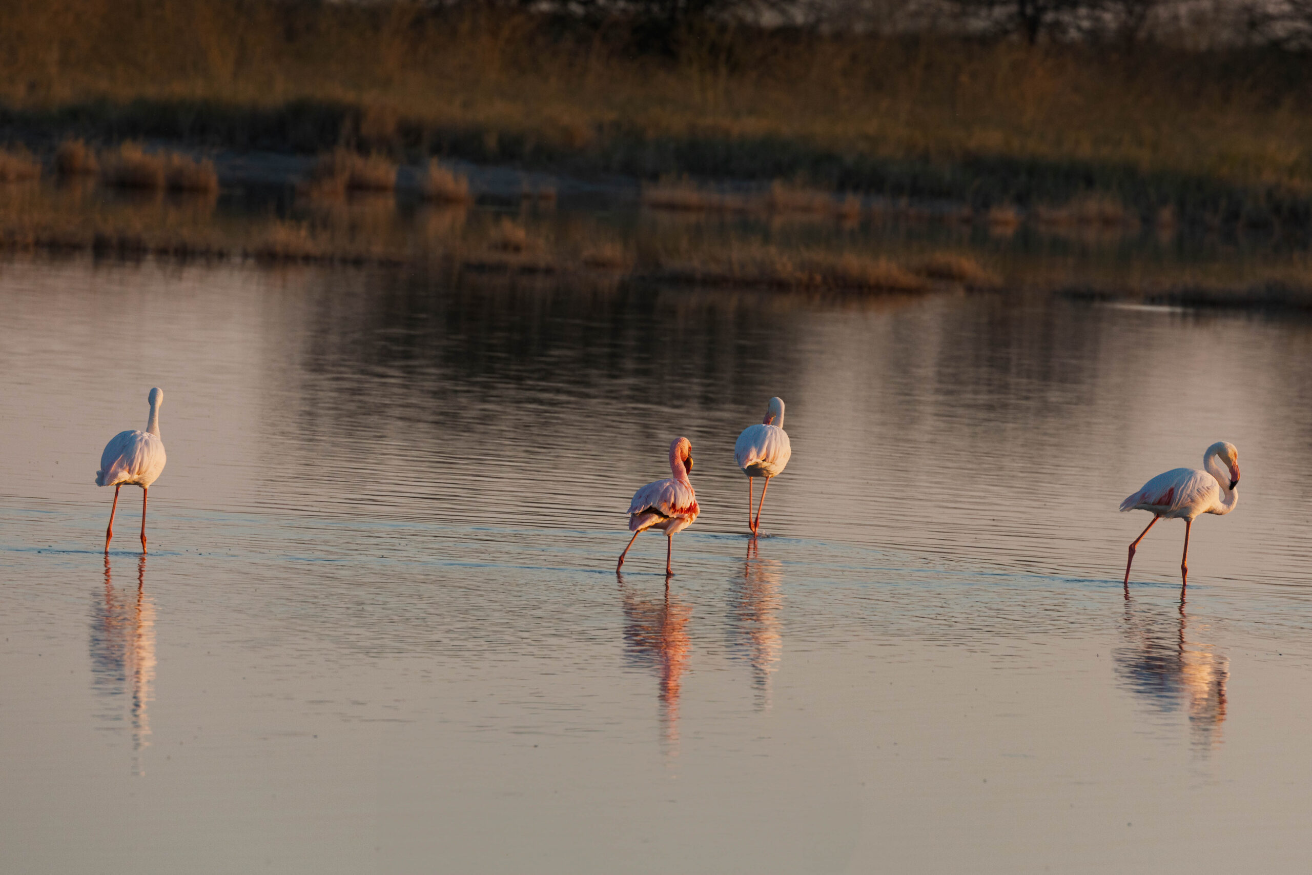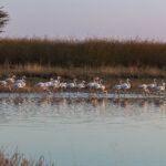We drove to an area filled with water, where we found flamingoes with their chicks. After plentiful rain this year, flamingoes are breeding here, after arriving from the coast of Namibia about a month ago. Most of the birds that we saw were the greater flamingo which tend to be more white, with one, lone, pink lesser flamingo amongst them. The immature greater flamingos were still grey at the moment. We also saw a flock of great white pelicans … in the distance.
