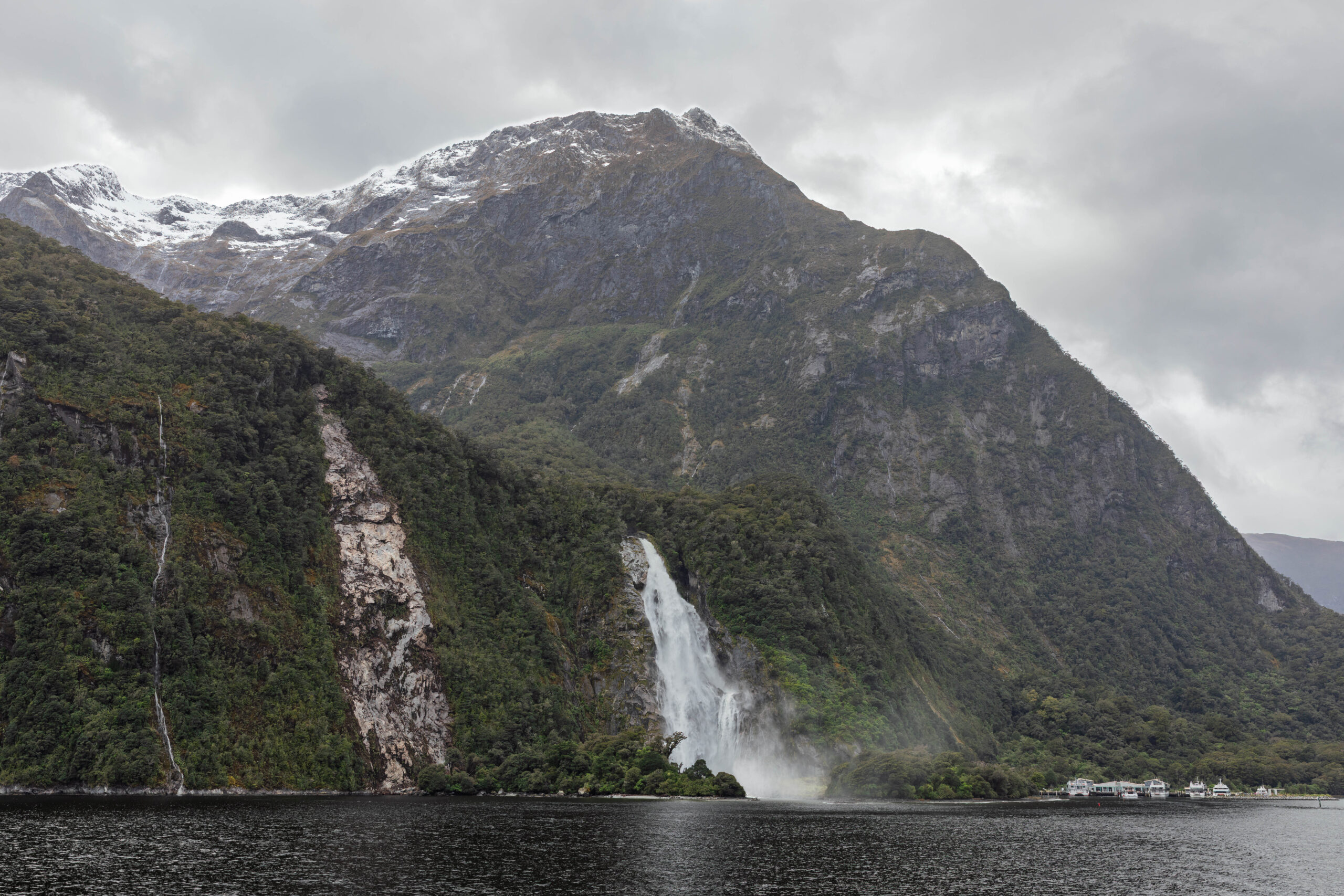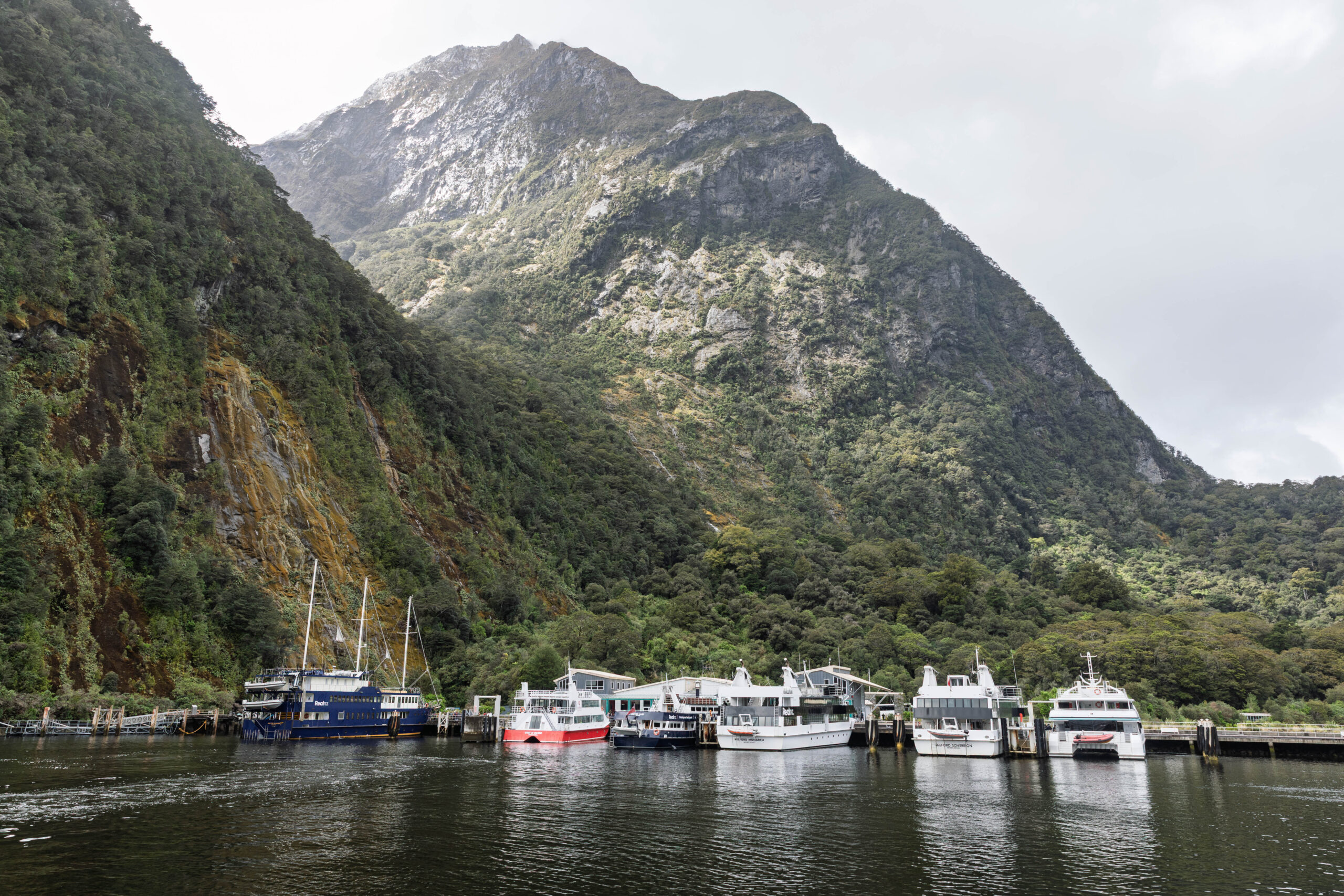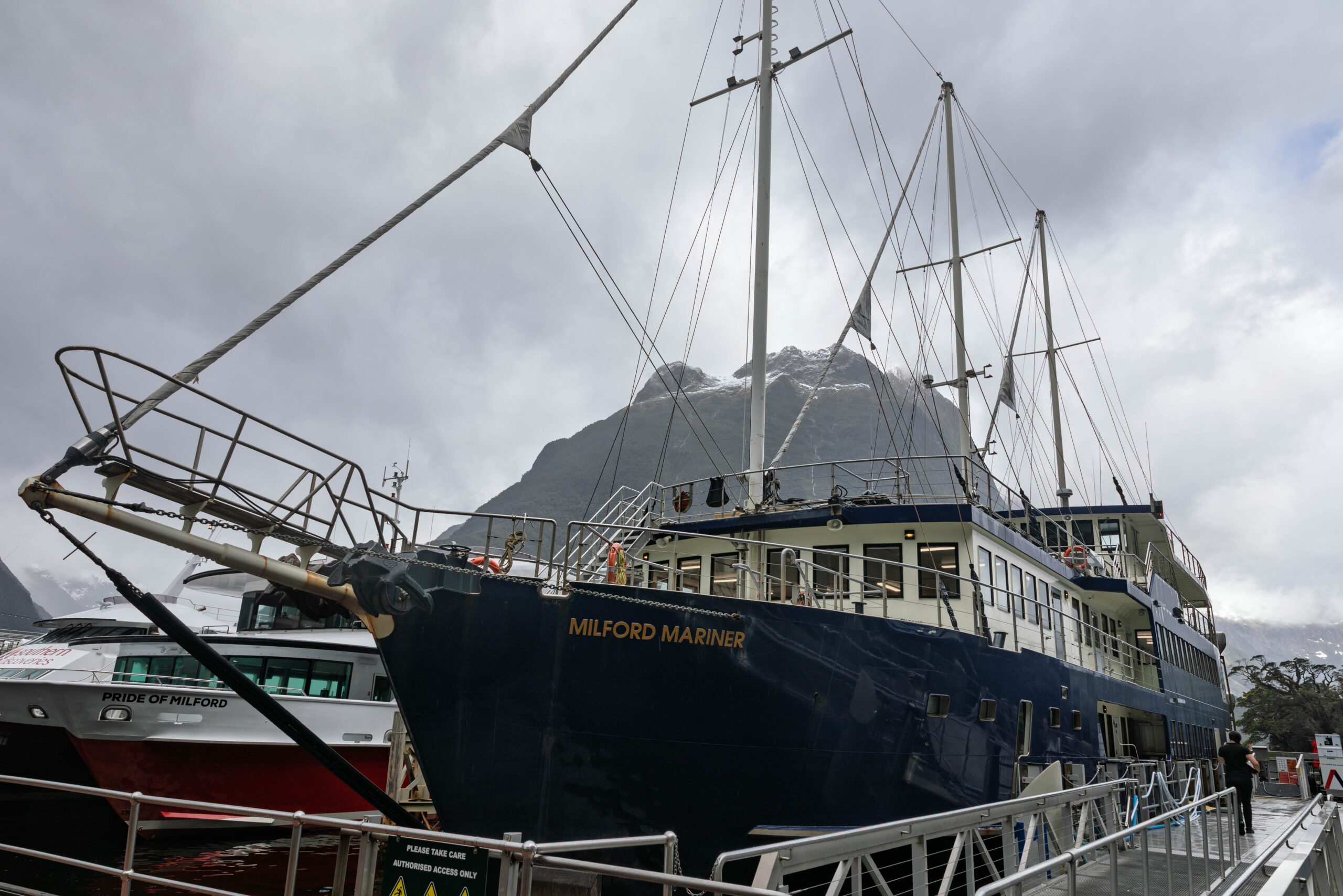 We walked to the terminal and checked in at 10.00am for our 10.30am cruise. There’s that half hour buffer again. Having half and hour to fill is OK if the weather is fine, but it’s a bit tedious on a wet morning. Never mind, we walked over to the waterfall at the side of the coach parking area and then headed onto the harbour to photograph our boat, the Milford Mariner … with masts! When we started boarding, the people behind us asked if the sails would be used today. Not today, was the response. When we arrived up on deck, where we were closer to the sails, we decided that the wrapped up sails might be more for show than actual use??
