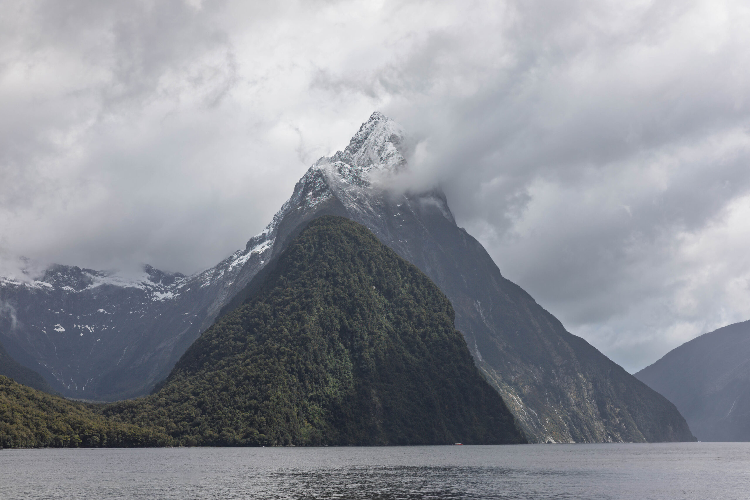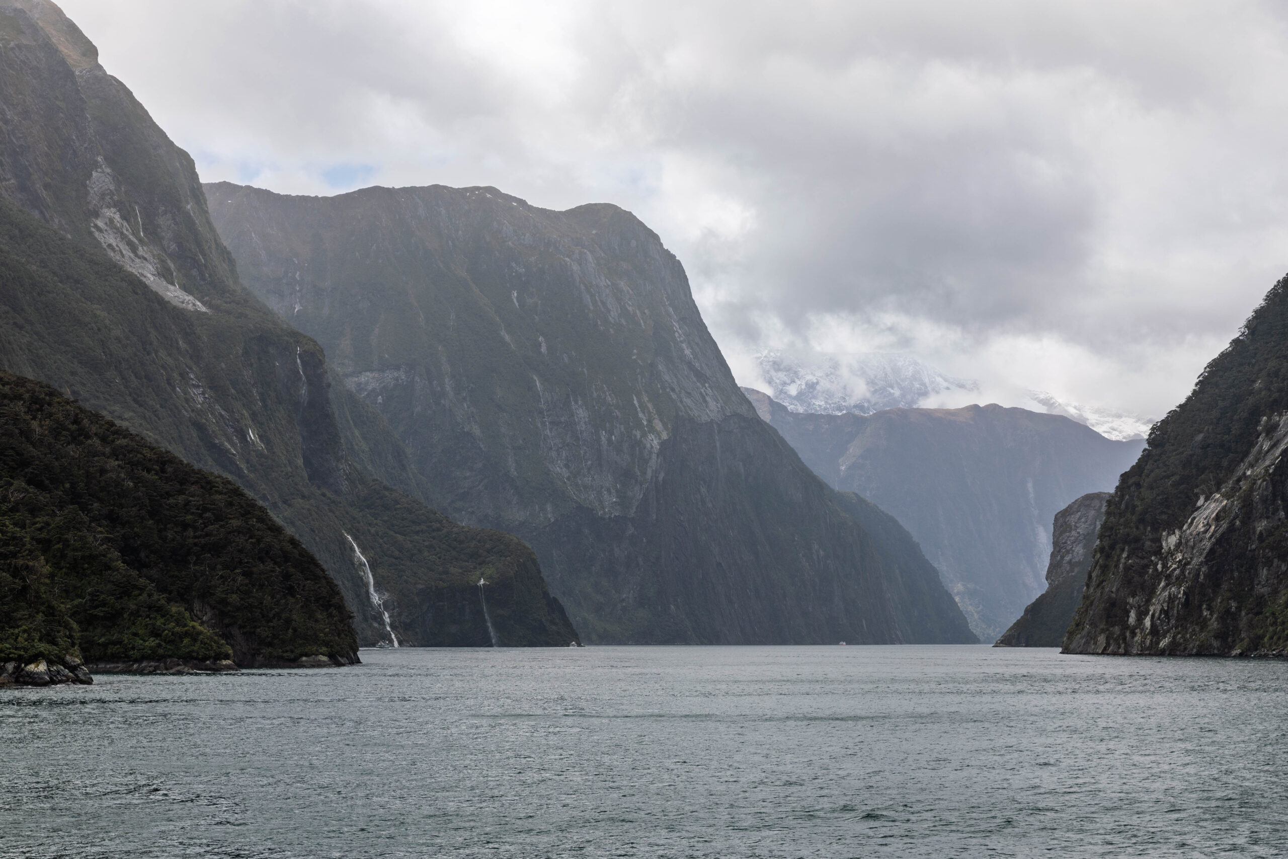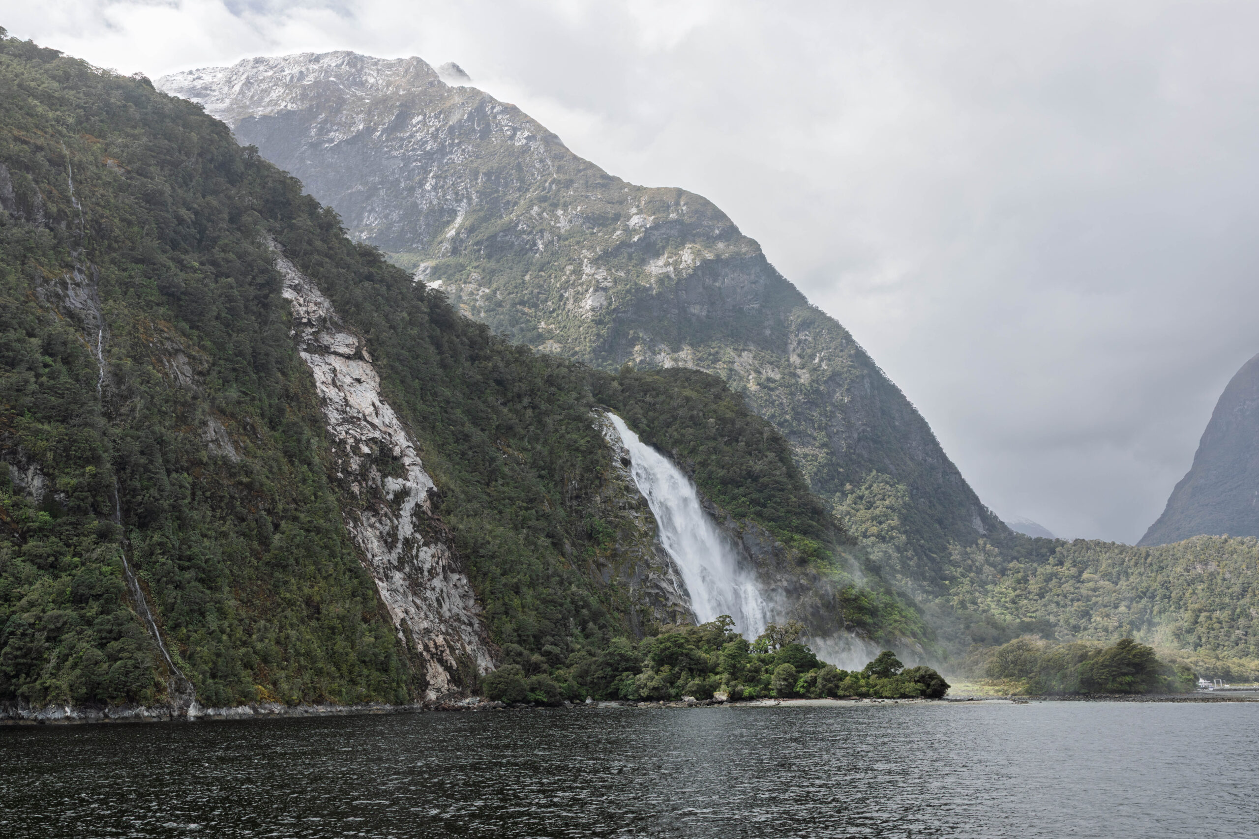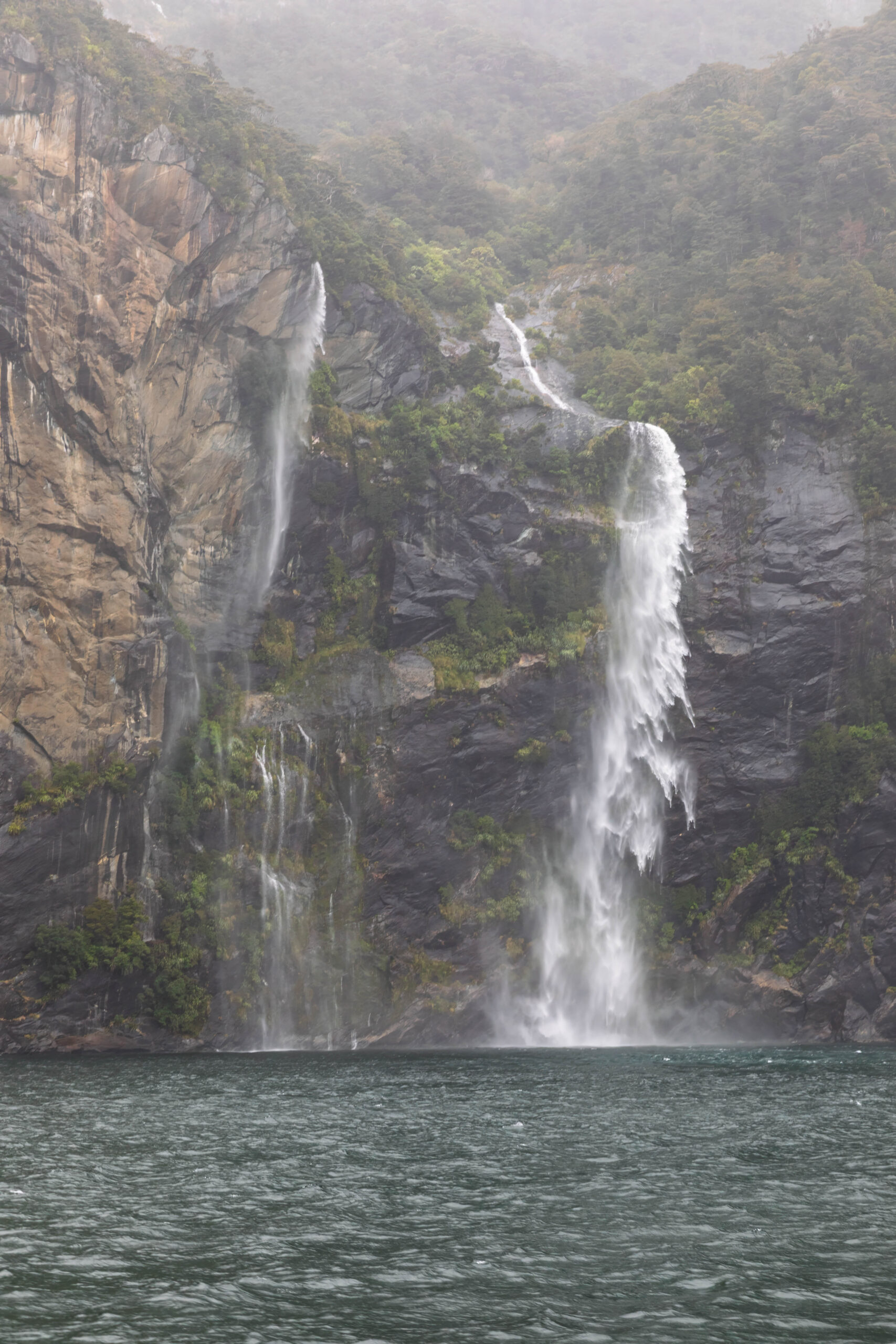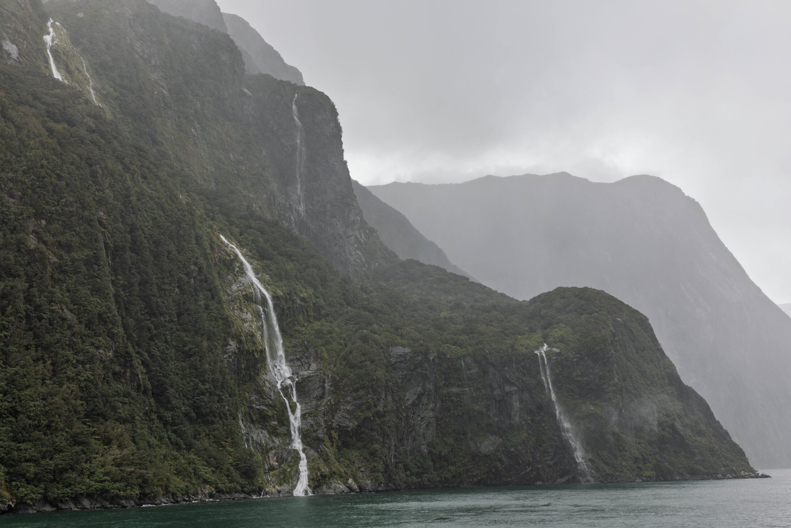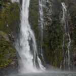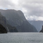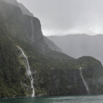 As we headed out of the harbour, our first sight of the morning was of the permanent waterfall, the Lady Elizabeth Bowen Falls. With a fall of 162 metres, Bowen Falls is also Milford’s highest waterfall. Our outbound journey took us along the left hand (southern) side of the sound. Again, on a wet day, we were treated to hundreds of waterfalls, not just the few that fall all year around. We soon passed a group of four identically sized waterfalls, lined up along a mountainside, that are known as the Four Sisters. A plus of visiting in the wet, as these falls only appear during Milford’s rainy days.