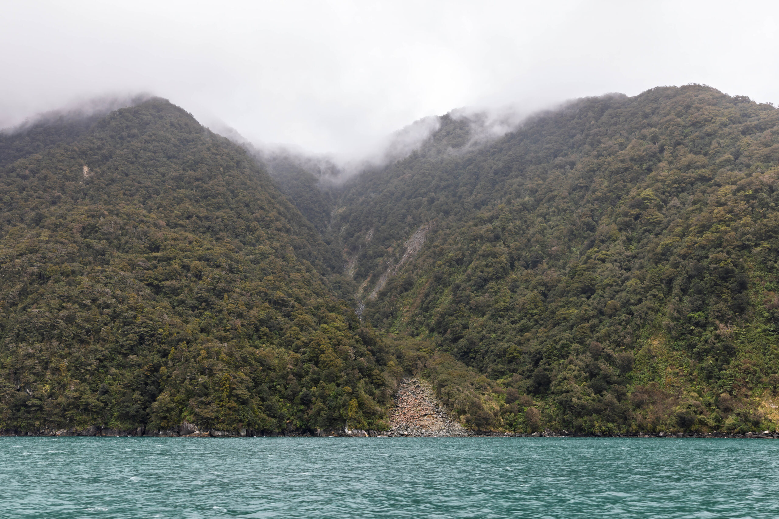 At about the half way mark of our cruise, the Captain showed us the glacial valley that meets the sound at its shallowest point. He told us that the rocks along the shoreline here were deposited as the glacier met the warm Tasman Sea and deposited the rocks it was carrying as it melted.