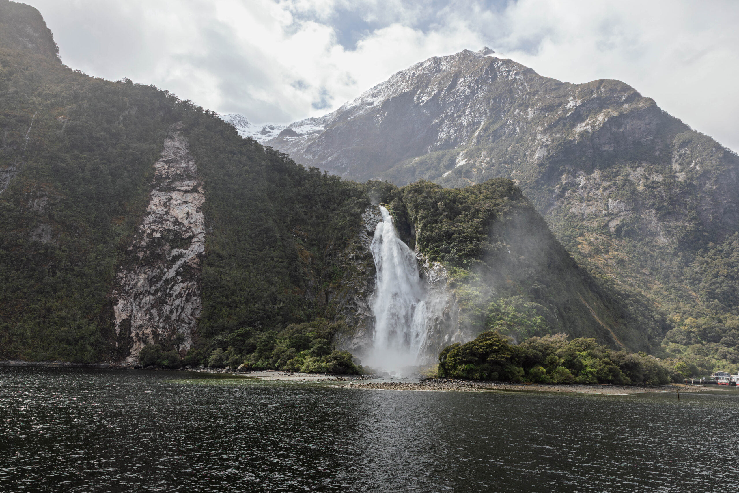 We were told that there is a colony of NZ fur seals opposite St Anne Point but we didn’t see – or smell – any out there today. Apparently when the wind blows a certain way it can be a bit stinky. Inside the sound again, we pulled alongside Seal Rock, where seals also like to haul out but, there were none there today. Our next stop was at another permanent waterfall, Stirling Falls. Our Captain encouraged us out onto the front deck, telling us that legend has it that if the mist from the waterfall falls on your face, you will wake up the next morning looking 10 years younger. Yes, please!