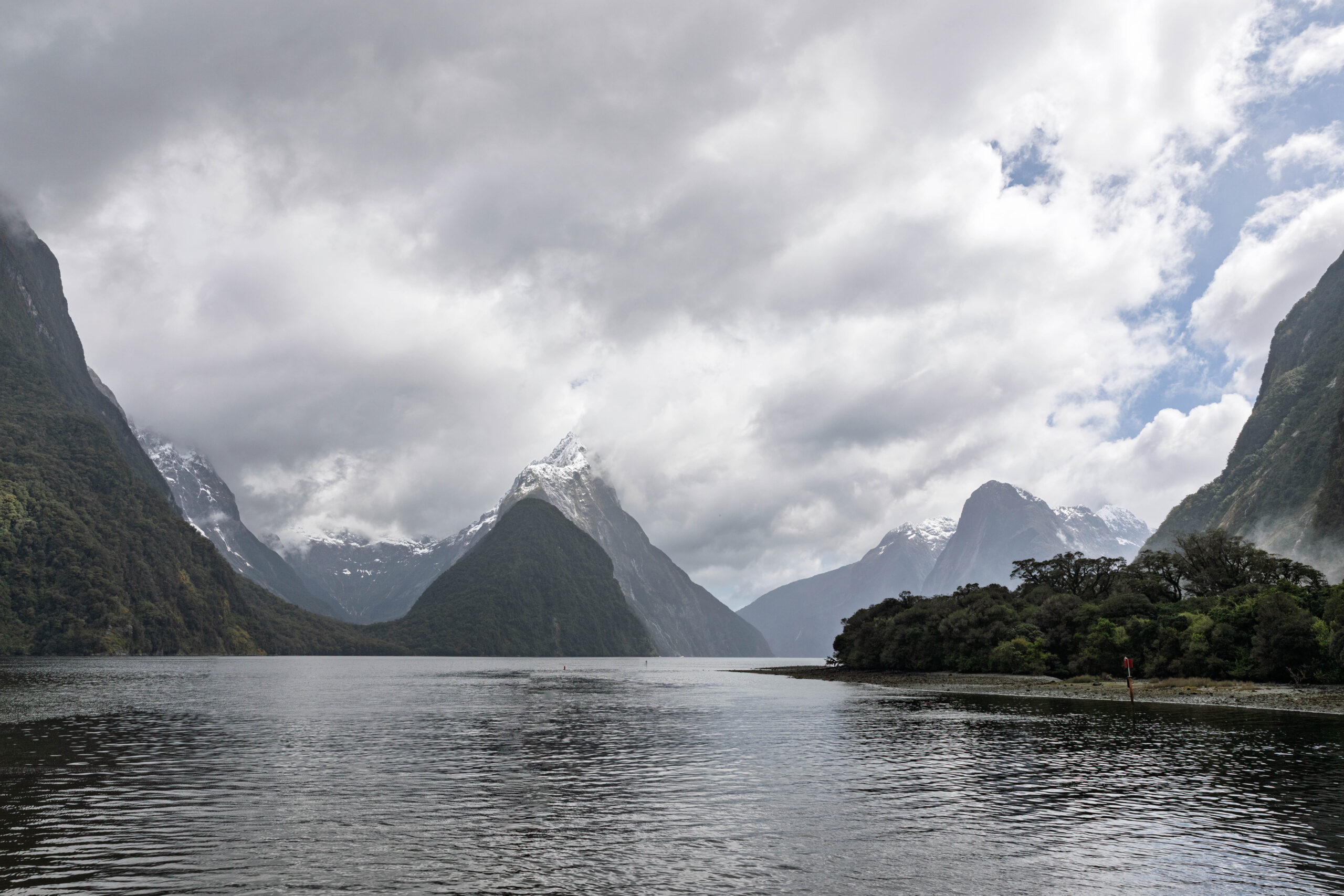 The weather had been improving since we disembarked, so we headed out the Breakwater Walkway to photograph Mitre Peak. From the harbour we walked around to the Milford Sound Cafe. As we walked past the car park we saw a couple of keas atop a car pecking at the roof rails. They had quite an audience photographing them. Arriving in the café we enjoyed a delicious lunch of toasted smoked chicken and pesto rolls – the bread/roll had a fancier name but I can’t recall it. I take back everything I have ever said about restaurants/cafés with a view not really trying with their food offerings.